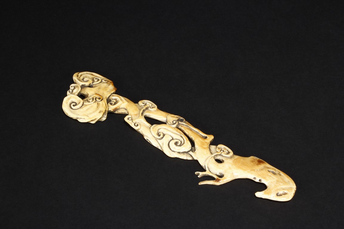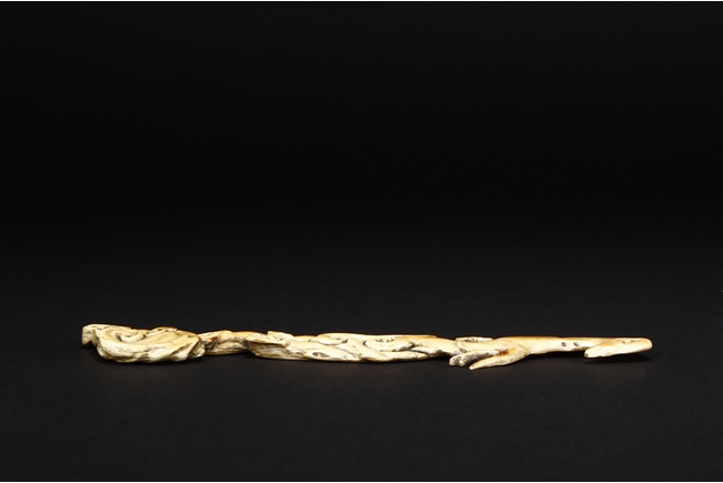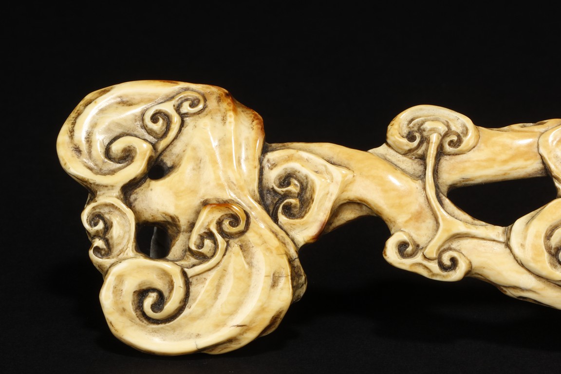 The ivory intricately carved into a naturalistic shape of a lingzhi branch, grown with many lingzhi on the side, tip, and the top, the ivory showing age related deepening yellow, cracks, and patina, mounted into a later fitted wooden stand. Qing Dynasty period.
