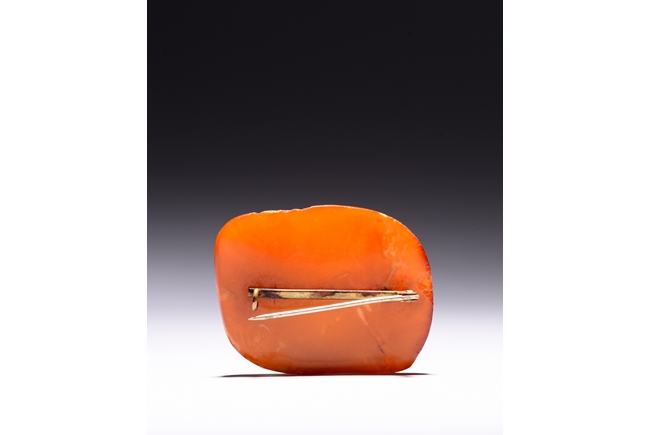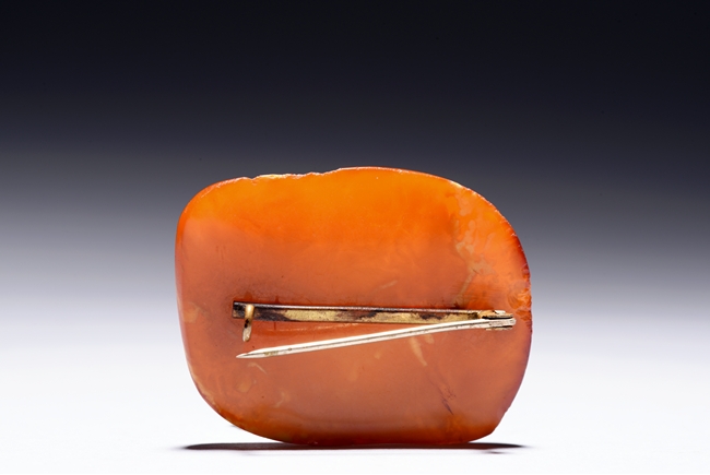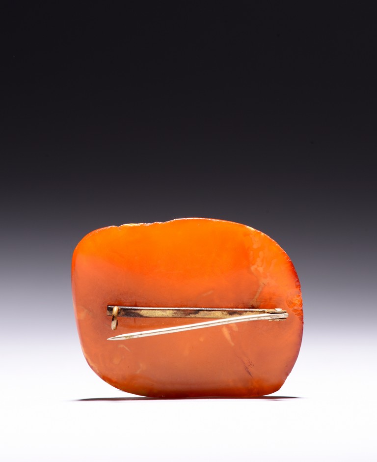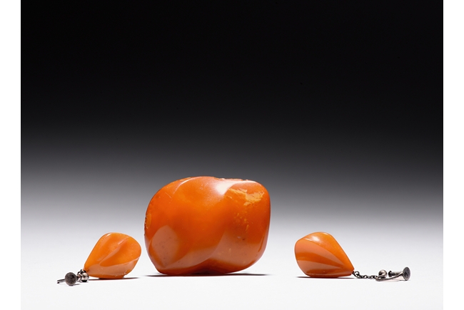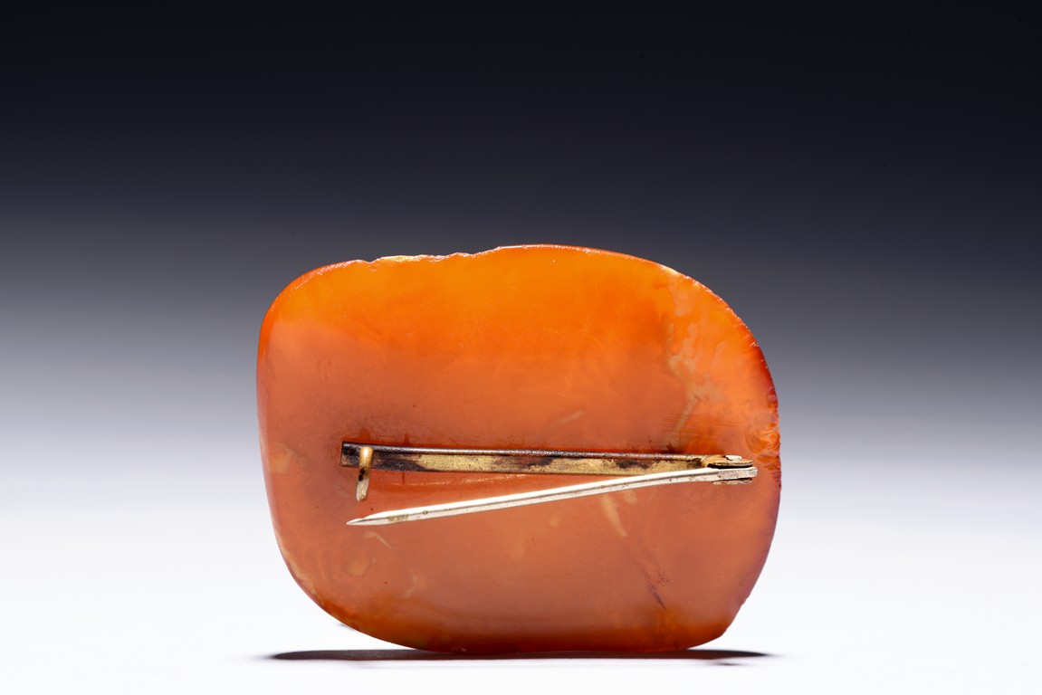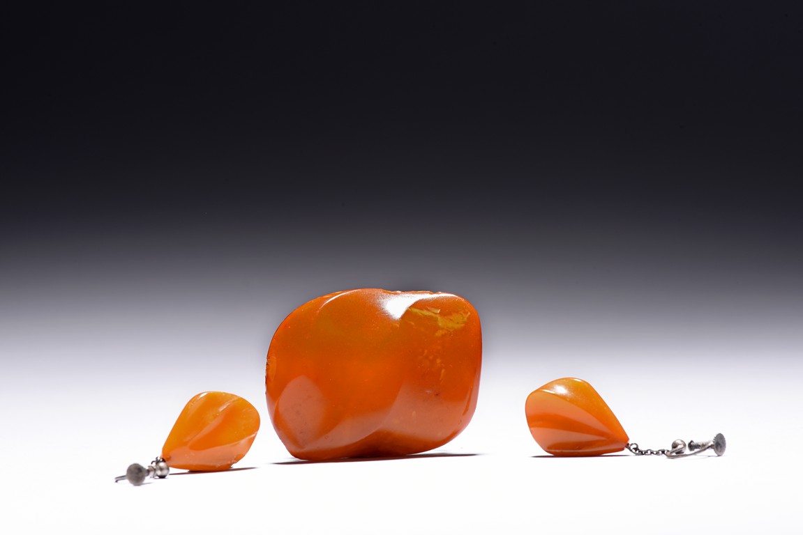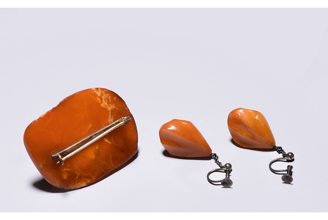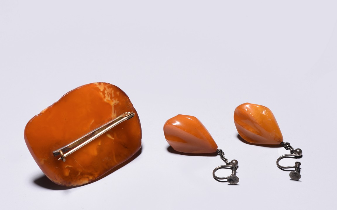 Composed of three naturalistic amber earring pendants and brooch, of attractive caramel tone with good translucency. Qing Dynasty period.