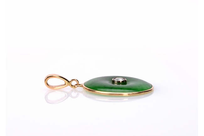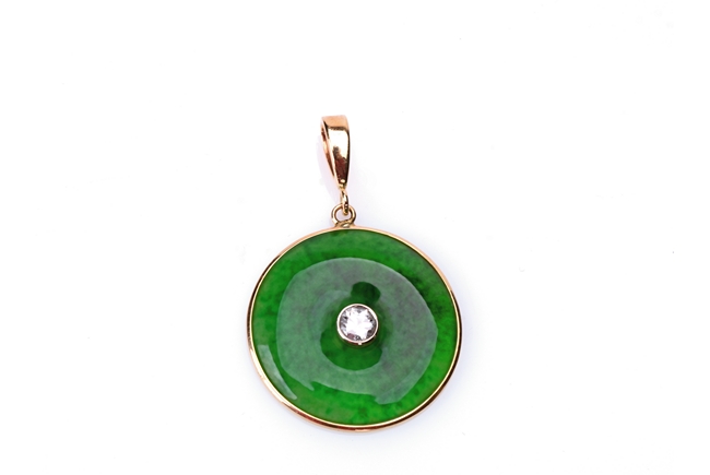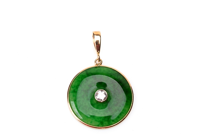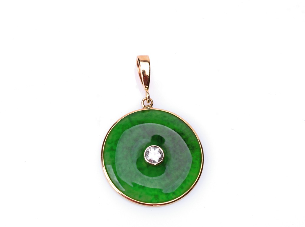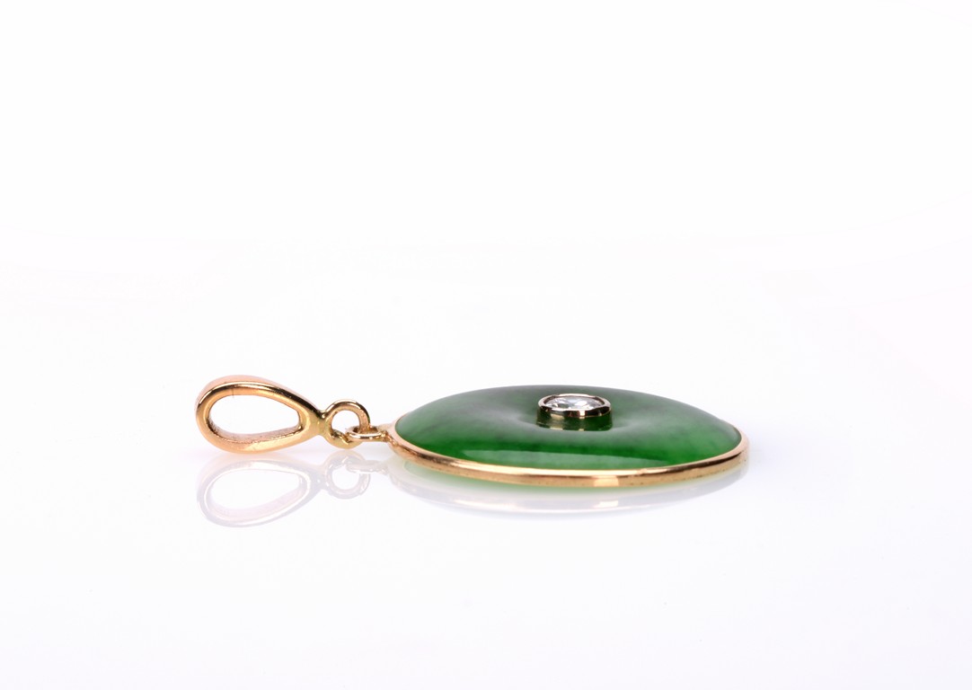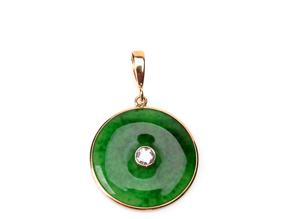Carved as a disc pendant and set with a diamond to the center, all mounted in gold.