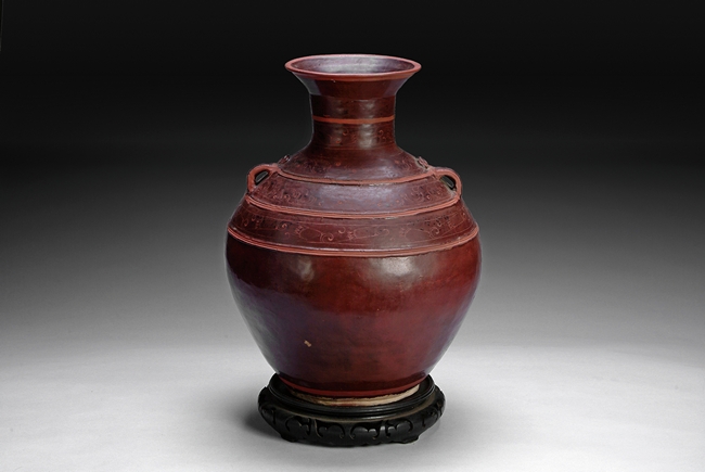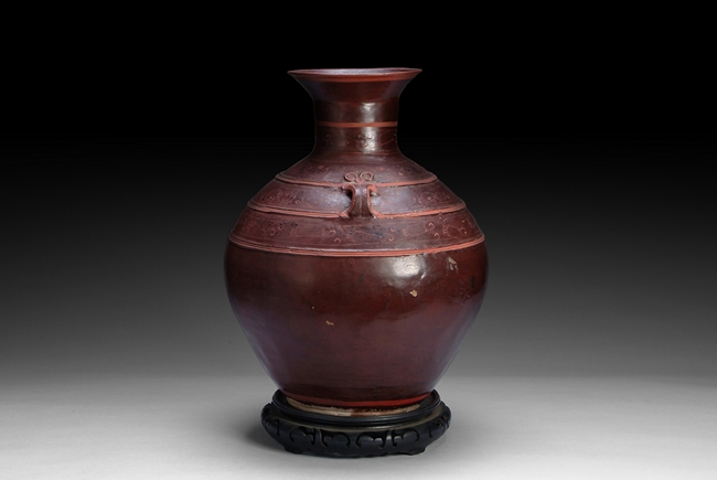 This jar features wide opening, short neck, and ovoid shaped body; two small handles on the side; circular rings on the body and neck. It is engraved with wave patterns. Han Dynasty period.