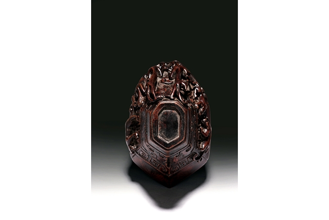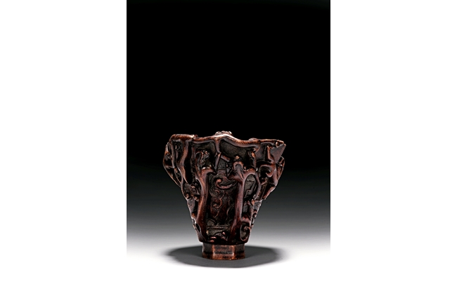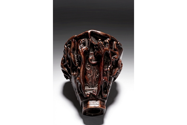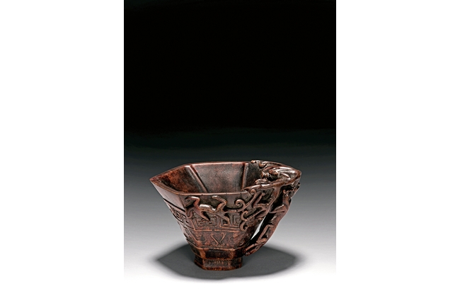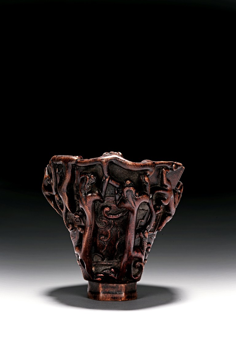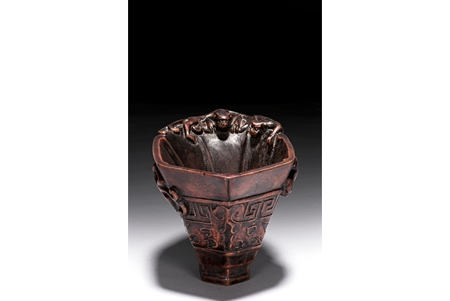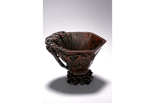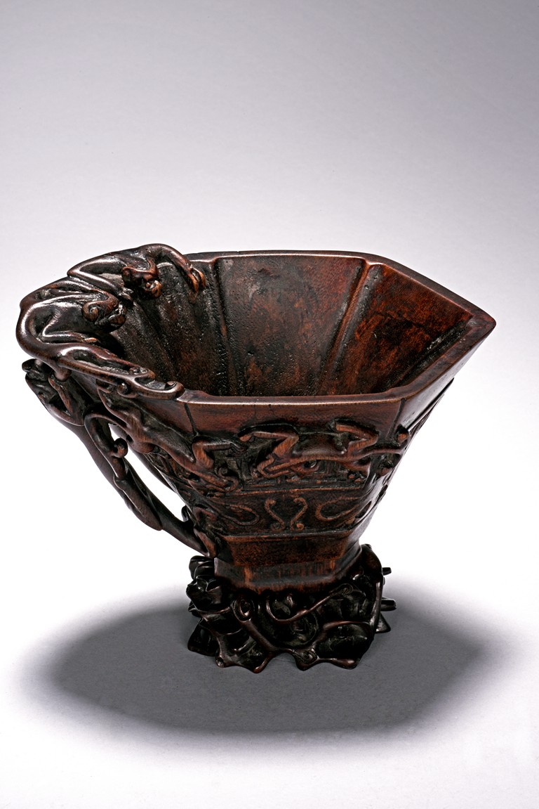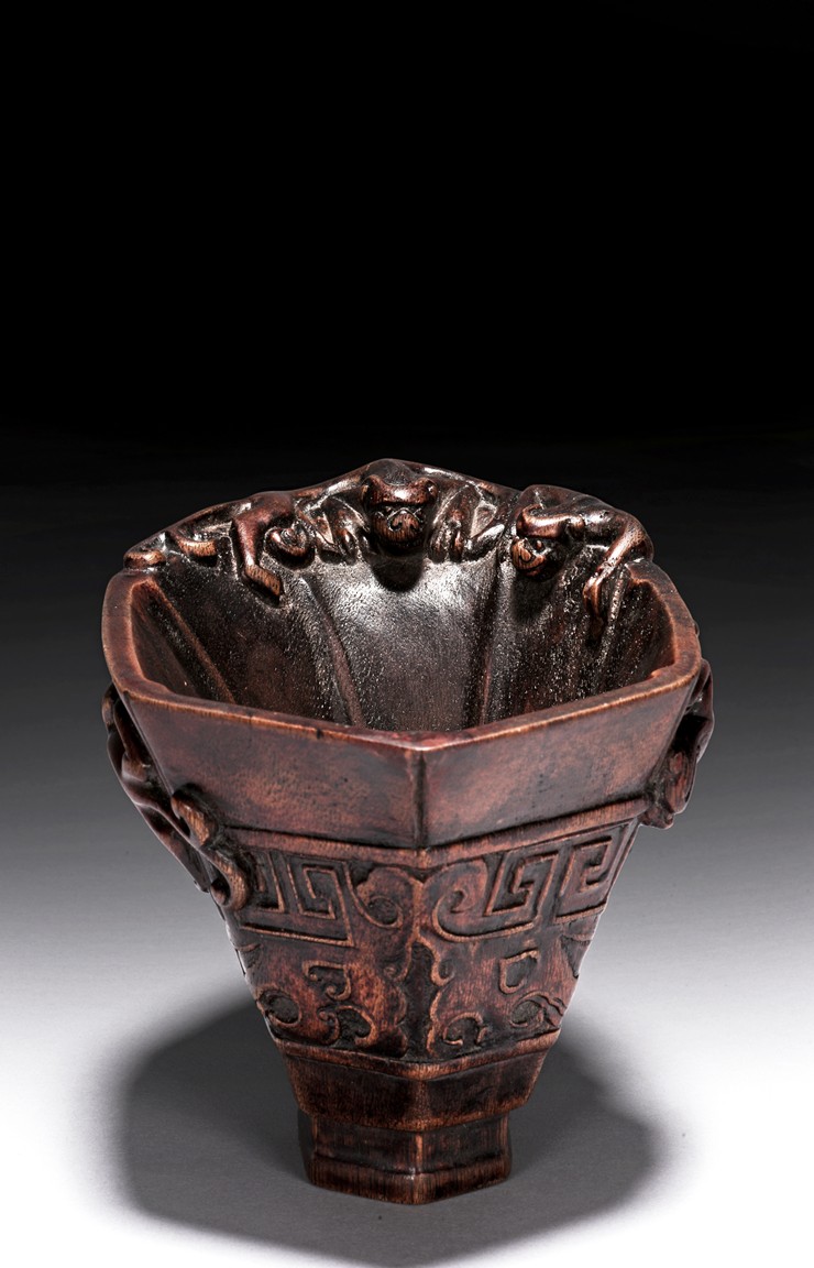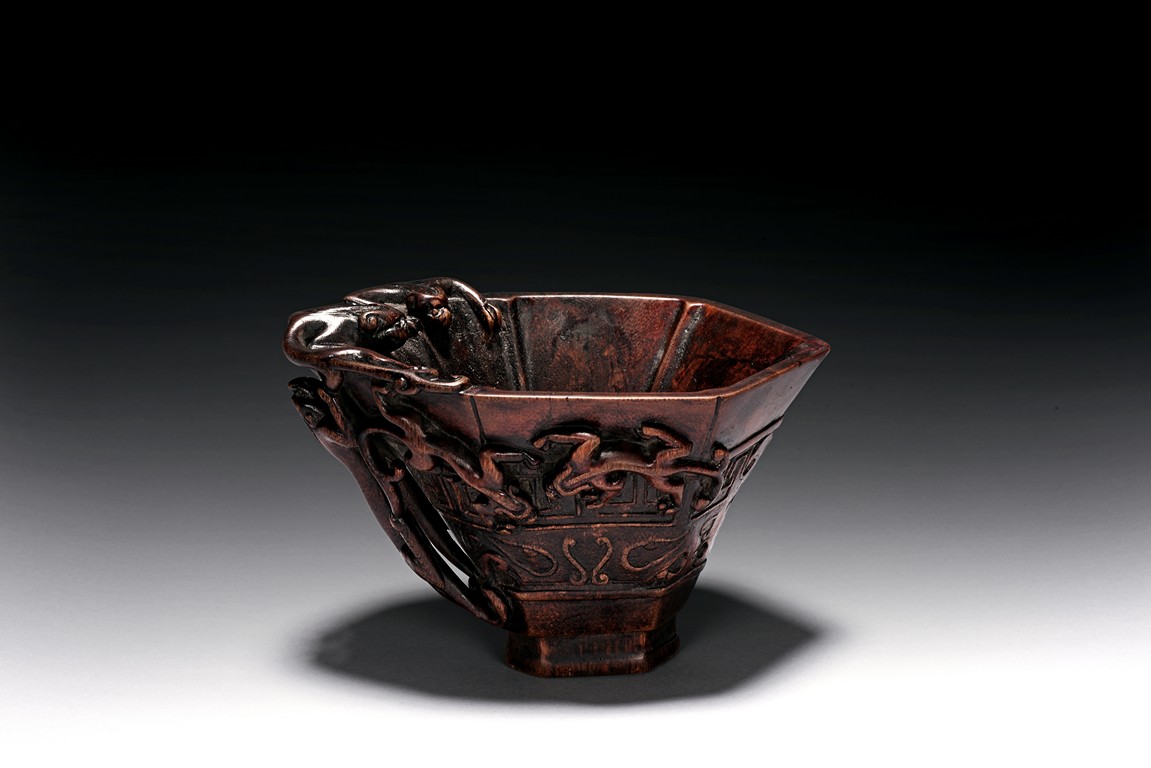 Of hexagonal in form, the cup is finely carved with a band of archaistic key-fret pattern covered by chilong, the handle formed by three clambering chilong dragons in high relief, accompanied with a hardwood reticulated base stand. Qing Dynasty period.