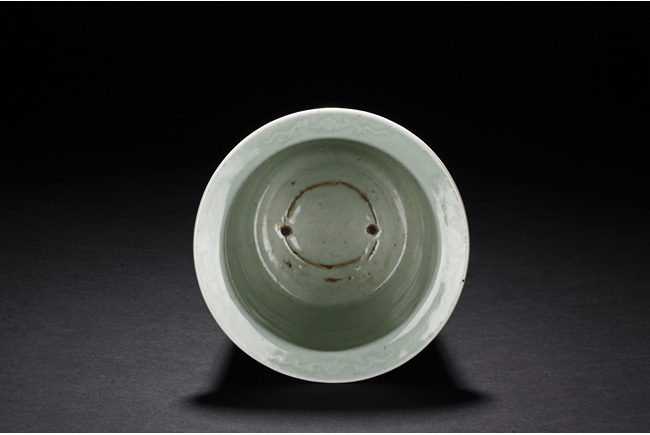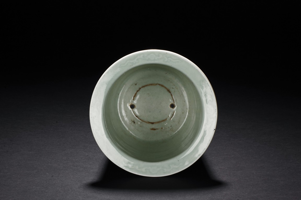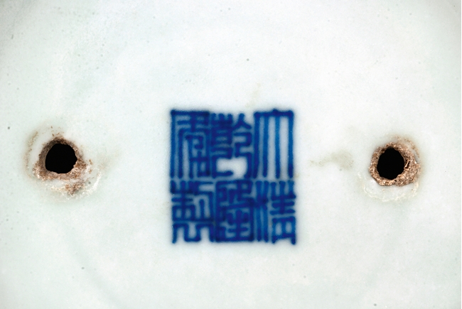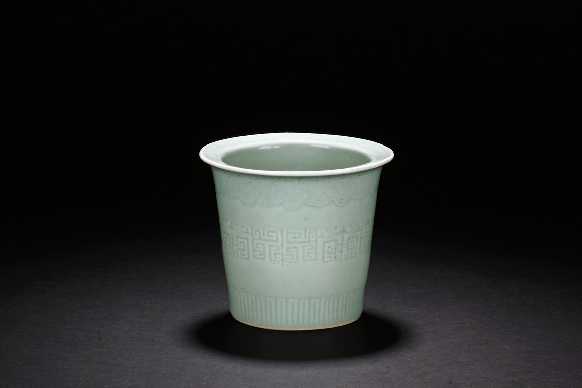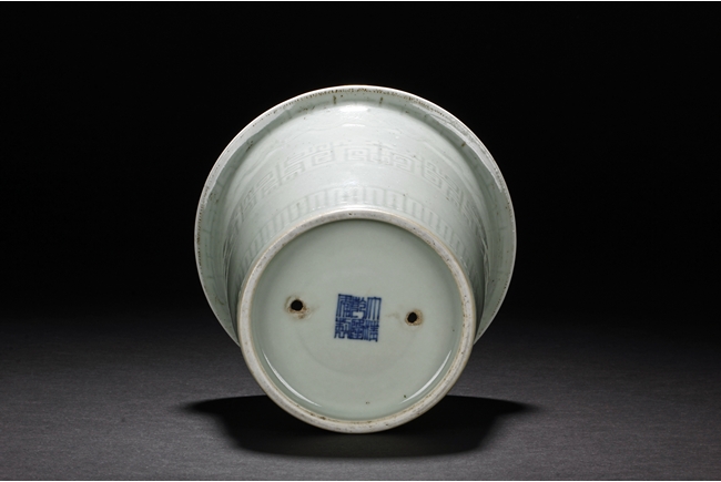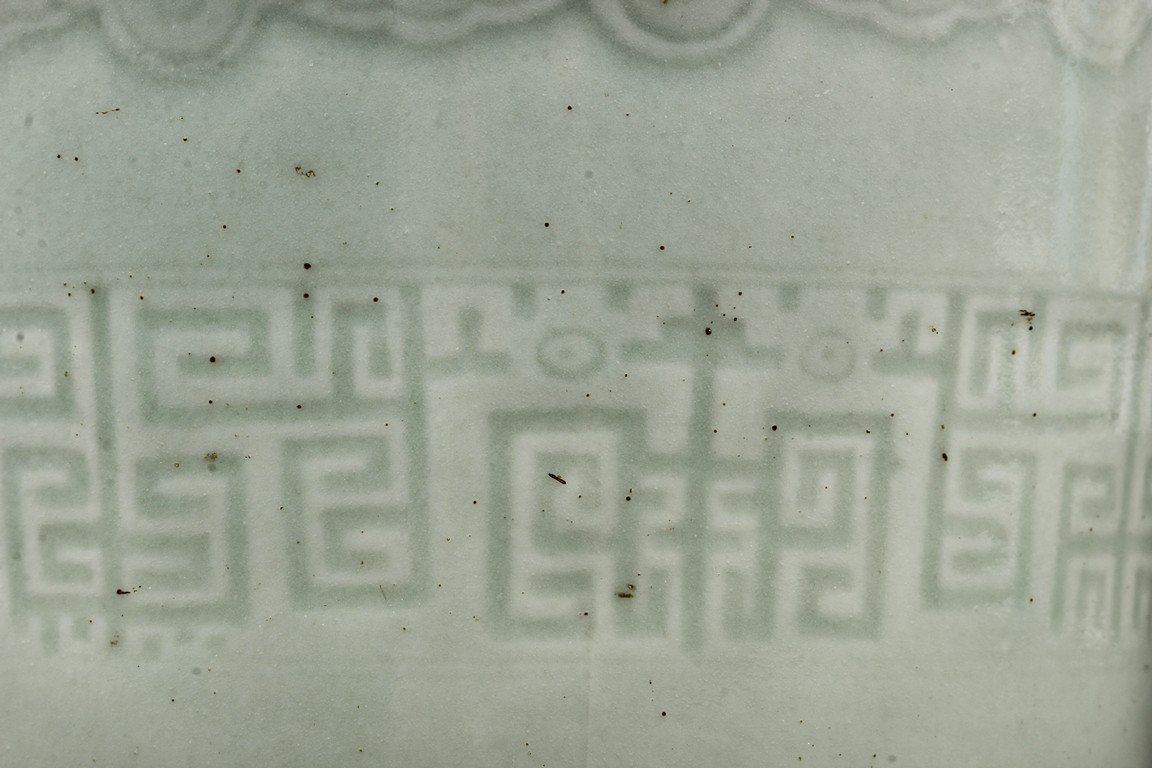 The body is decorated with a continous key-fret band flanked by ruyi band around the neck. The bottom bears a six character 'Qianlong' mark.