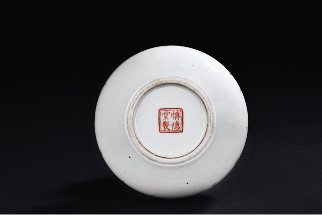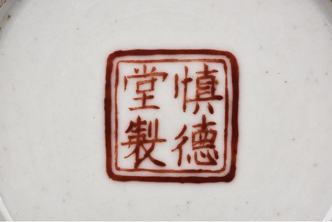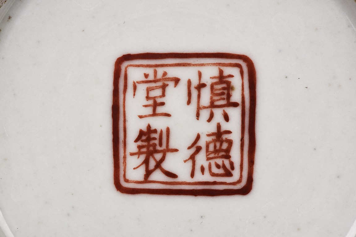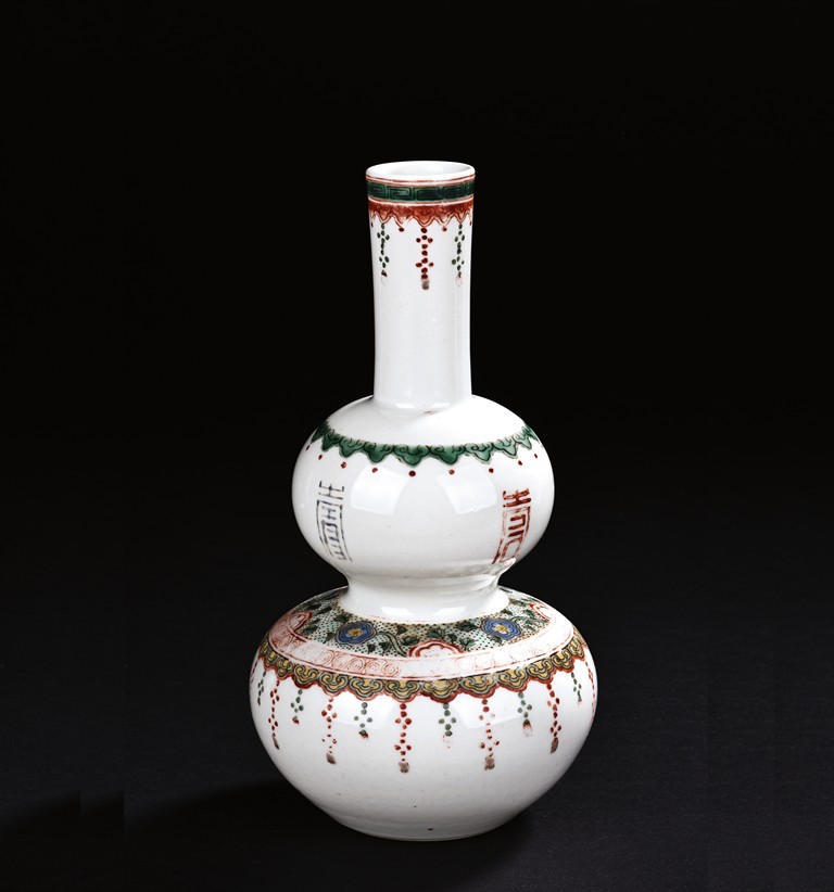 Of double gourd shape, the vase is enamelled with ruyi and scrolling motif bands, the upper gourd decorated with stylized shou characters, the neck is painted with a band of ruyi motif. The bottom bears a four character 'Shen De Tang Zhi' mark.