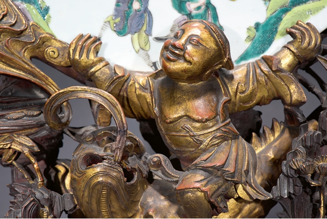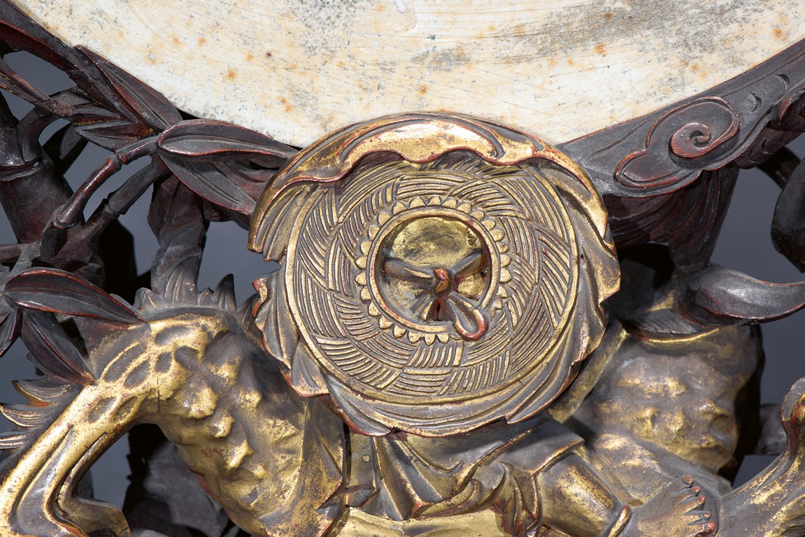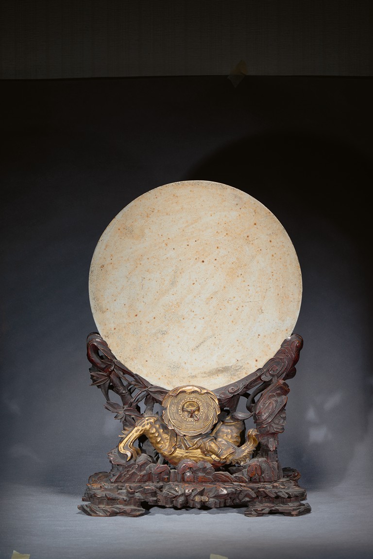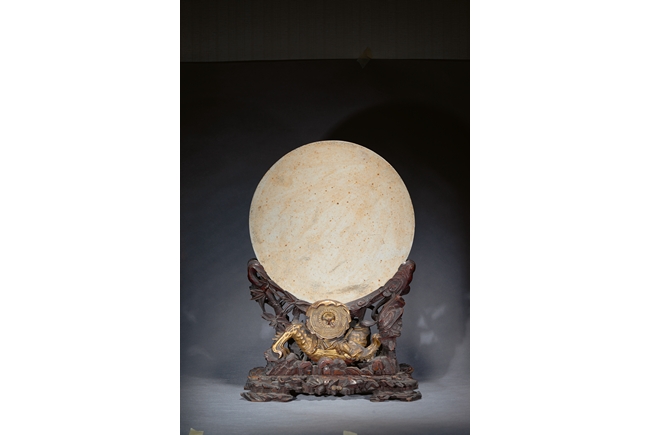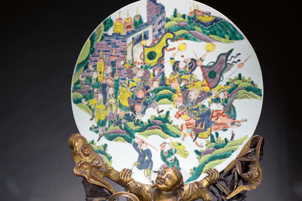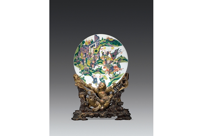 The finely painted circular panel vivdly depicting generals and his warriors on horses besiging enemies at an outpost, all supported on carved Jinsi Nanmu 'figures' stand. Qing Dynasty Kangxi Period.