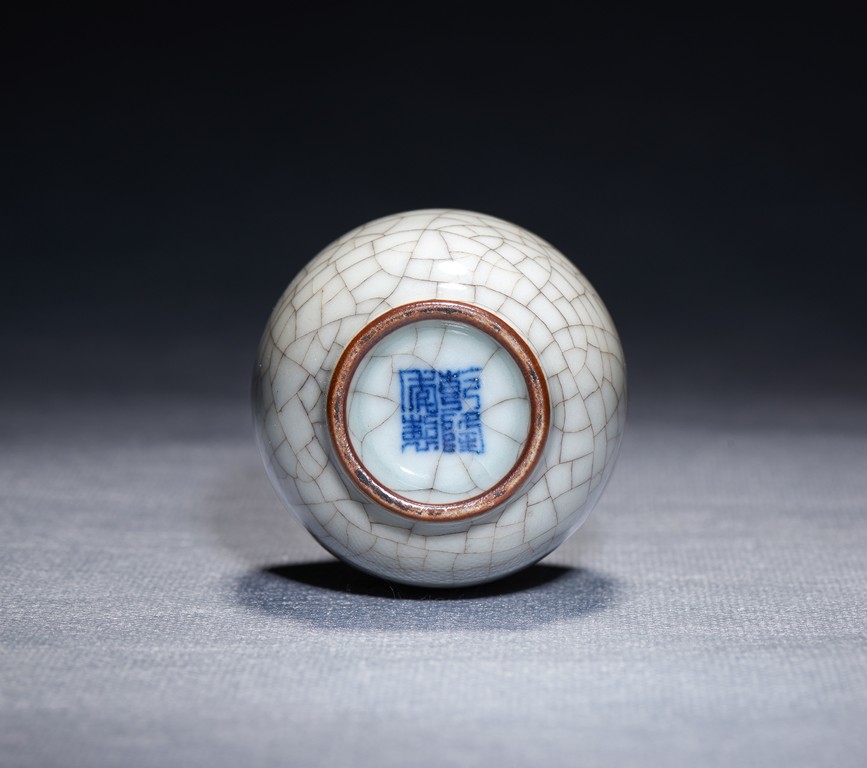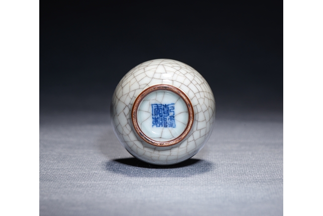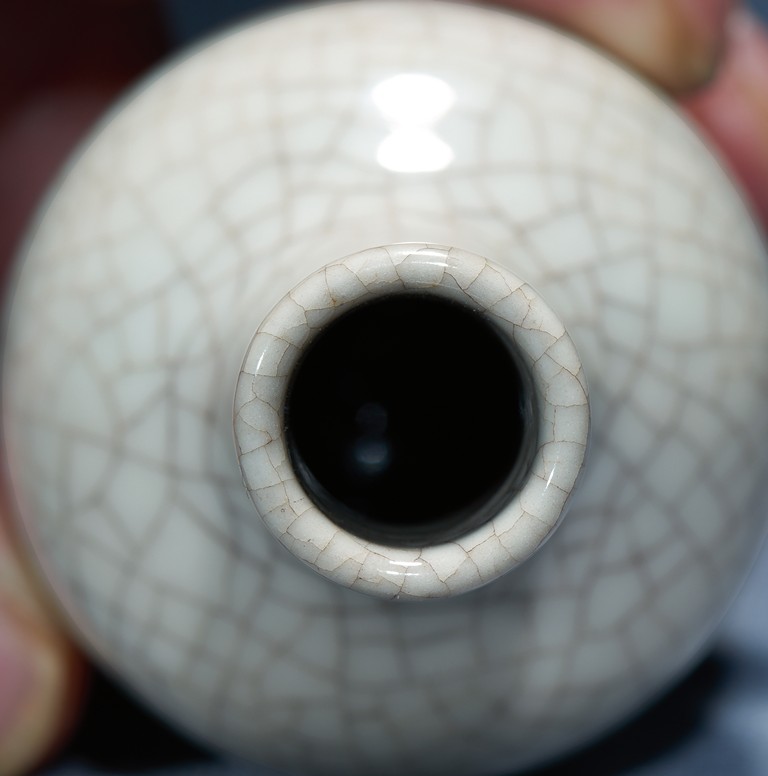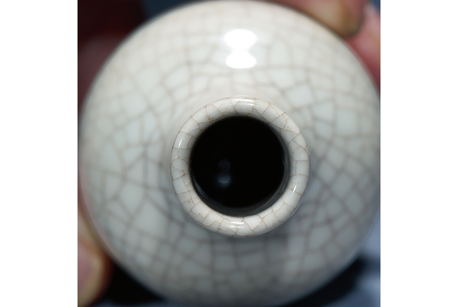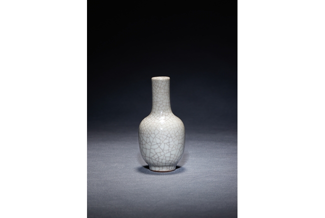 The well-potted vase rising to a tall cylindrical neck, covered overall in simulated Guan-type glaze of pale ash-grey tone with crackle pattern, the base with four character QIANLONG mark.Qing Dynasty Qianlong period.