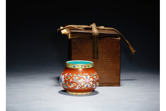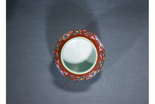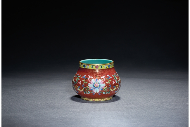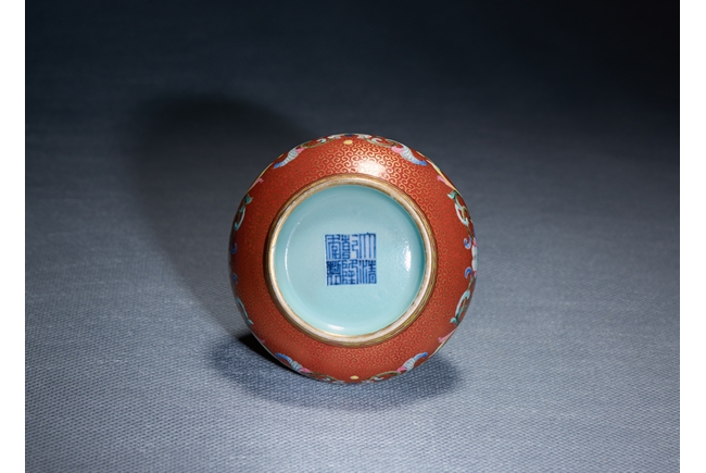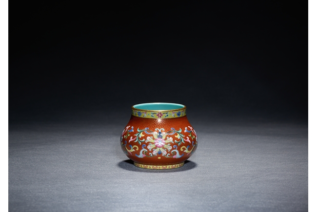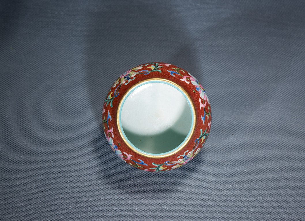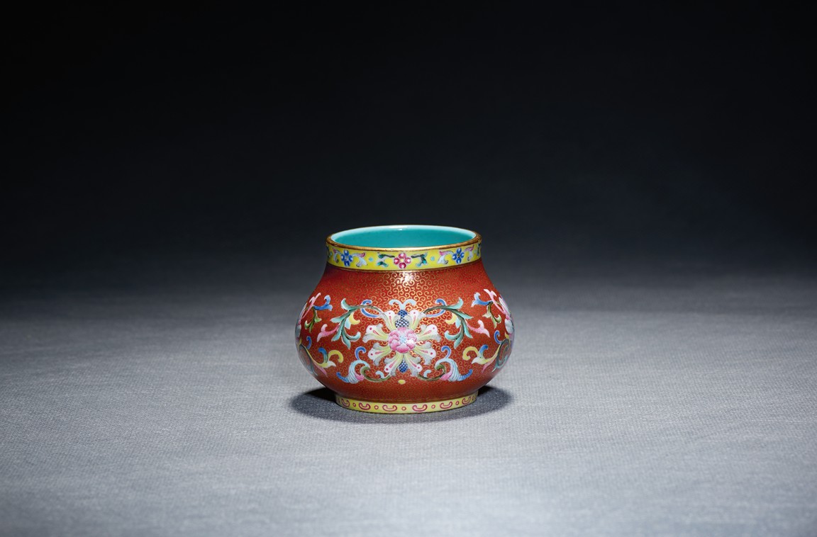 Of compressed globular form, the body finely enamelled with lotus foliate scrolls reserved on dense gilt-painted scrolls and ruby-red ground, the mouth painted with a band of foliate pattern on yellow ground, the interior with turquoise glaze, the base with six character QIANLONG mark.Qing Dynasty Qianlong Period.