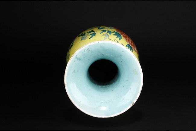 Of baluster form, the vase is brightly painted around the body with red, orange-glazed chrysanthemum flowers amongst leafy branches and four characters 'Yi Pin Fu Gui' all against yellow-glazed background. The long flaring neck is decorated in similar manner with chrysanthemum design. The neck and body are bordered between a key-fret and a ruyi-motif band. Qing Dynasty Period.