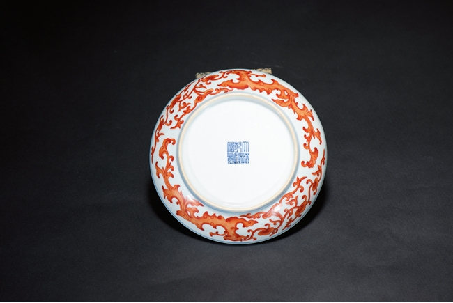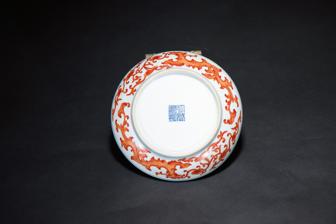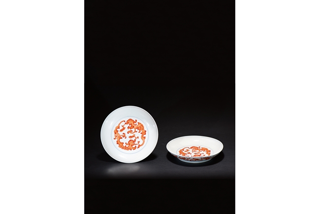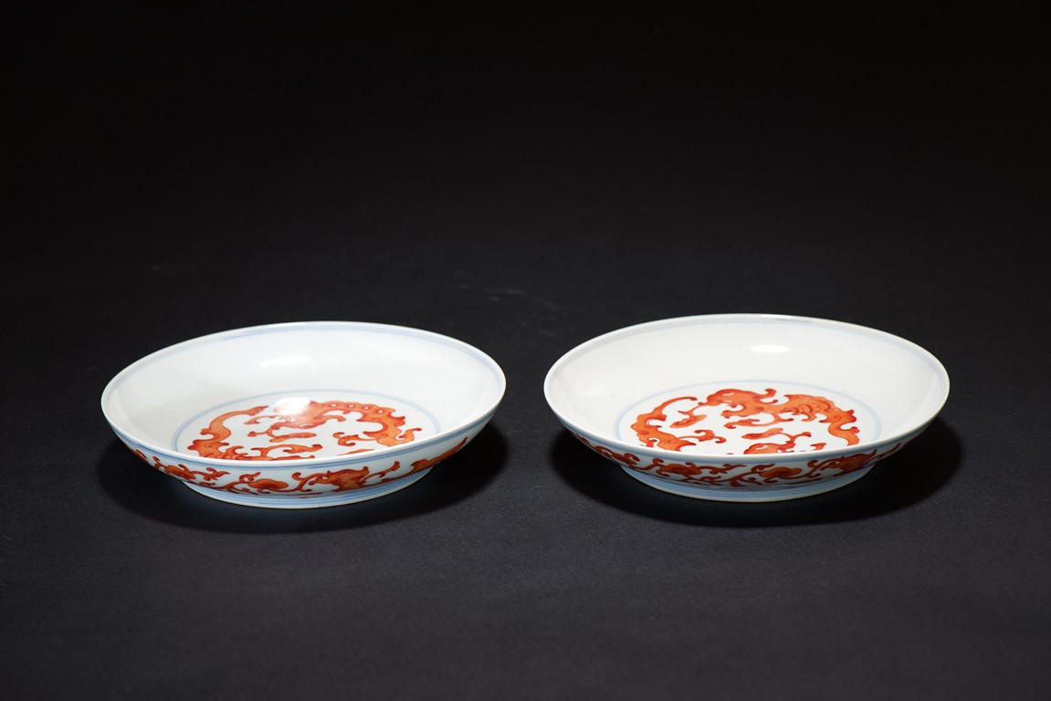 Each dish is finely enamelled in iron-red with archaistic dragons to the exterior, the interior with similar design within double circle border, the base with six character QIANLONG mark. Qing Dynasty period.