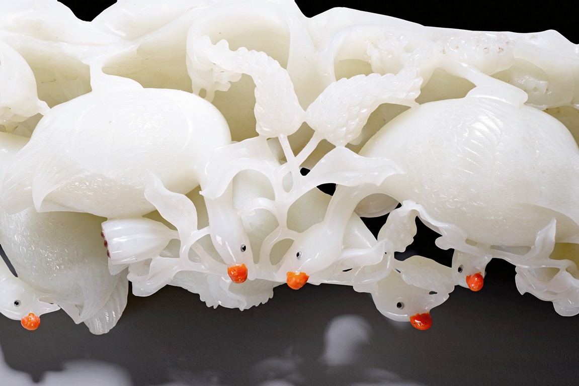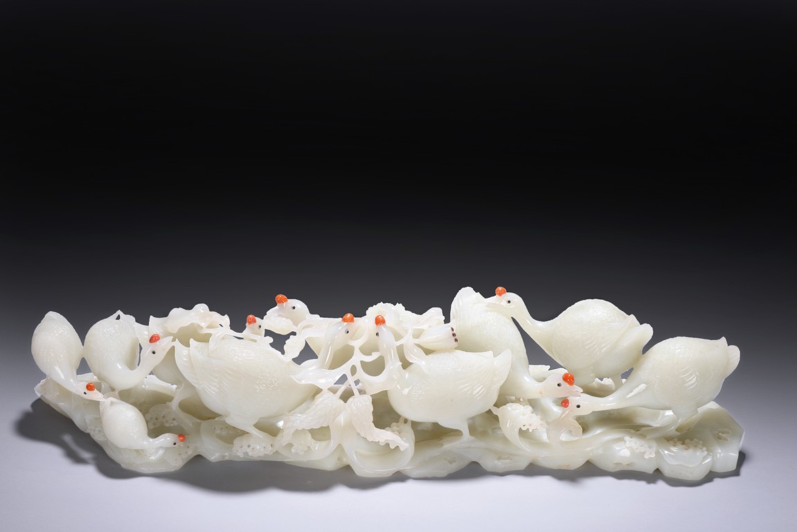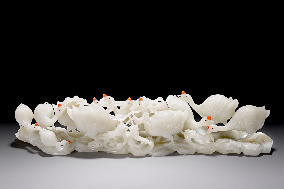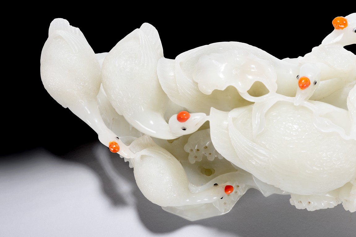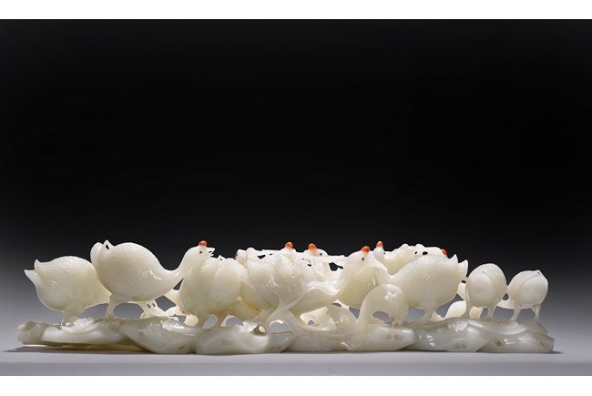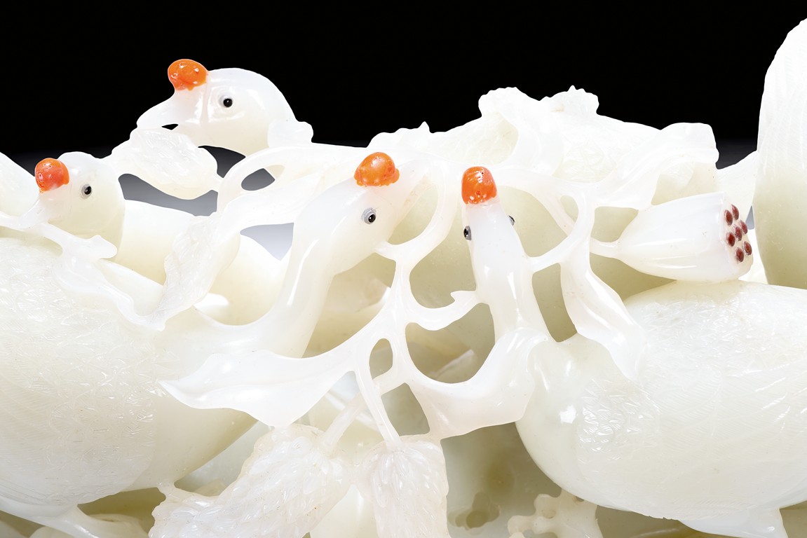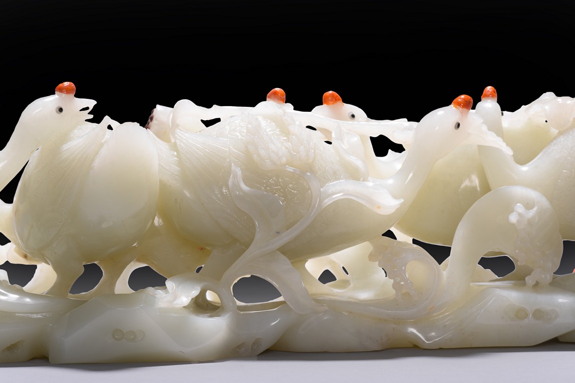 Horizontally worked, it is finely carved with ten geese standing in different postures and forming a crowd, each's plumage highly detailed with incised lines, the long neck stretching attempting to catch the wheat sprig. The stone is of even smooth white tone. 20th Century.