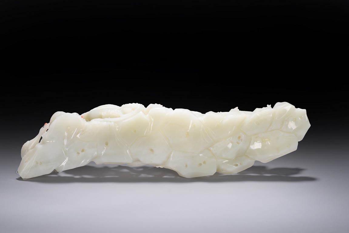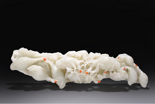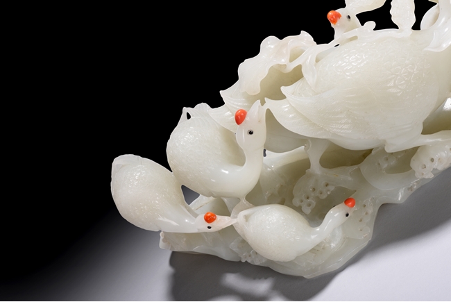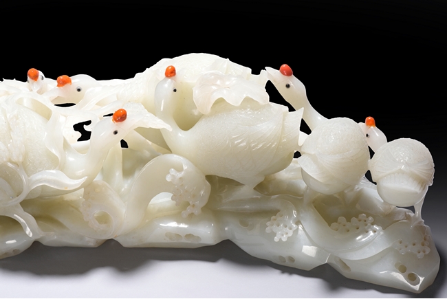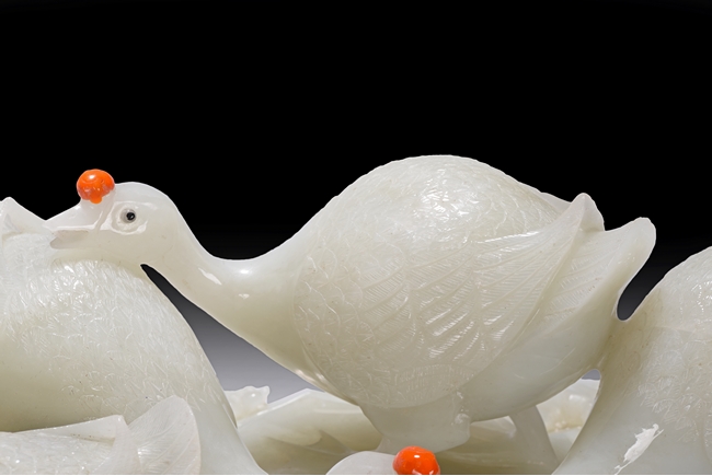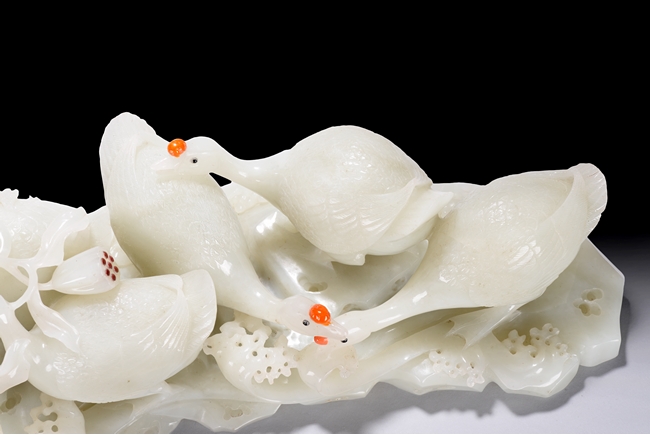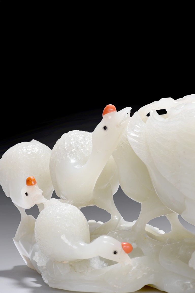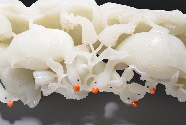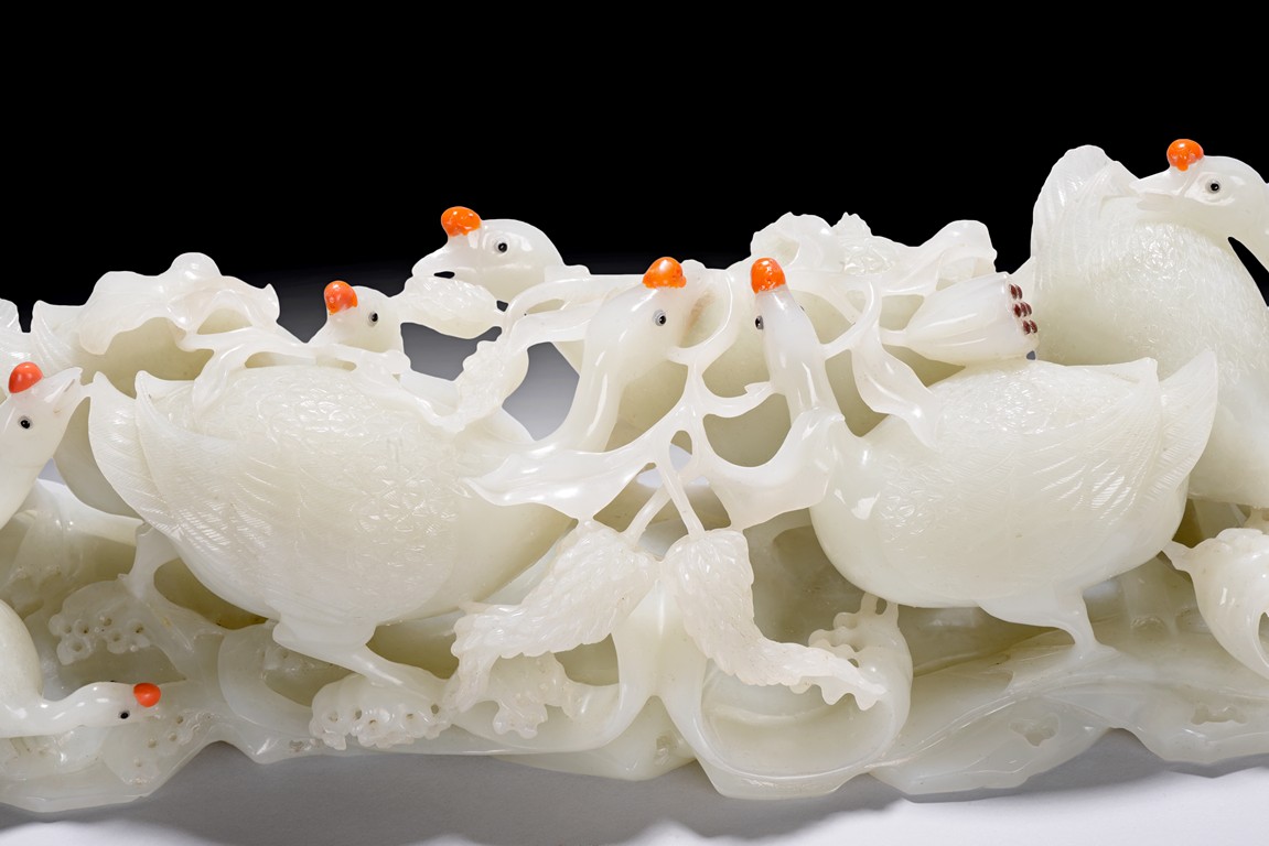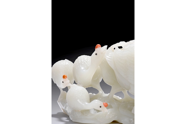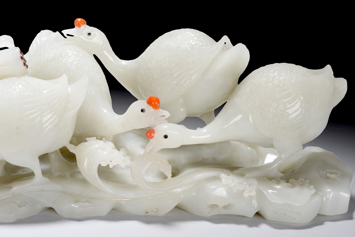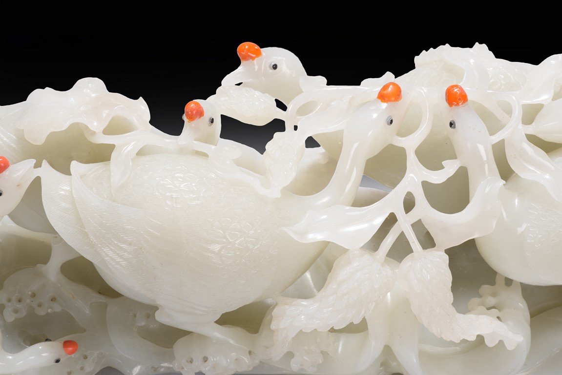 Horizontally worked, it is finely carved with ten geese standing in different postures and forming a crowd, each's plumage highly detailed with incised lines, the long neck stretching attempting to catch the wheat sprig. The stone is of even smooth white tone. 20th Century.