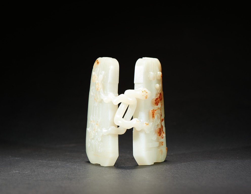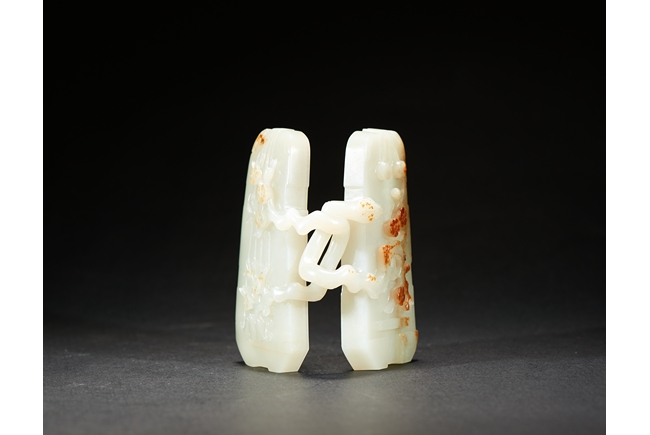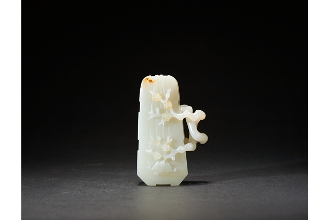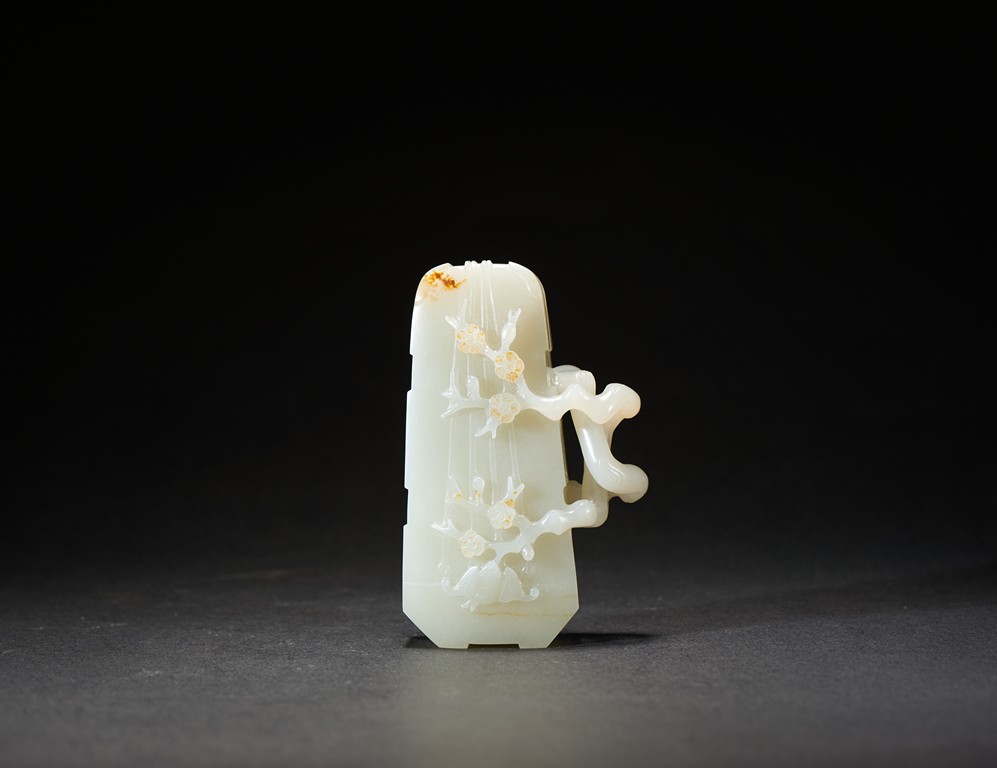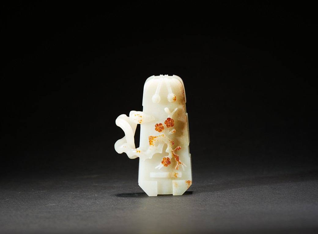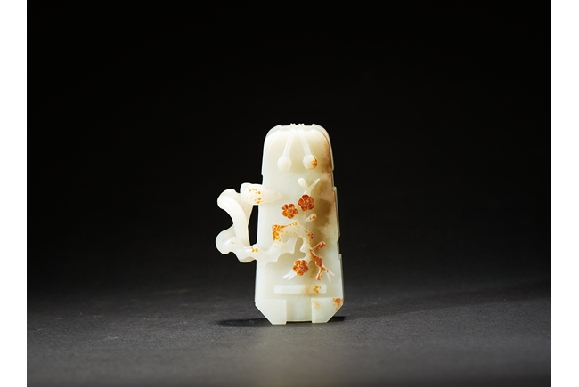 The box is carved with two gnarled plum branches forming a loop, with leafy branches to the exterior, cleverly utilizing the russet skin to depict the plum flowers. Qing Dynasty period.