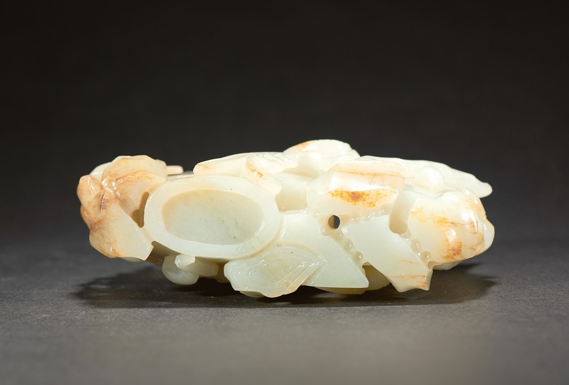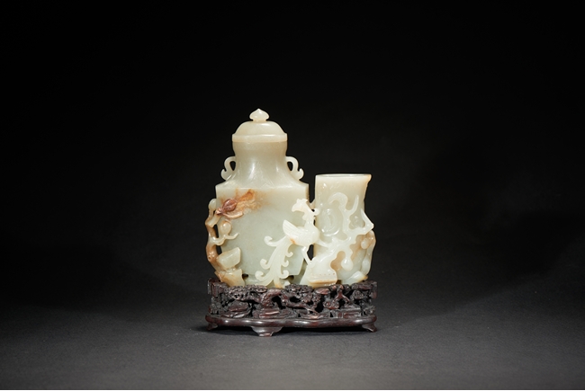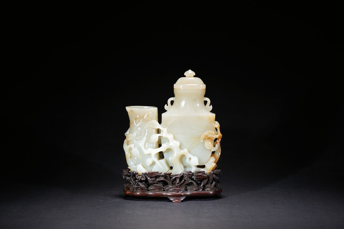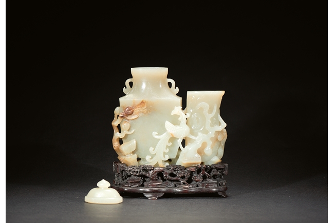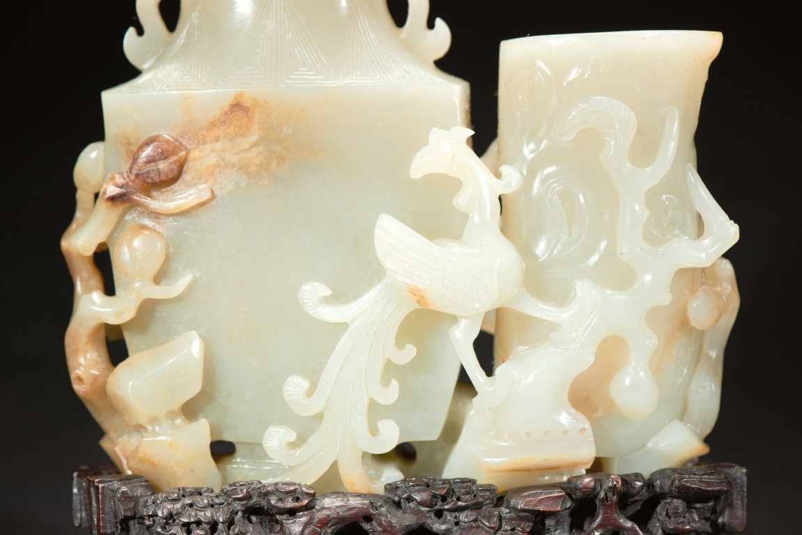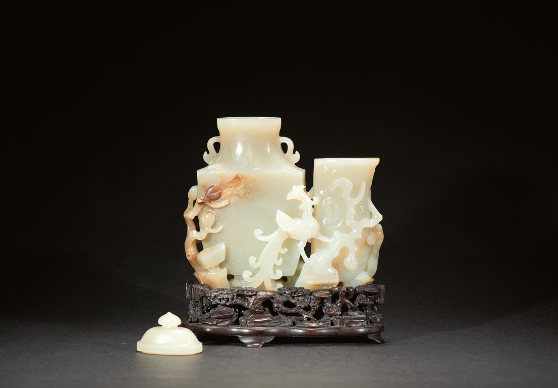 Modelled as a cover vase and a tree trunk vessel, the exterior carved with phoenix standing upon gnarled branch and peach branches issuing from rockwork, the stone is of even white tone with russet skin, accompanied with an carved and pierced hongmu stand. Qing Dynasty period.
