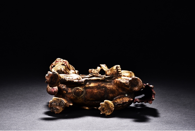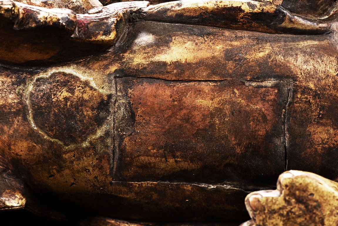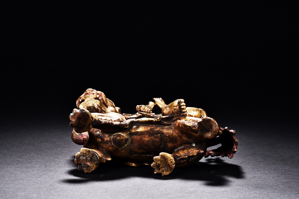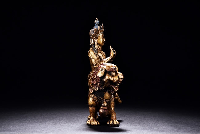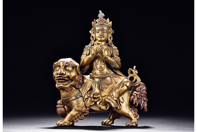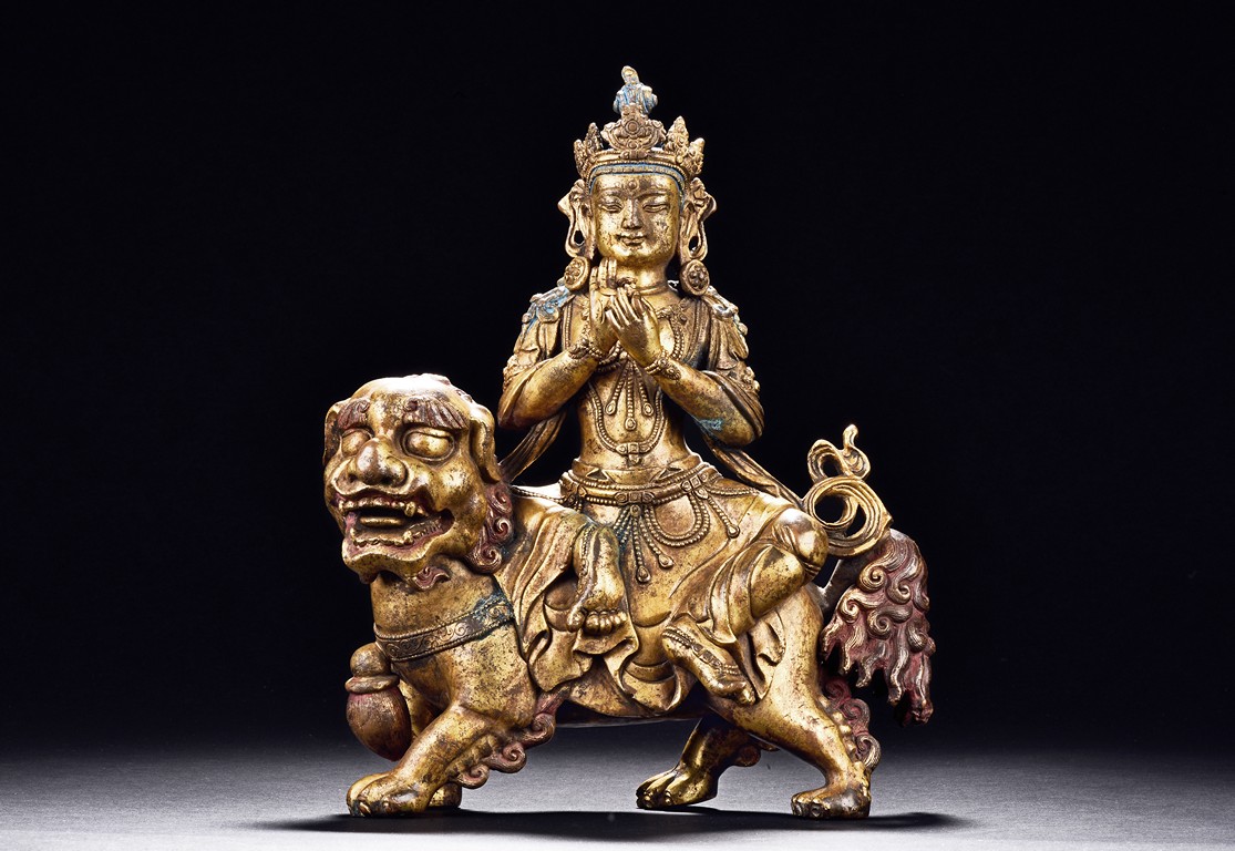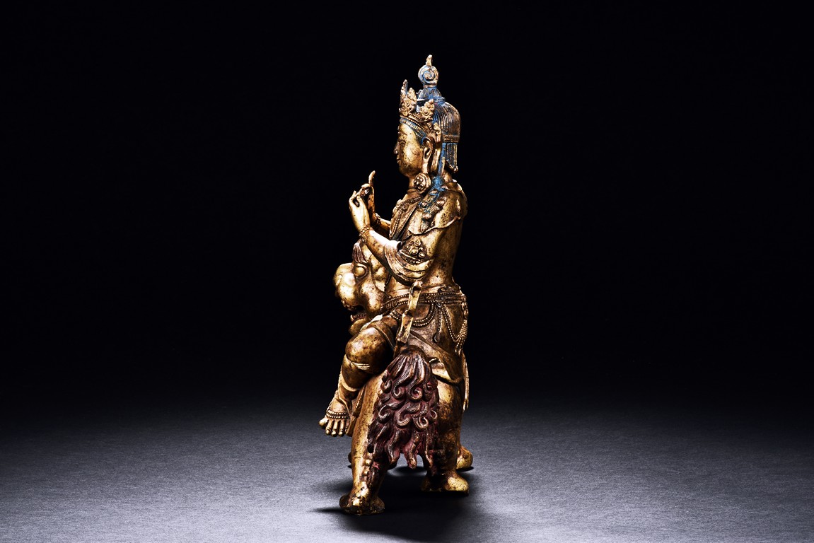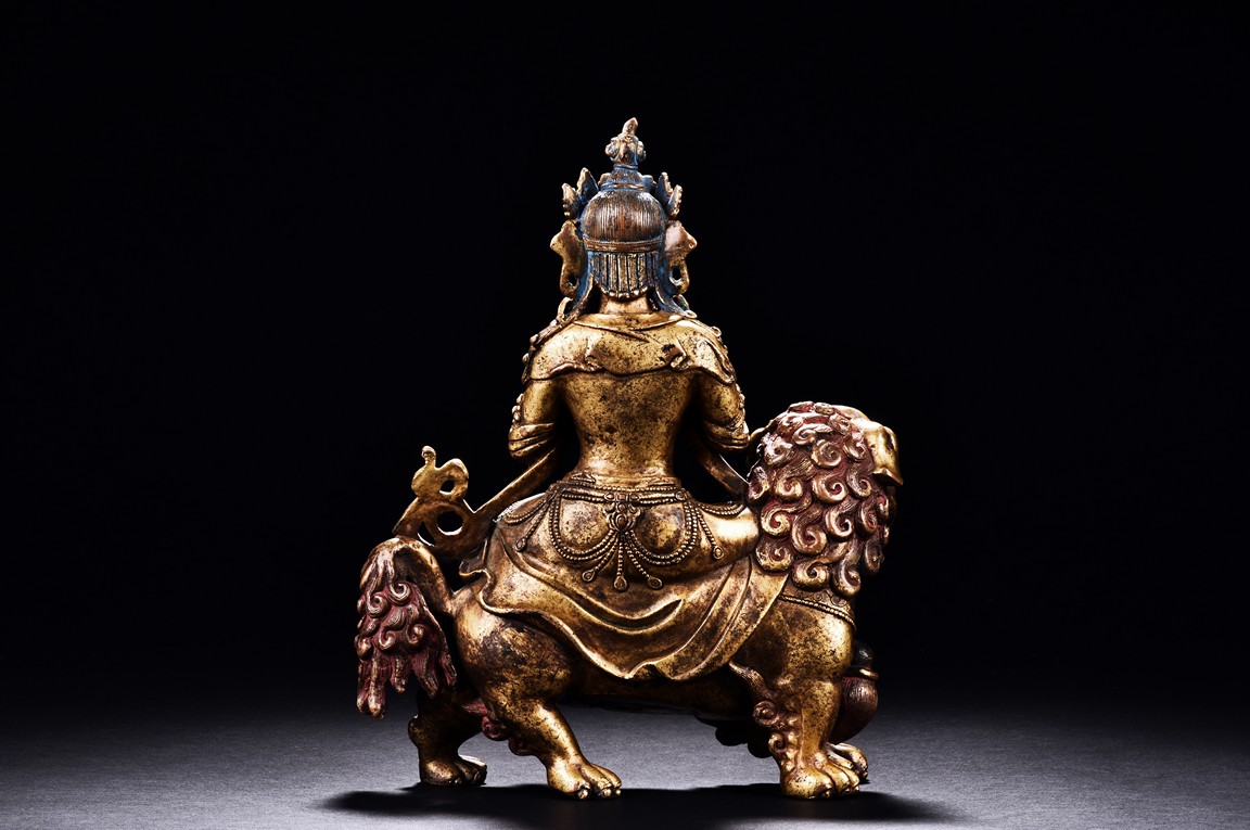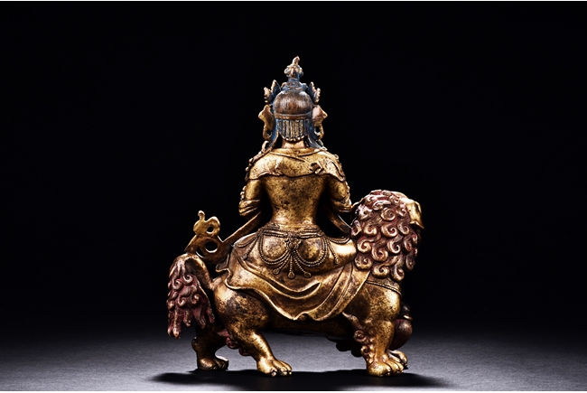 The bodhisattva is shown seated upon a Buddhist lion with both hands in mudra, wearing long and flowing robe, the chest adorned with beaded necklace, the face with benevolent expression, wearing pointed diadem and hair tied into high chignon. The buddhist lion with its head turned to its left, its bulging eyes, thick eyebrows, and a large bell tied to its neck meticulously rendered.