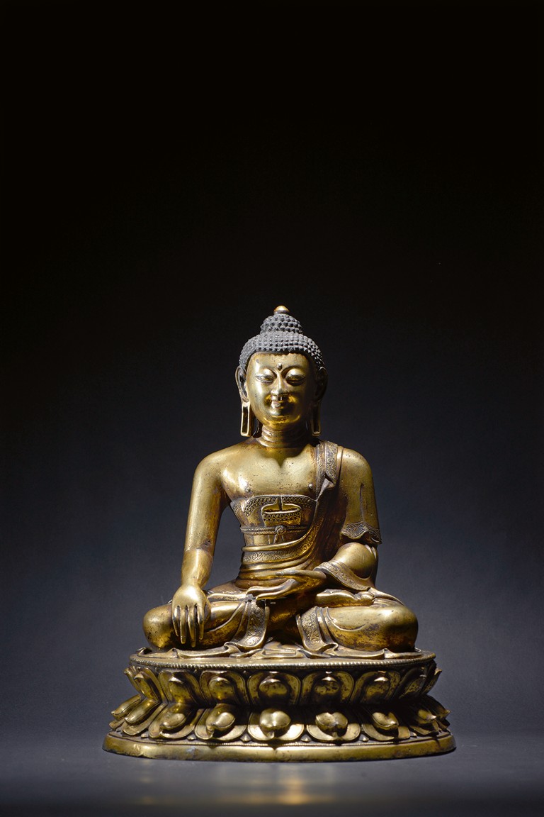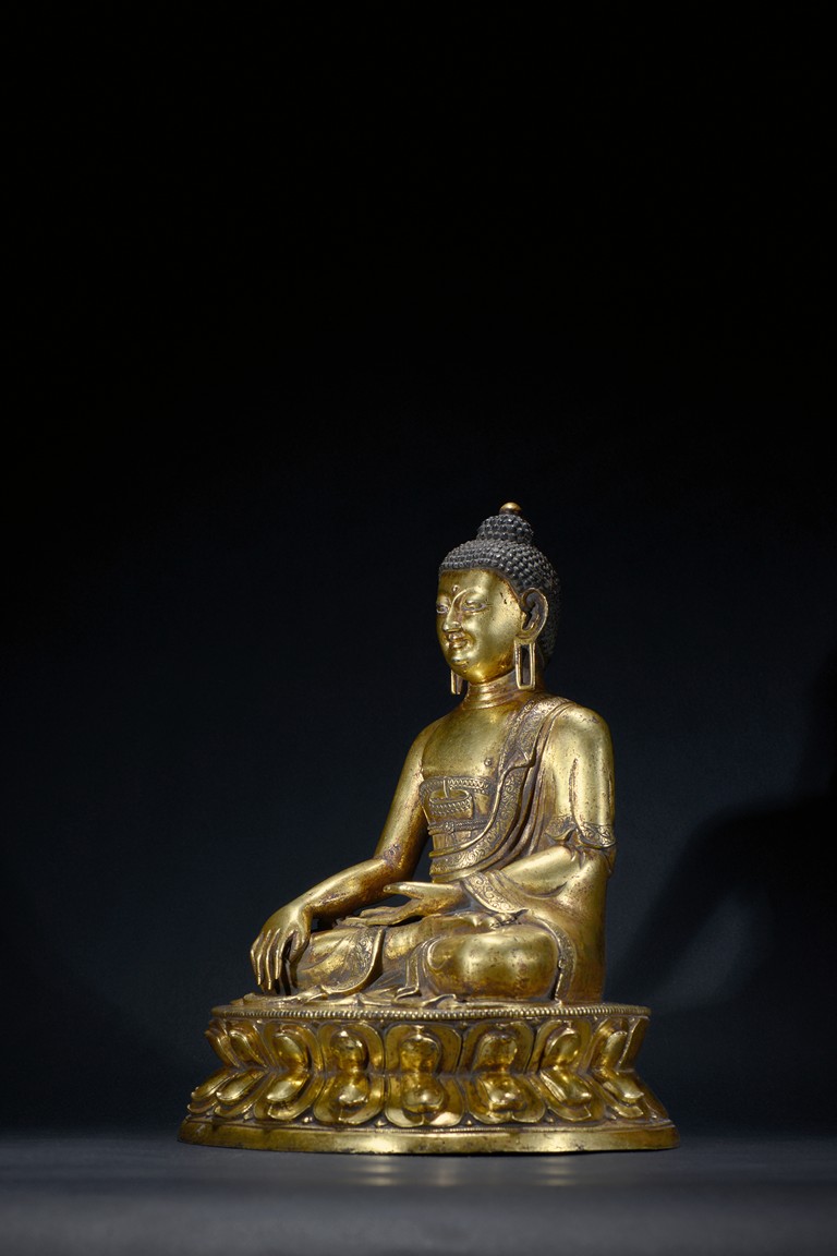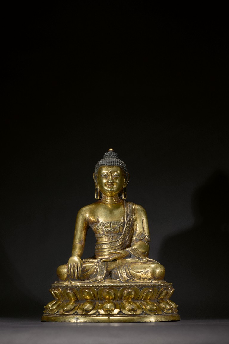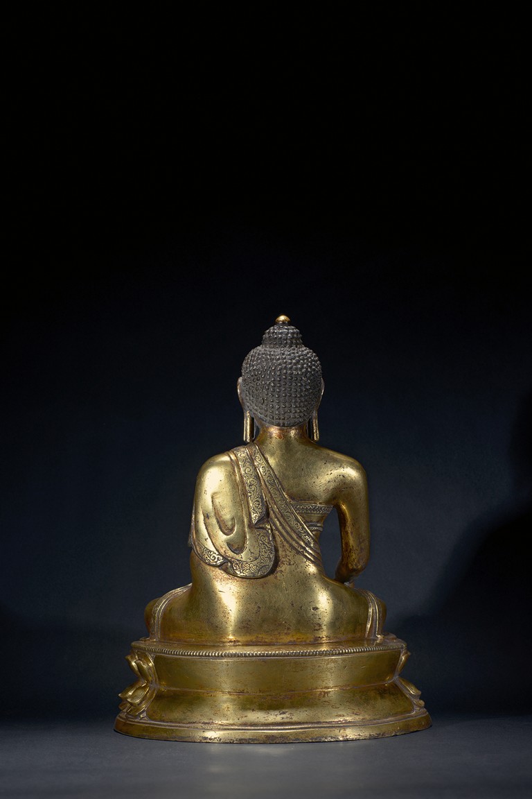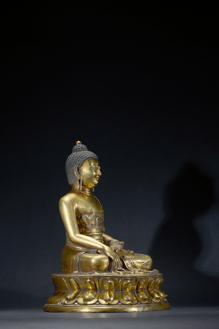 The bodhisattva is shown in vajrasana on a lotus with his right hand in bhumisparsha mudra while the left rests on his lap. He is dressed in dhoti with a small section draped over his right shoulder in the shape of a swallow’s tail. His face shown with serene expression with downcast eyes below arched eyebrows and urna. His curled hair and ushnisha are topped with a lotus-bud. The back of the lotus throne with inscription reading 'da qing Yong zheng nian jing zao' and Tibetan inscription below. Qing Dynasty Yongzheng Period.