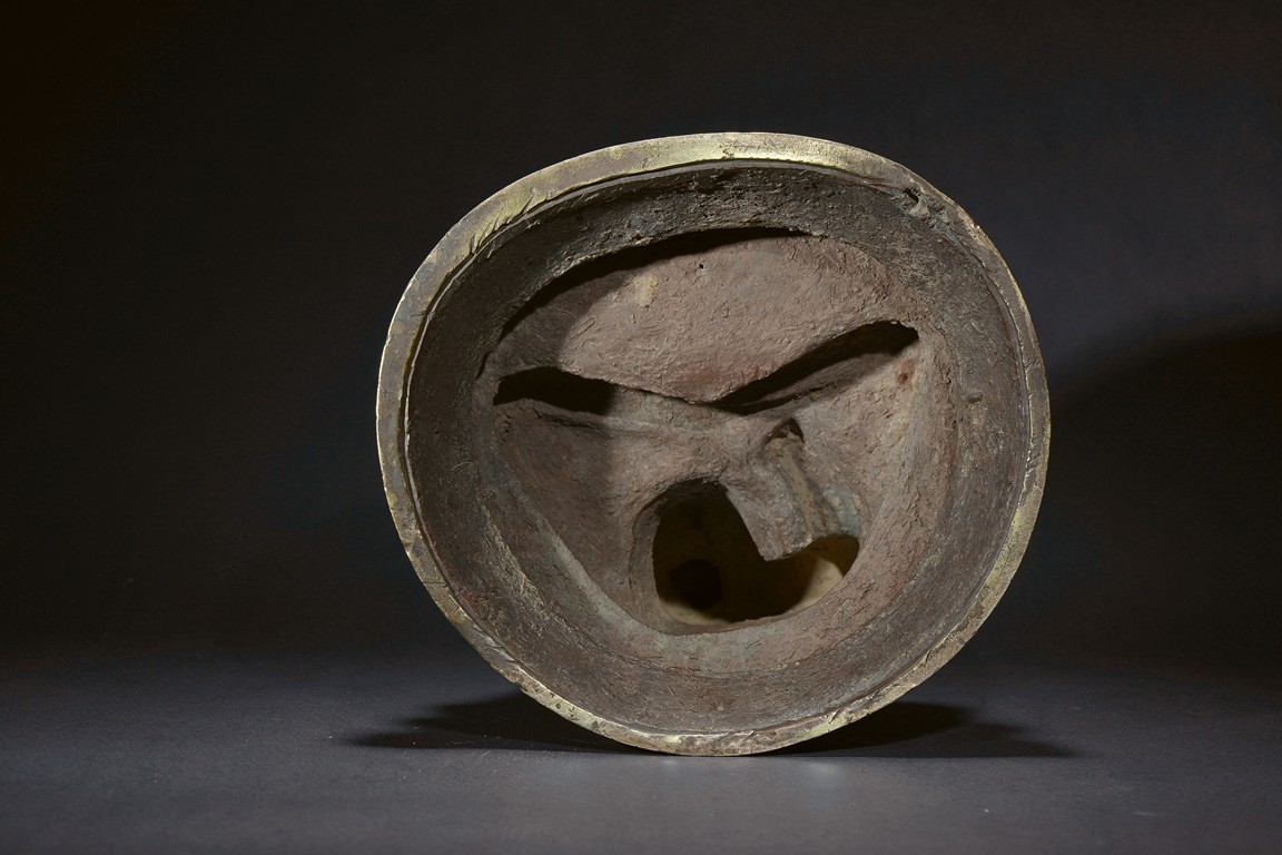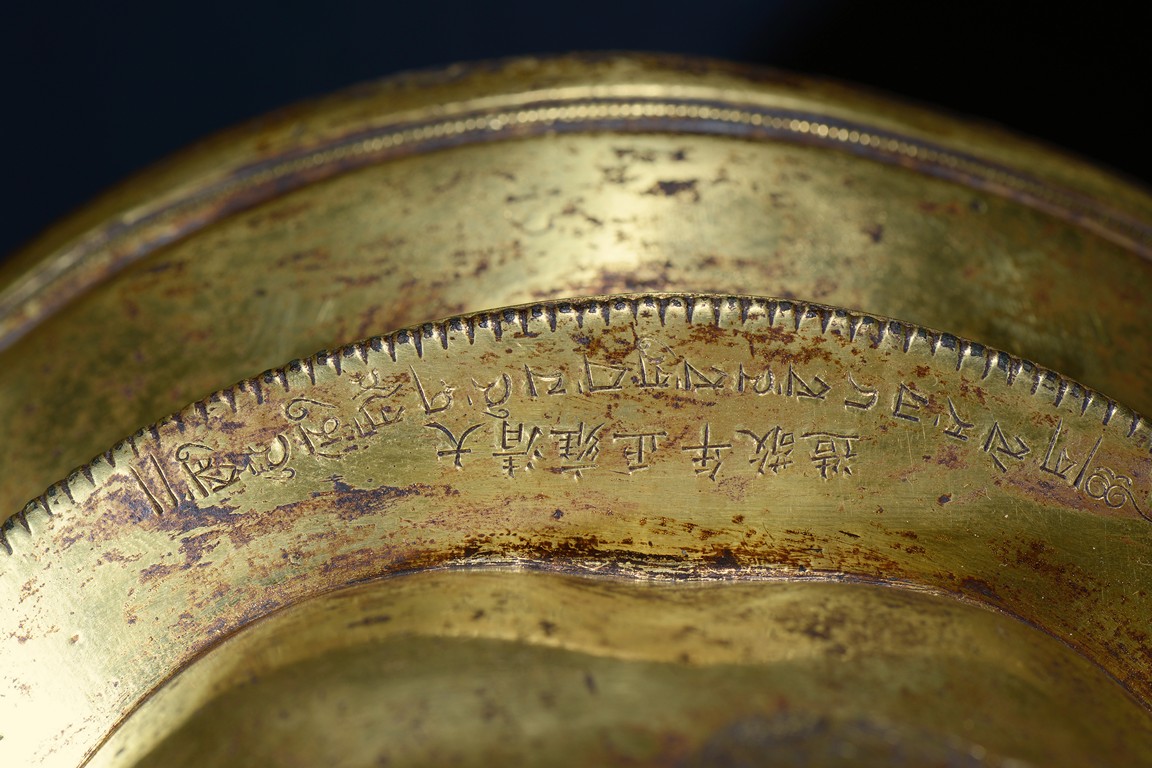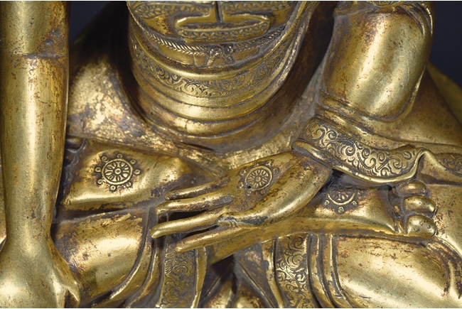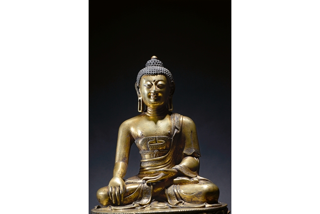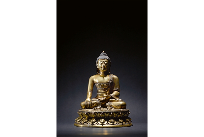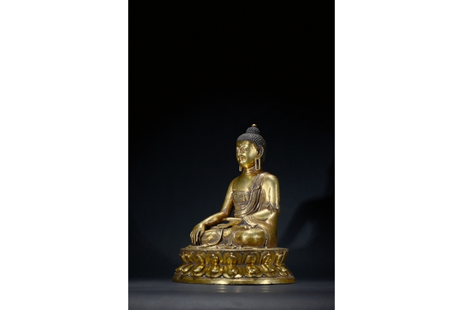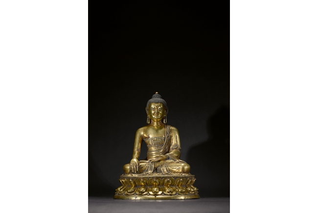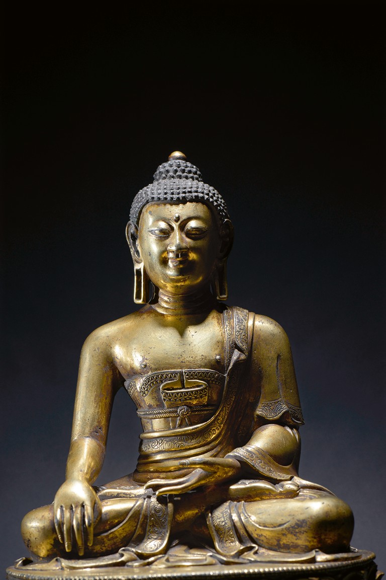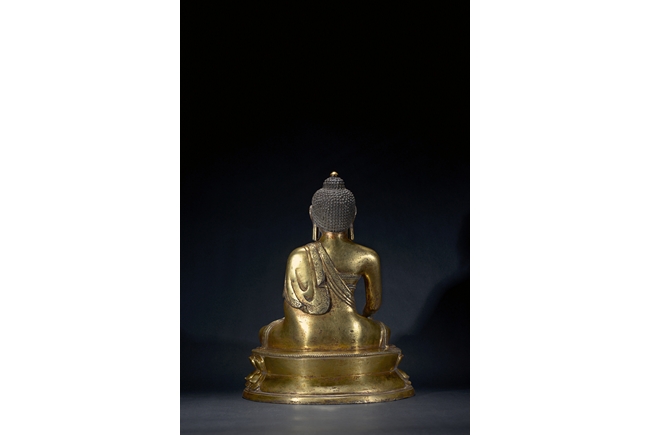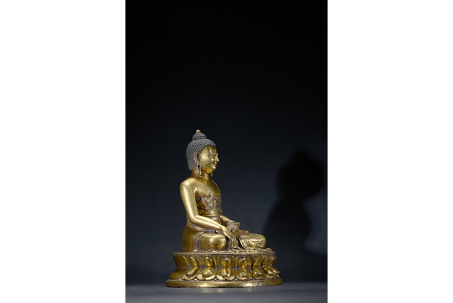 The bodhisattva is shown in vajrasana on a lotus with his right hand in bhumisparsha mudra while the left rests on his lap. He is dressed in dhoti with a small section draped over his right shoulder in the shape of a swallow’s tail. His face shown with serene expression with downcast eyes below arched eyebrows and urna. His curled hair and ushnisha are topped with a lotus-bud. The back of the lotus throne with inscription reading 'da qing Yong zheng nian jing zao' and Tibetan inscription below. Qing Dynasty Yongzheng Period.