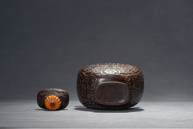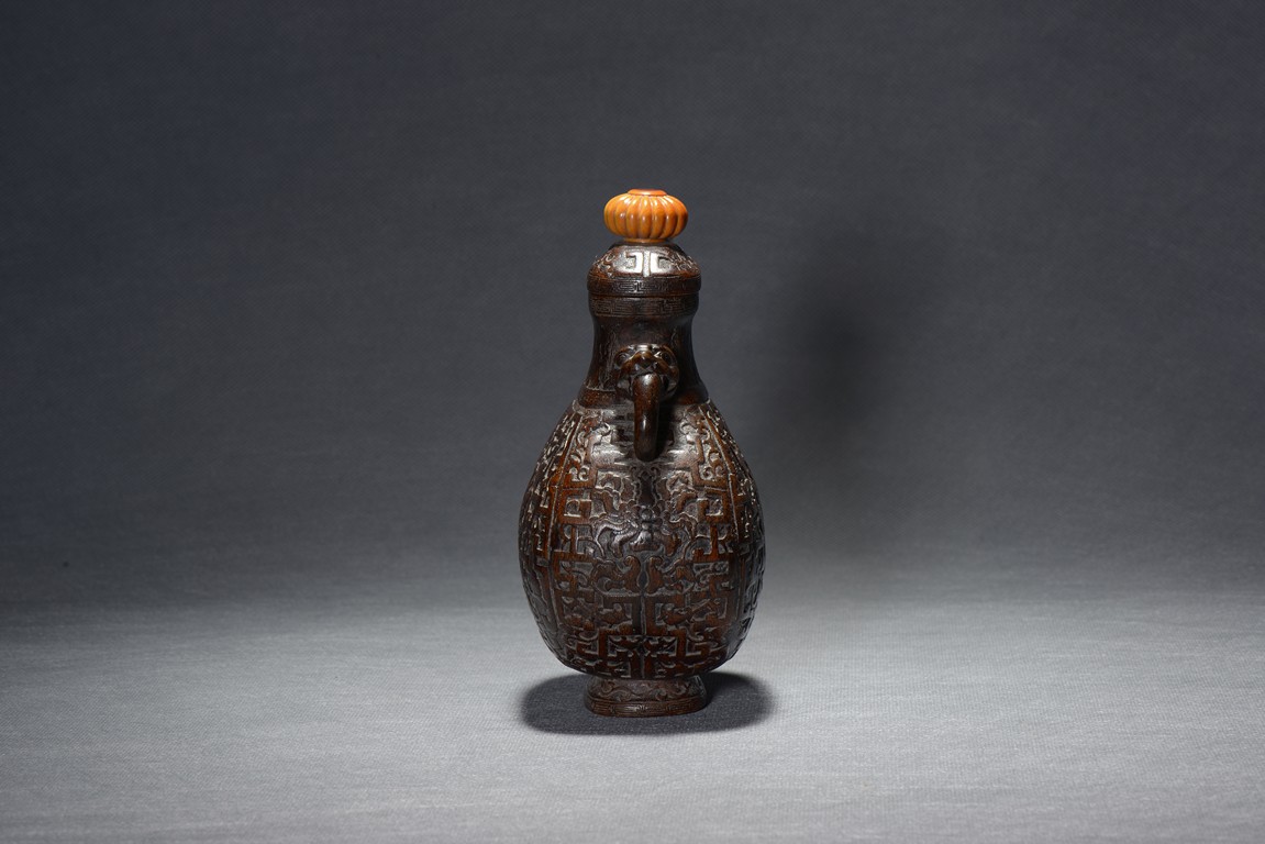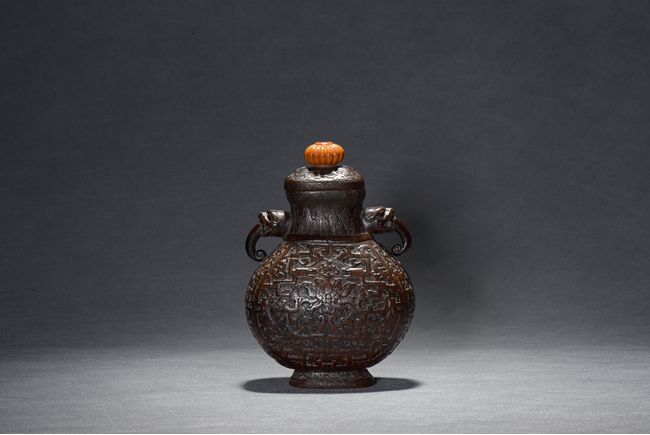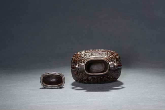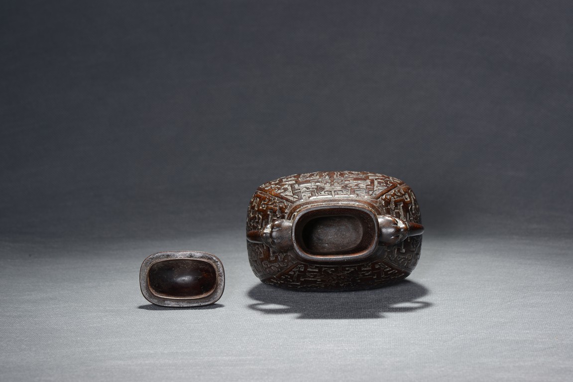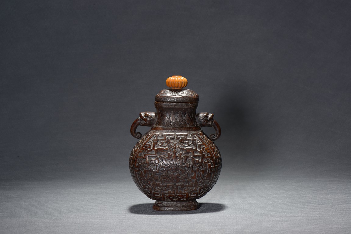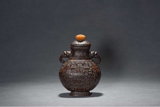 Rising from spread feet, the body finely carved with lotus surrounded by intertwining archaistic and scrolled pattern, the neck with leave blades, flanked by two beast handles, the cover with mellon shaped finial. Qing Dynasty period.