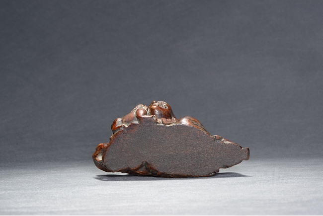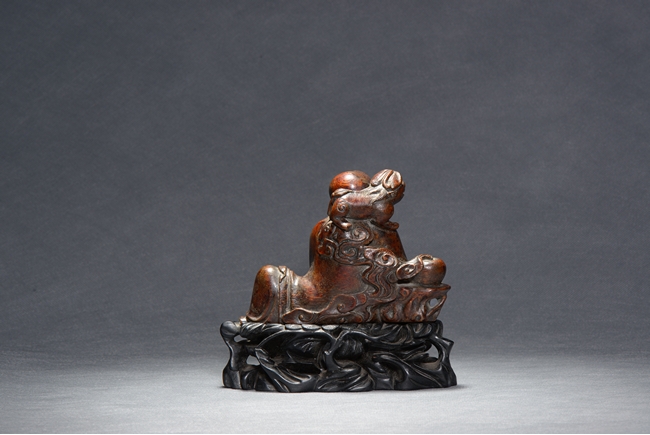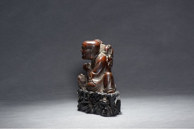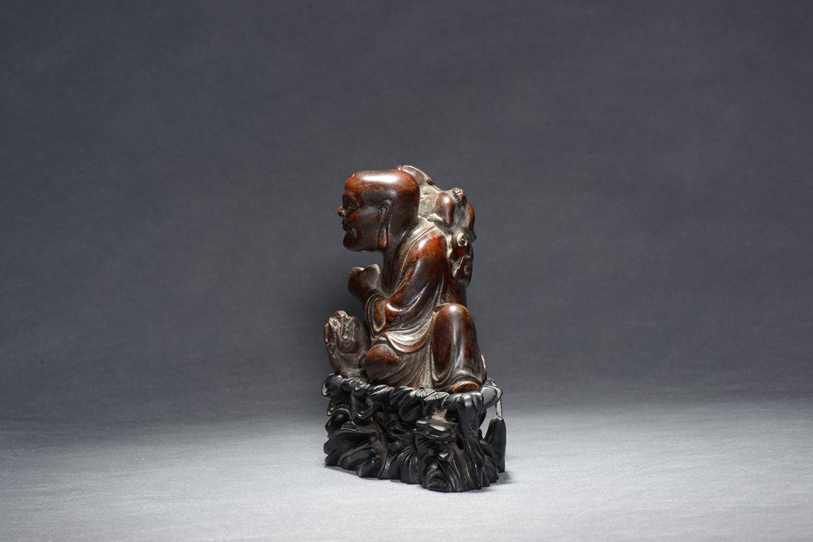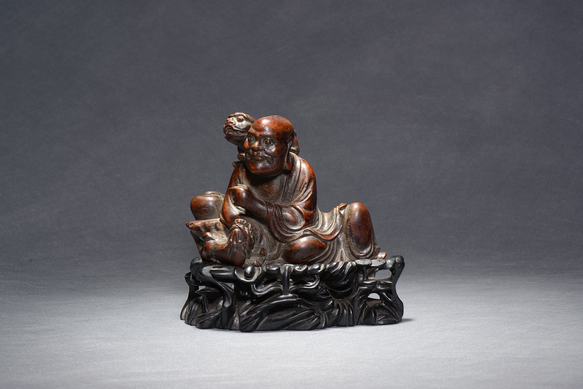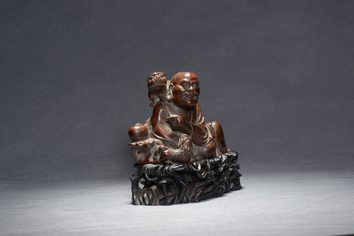 Carved with the 'Taming Tiger' arhat seated casualy with left leg raised, with one lion cub with head turned upward looking upon him and the other on his back, his face with joyful expression, all supported on zitan stand.