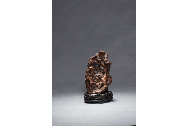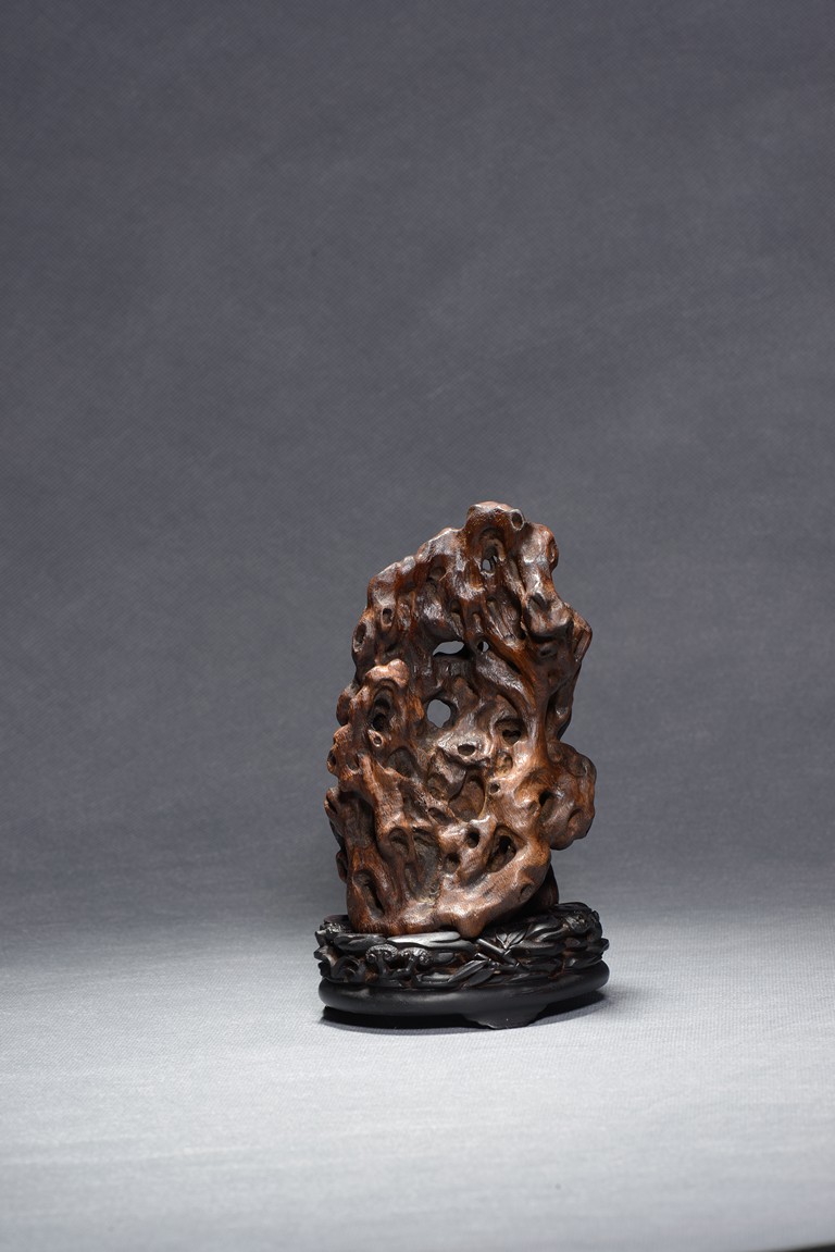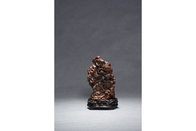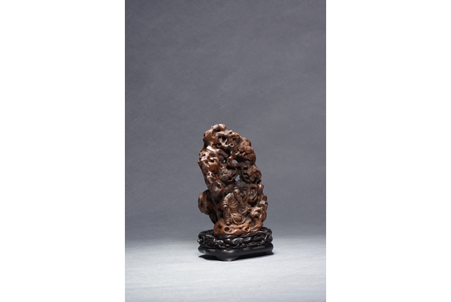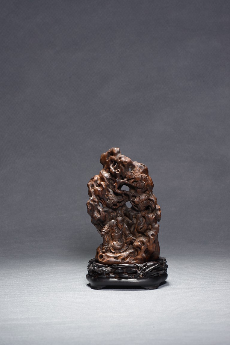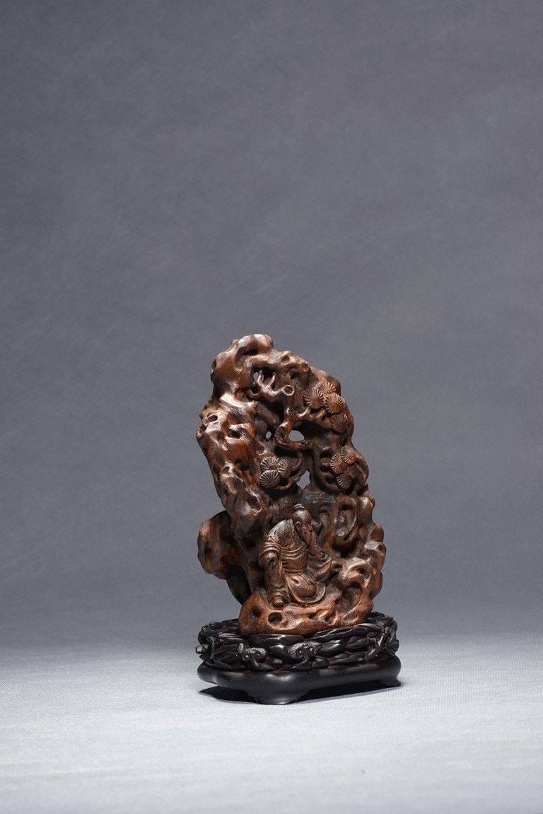 Carved with an elderly literati seated casually under a large upright rockwork, with pine tree issuing from the crevices, all supported on zitan stand. Qing Dynasty period.