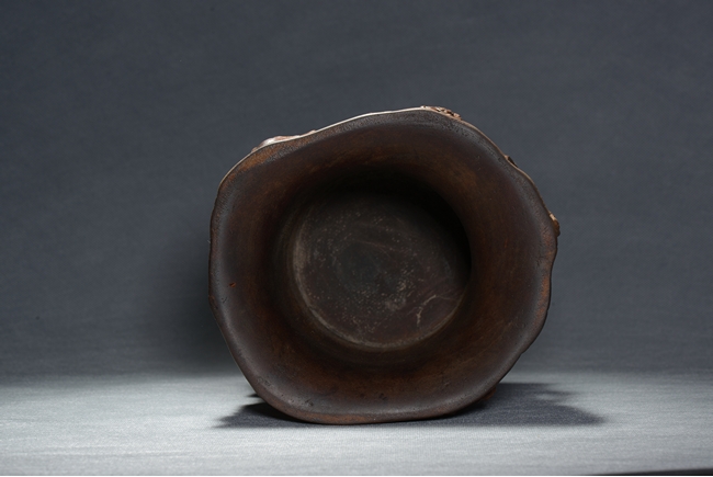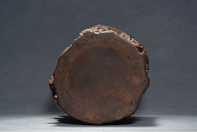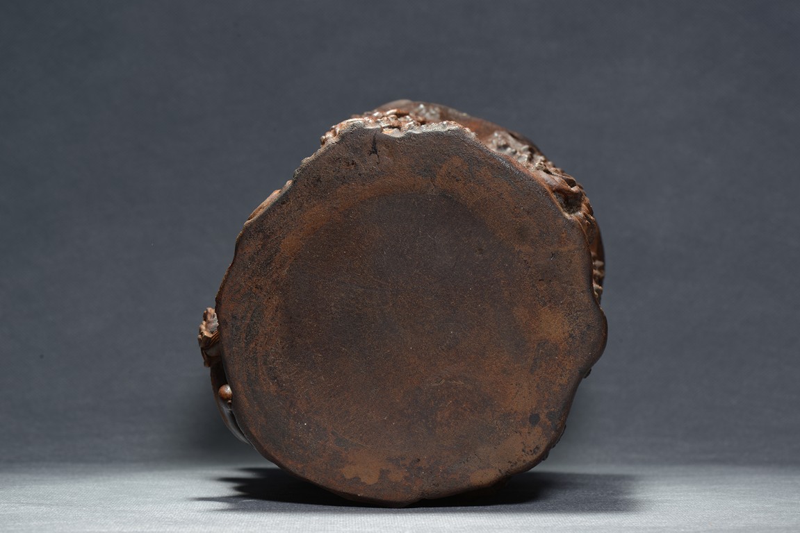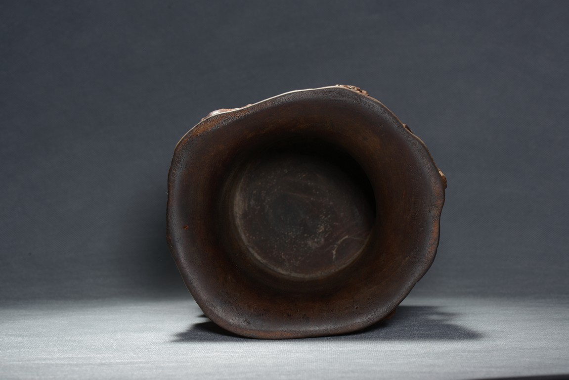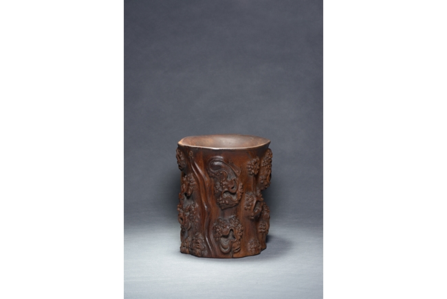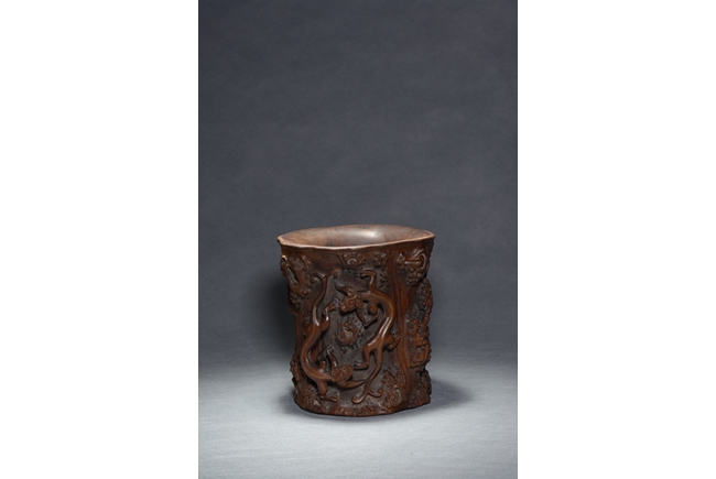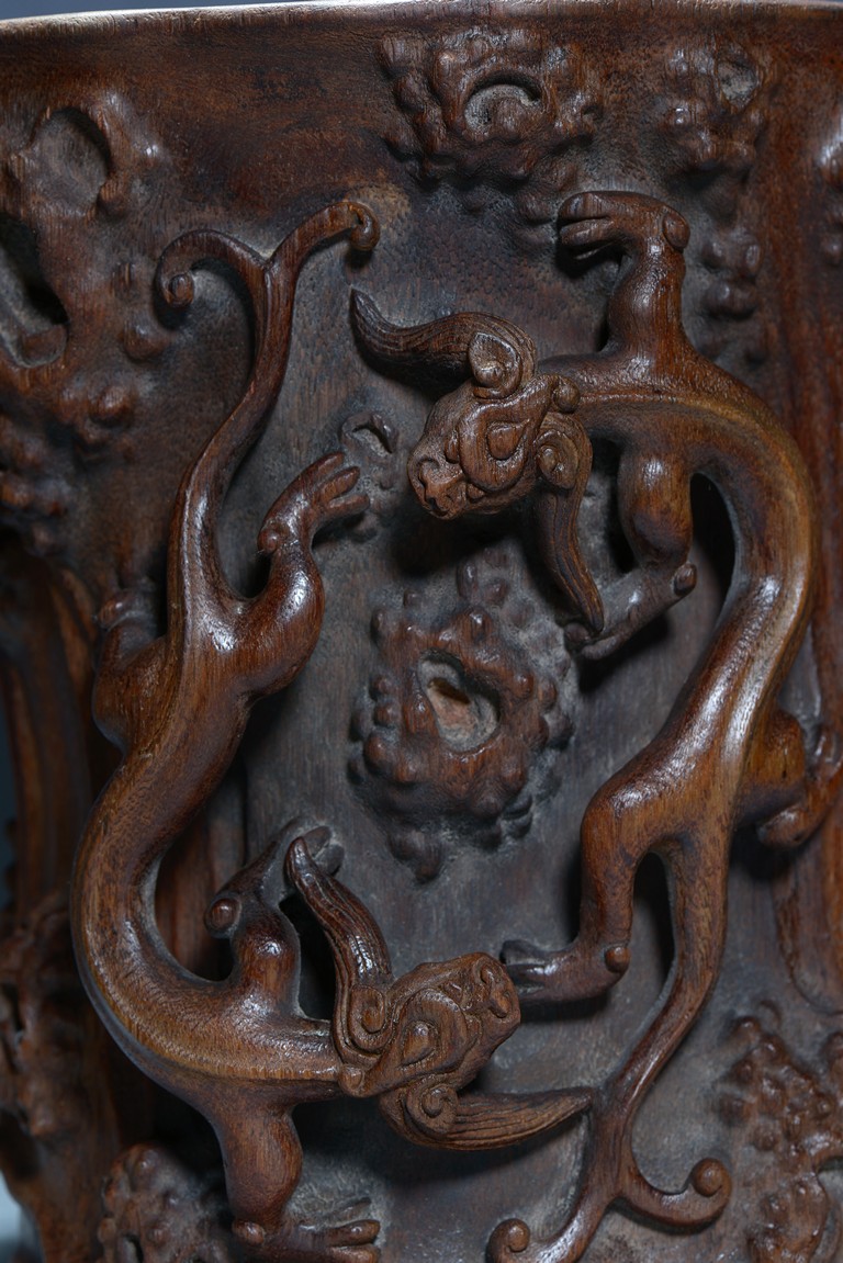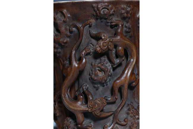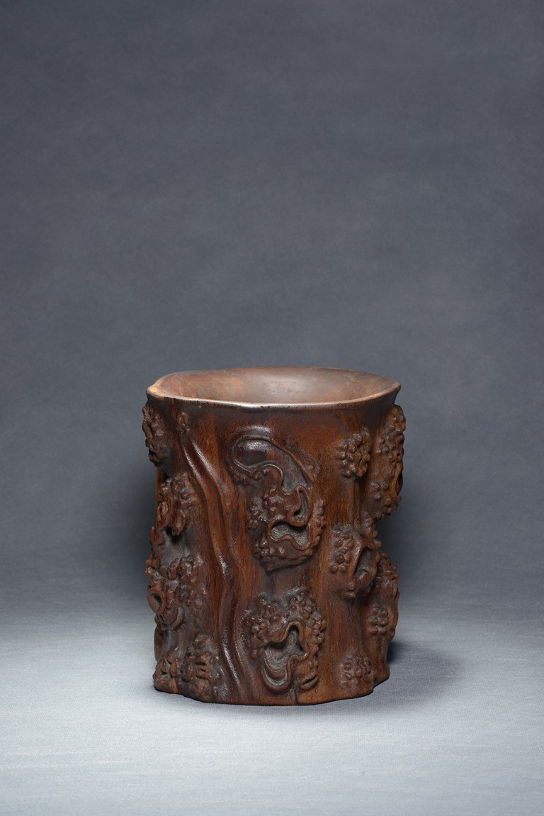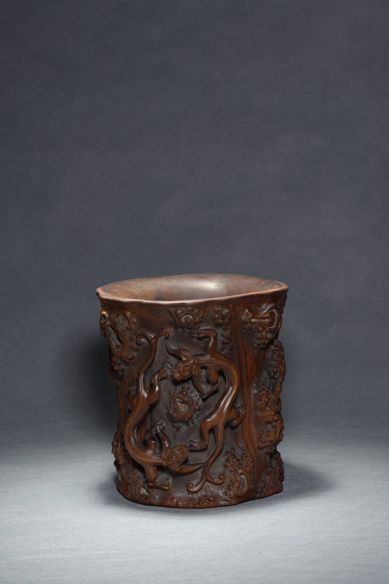 Carved in the form of a large brushpot, the side finely modelled with two winding chilong in high relief, the body with irregular crevices. Qing Dynasty period.