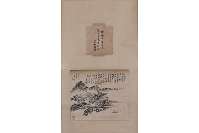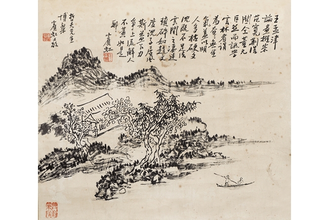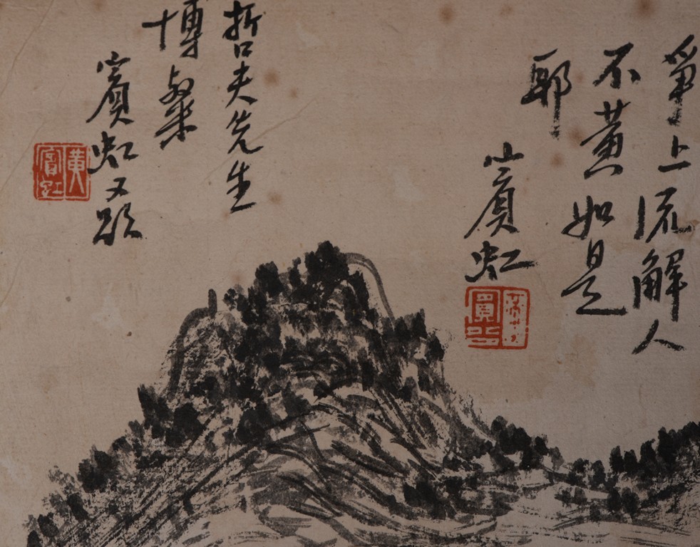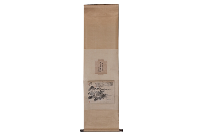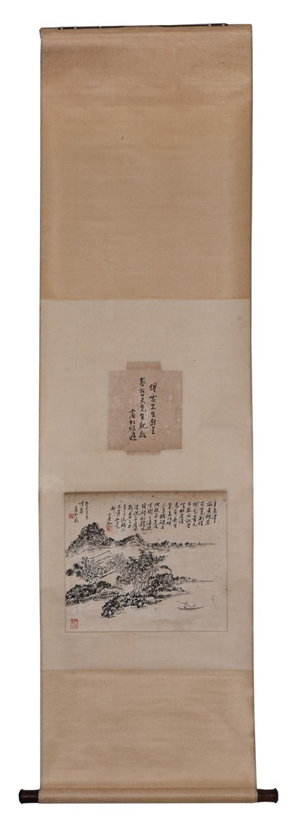 Ink on paper. Landscape. Hanging scroll. Inscribed, signed, and with three seals of the artist.