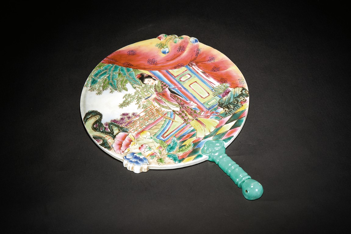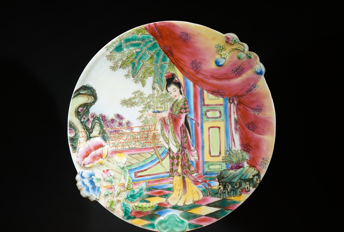 The panel is finely painted in famille rose with an beauty holding a dish at indoor setting, with rockwork and trees to the distance. Republic period.