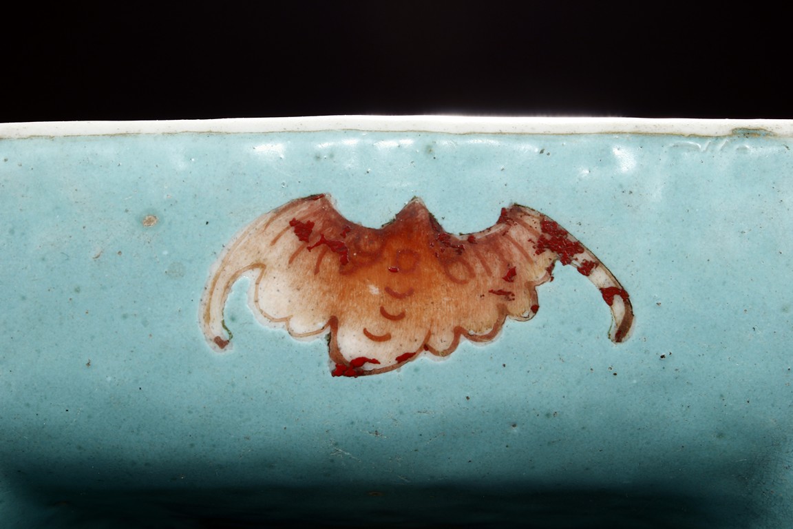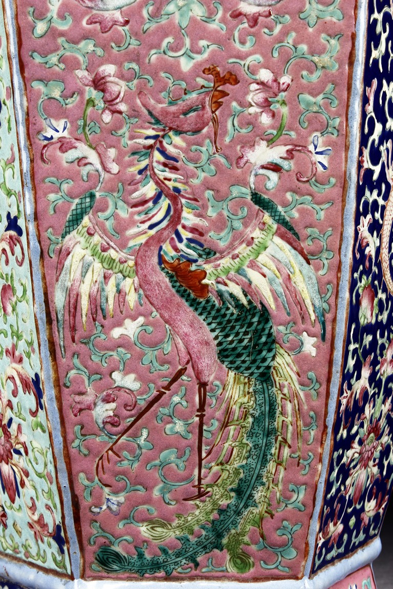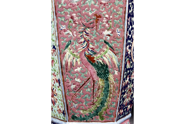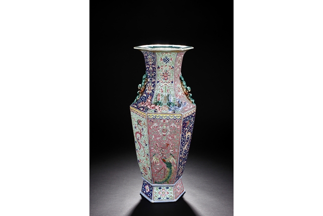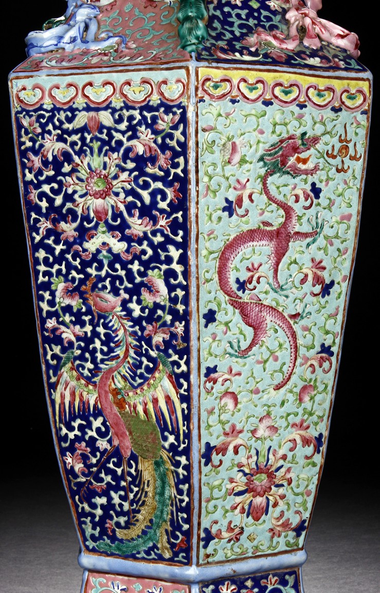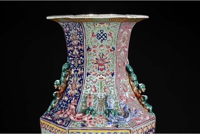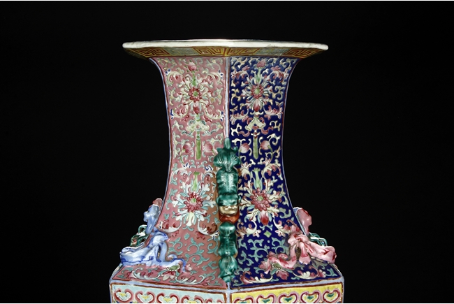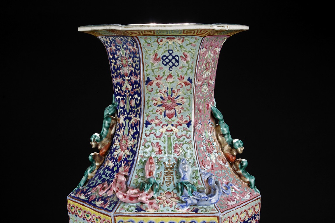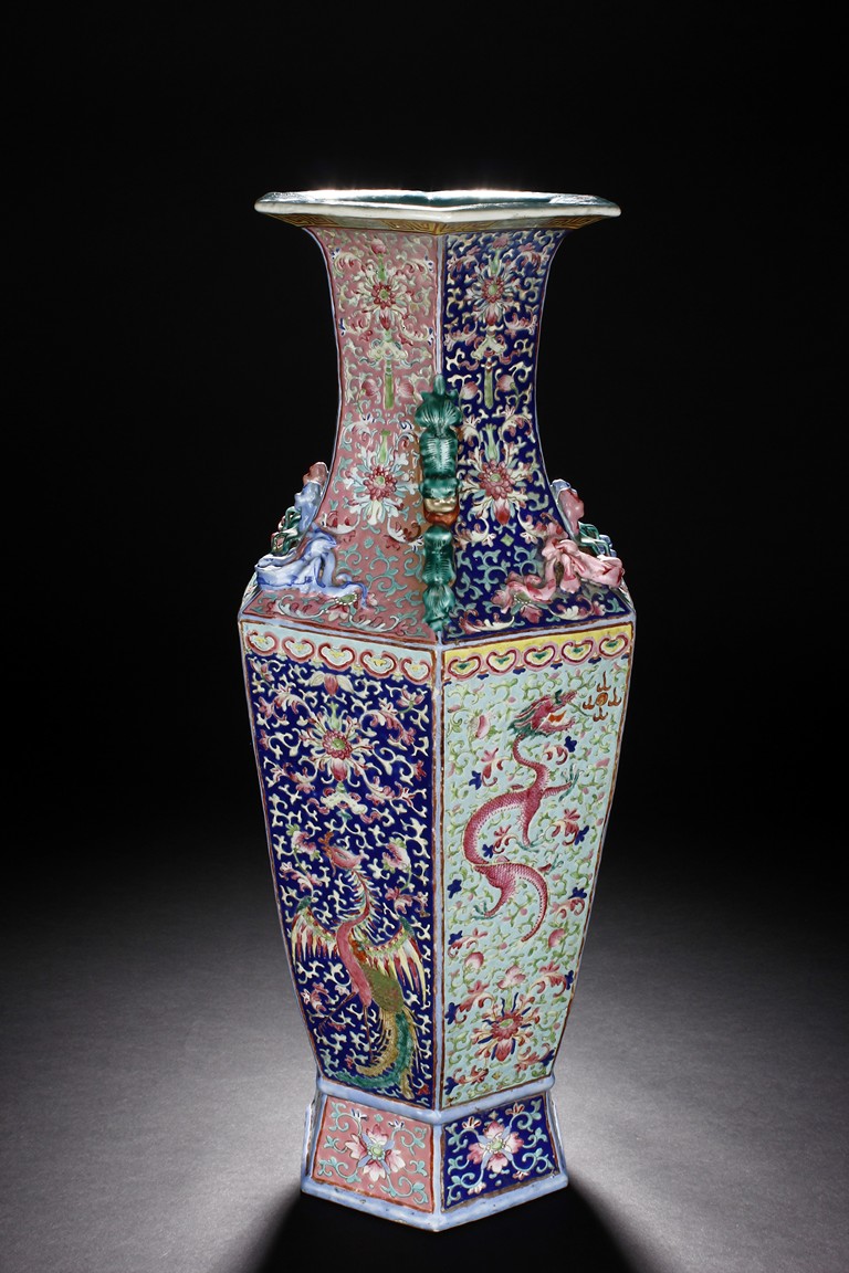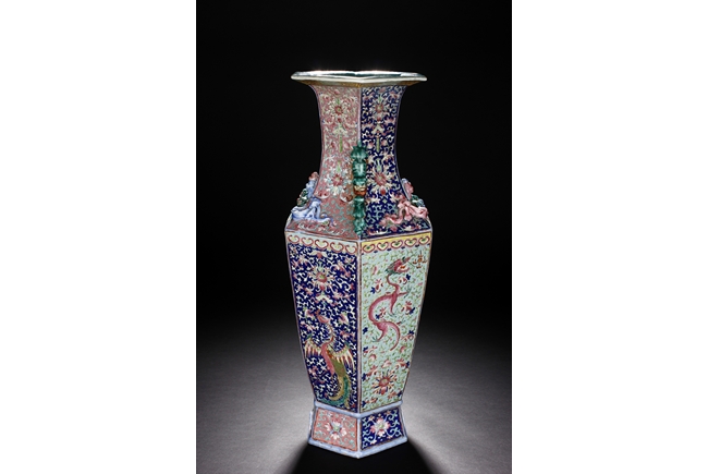 The body is of hexagonal shape with six panels, each of alternating blue, turquoise, and red ground with dragon, phoenix motif. The neck carved with chilong mythical beasts to exterior. The interior of neck is enamelled with three auspicious bats reserved on turquoise ground.Late Qing Dynasty period.