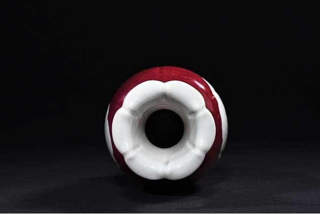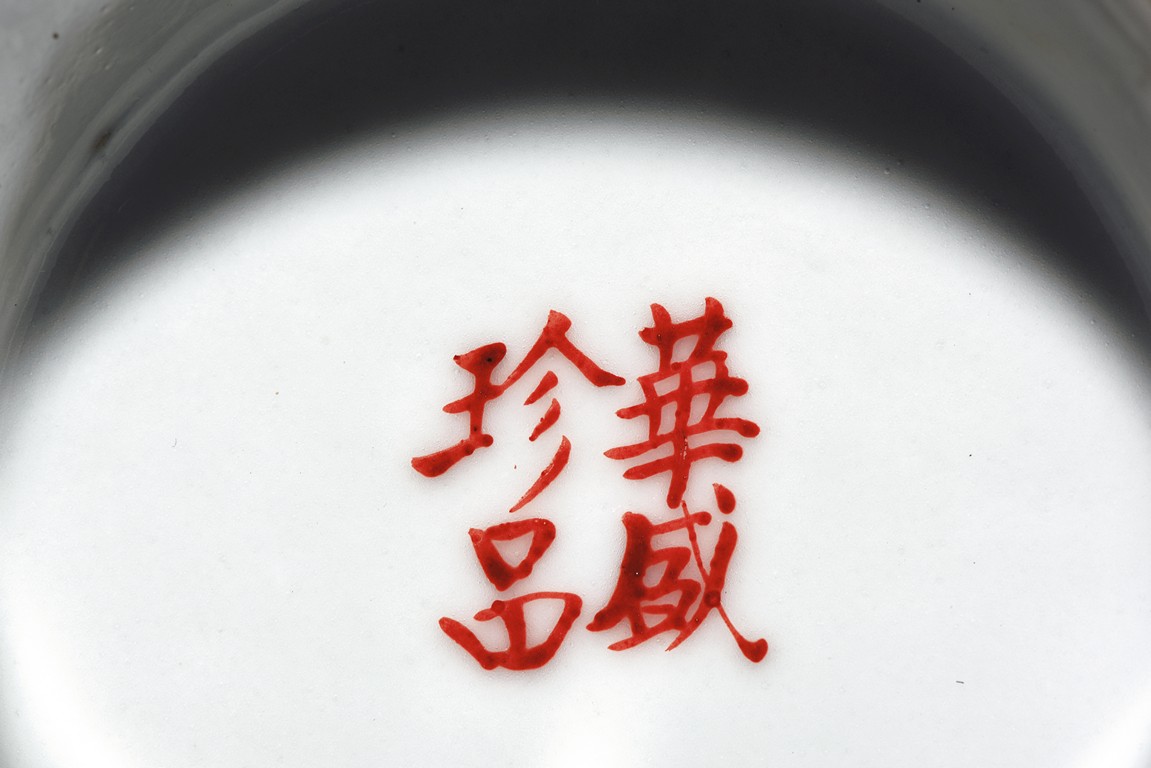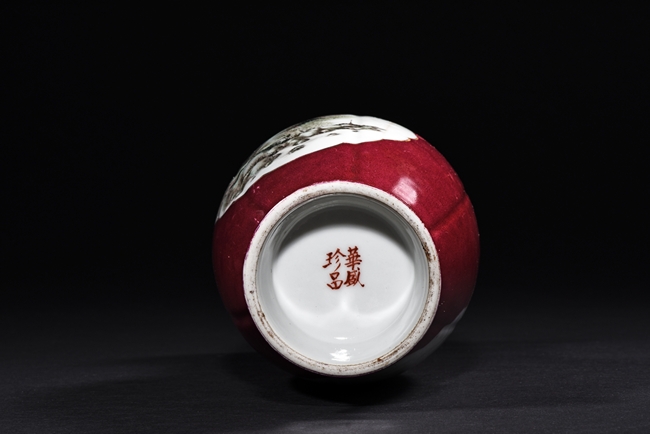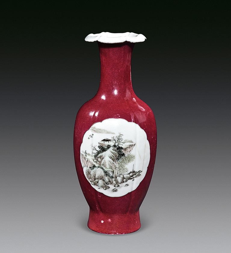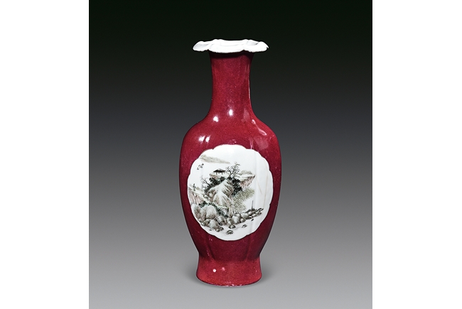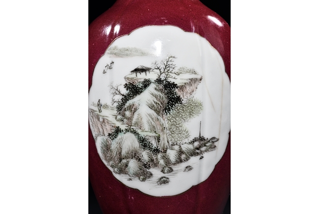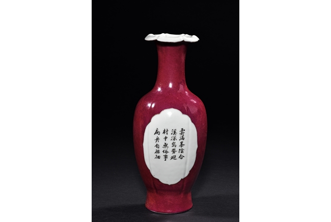The vase rises to a widely flared rim with six lobes, the body covered in red glaze with two medallions on both sides enclosing a landscape scene and semi-cursive poem. The bottom bears four character mark 'hua sheng zhen pin'.
