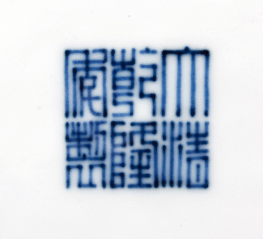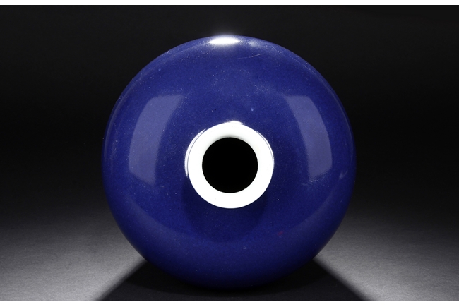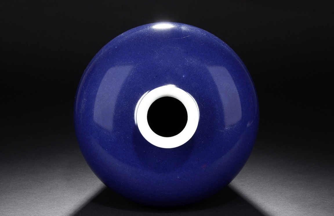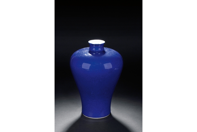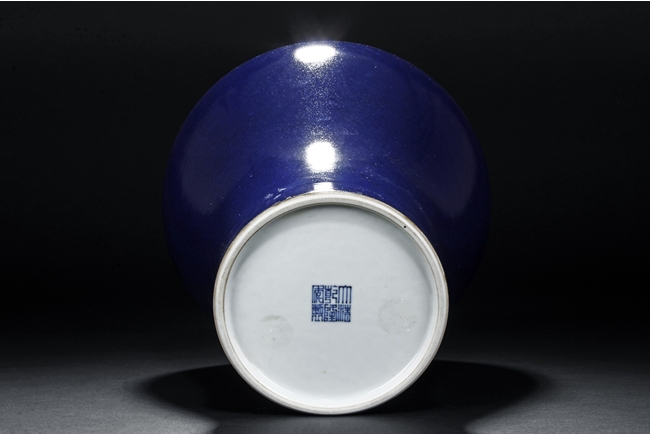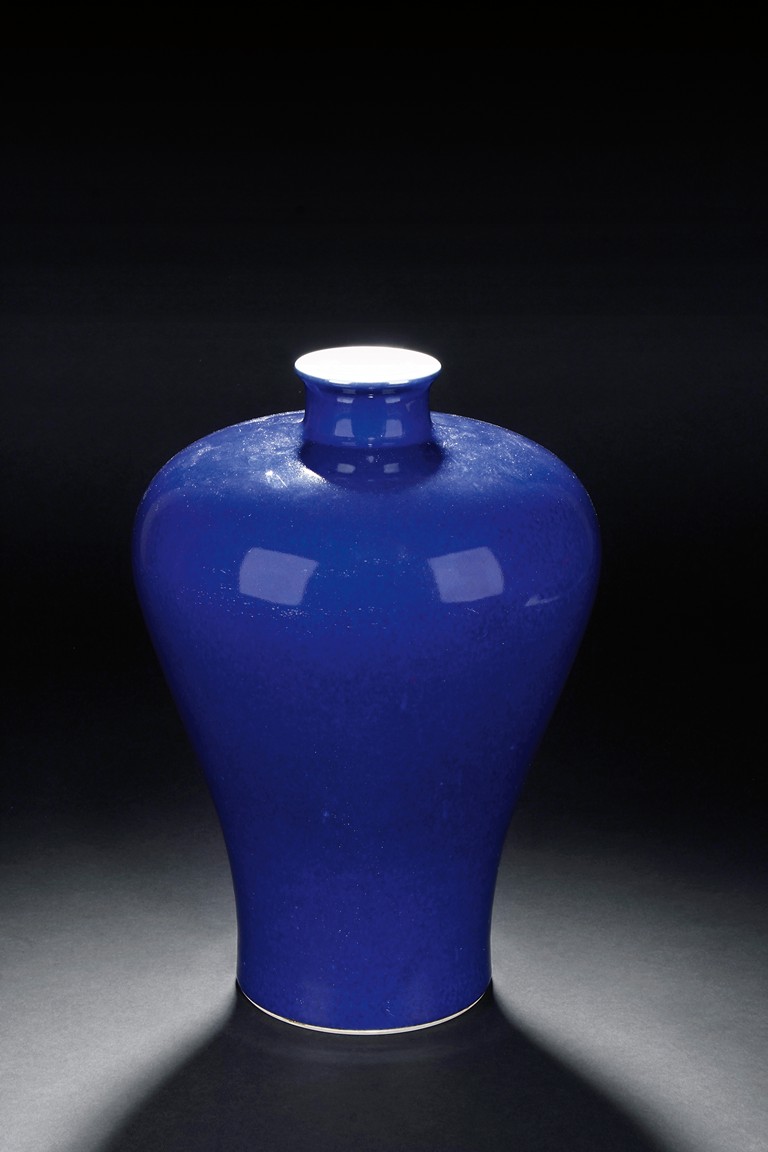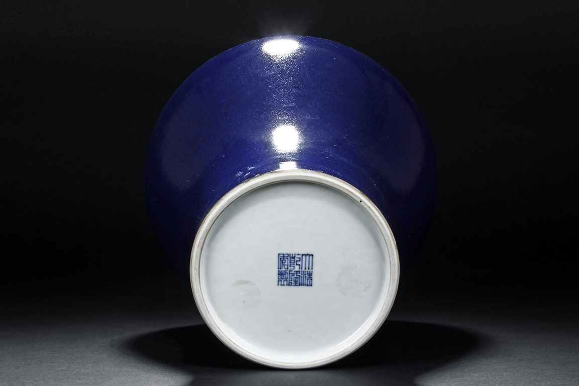 Covered in brilliant cobalt-blue and stopping neatly above rim, the meiping vase has a high and wide rounded shoulder, elegantly tapering to slightly splayed feet, the interior and bottom glazed in white, and bottom bears six character "DAQING QIANLONG NIANZHI" mark. Qing Qianlong Dynasty period.