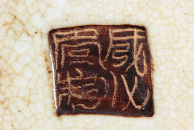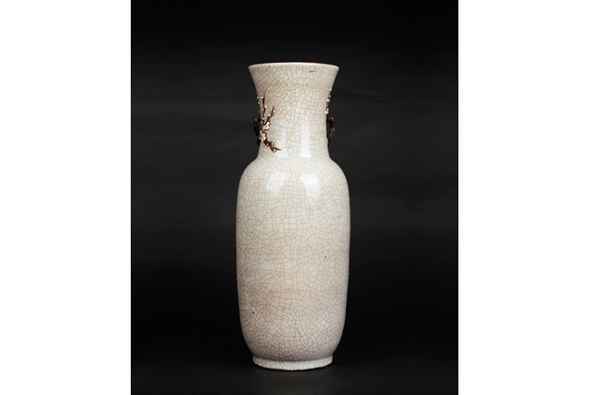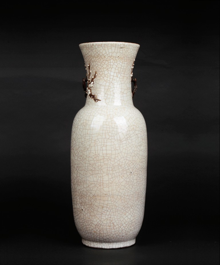 Of cylindrical form, the vase is raised on a straight foot and molded with a pair of prunus flower branch form handles applied to the tall neck, covered overall with an opaque pale grey glaze suffused with an irregular pattern of dark grey crackle, and bottom bears four character 'CHENGHUA' mark. Qing Dynasty period.