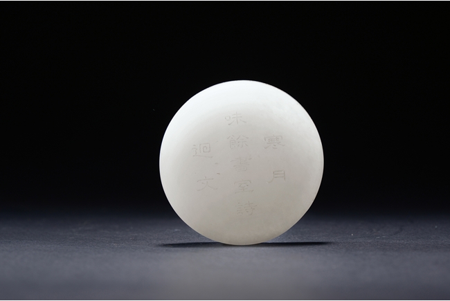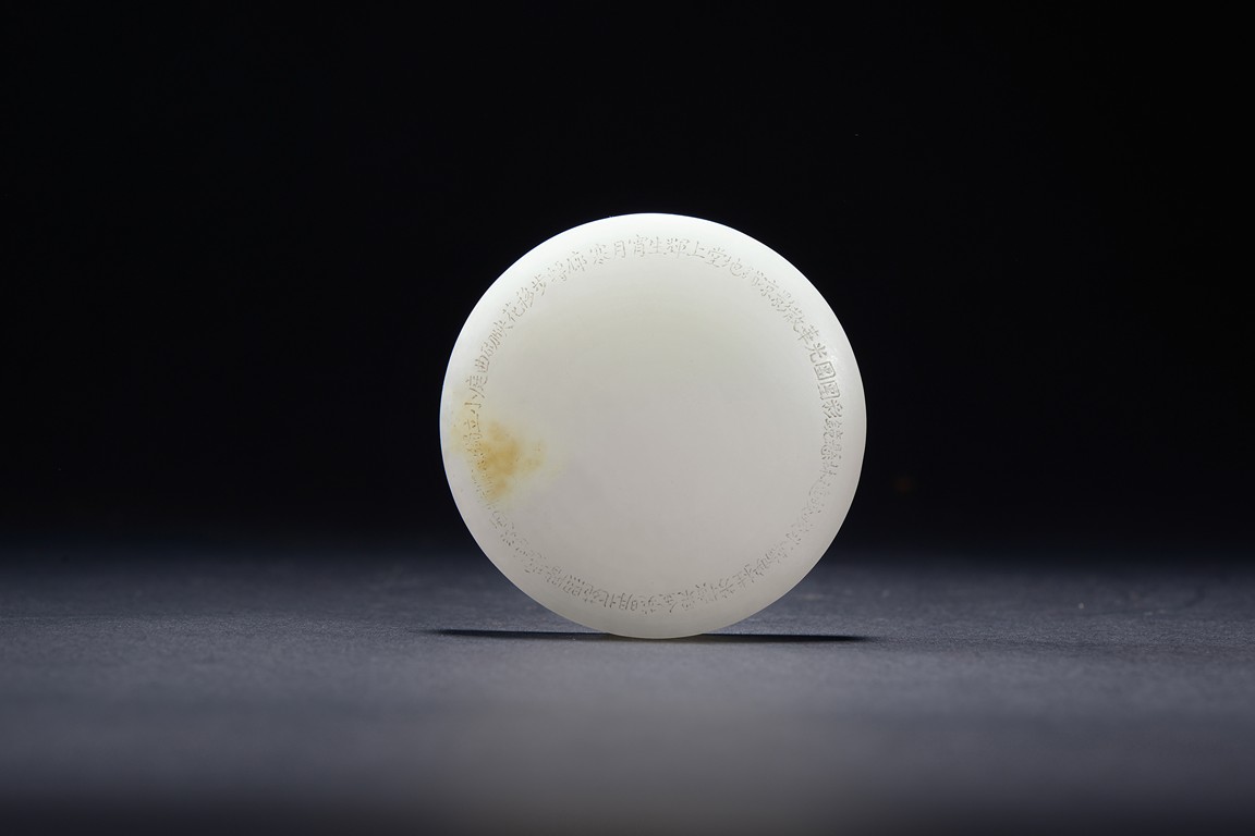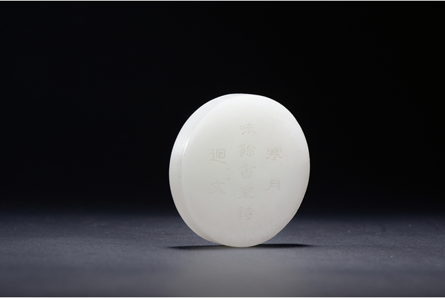 The paper weight is of circular form, one side finely carved with a nine character inscription, the reverse with inscriptions carved in regular script around the outer rim. The stone is of smooth even tone. Qing Dynasty period.