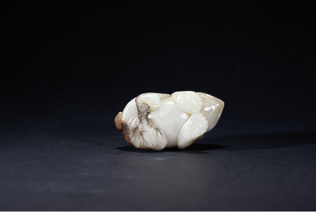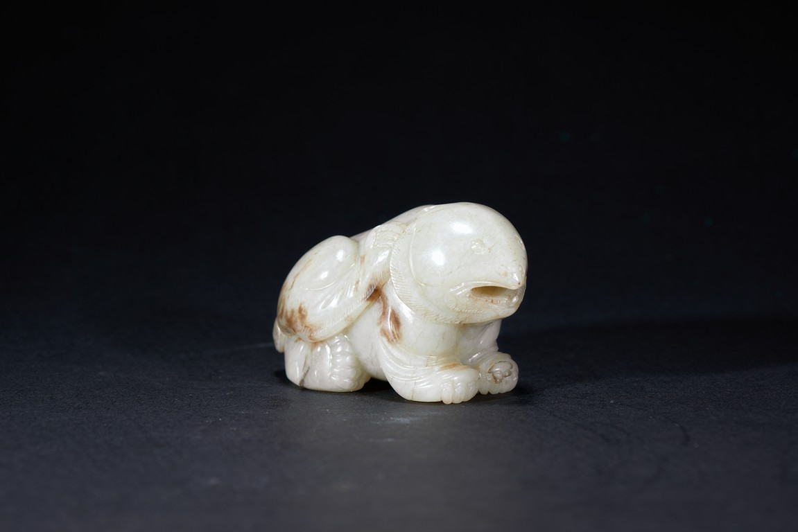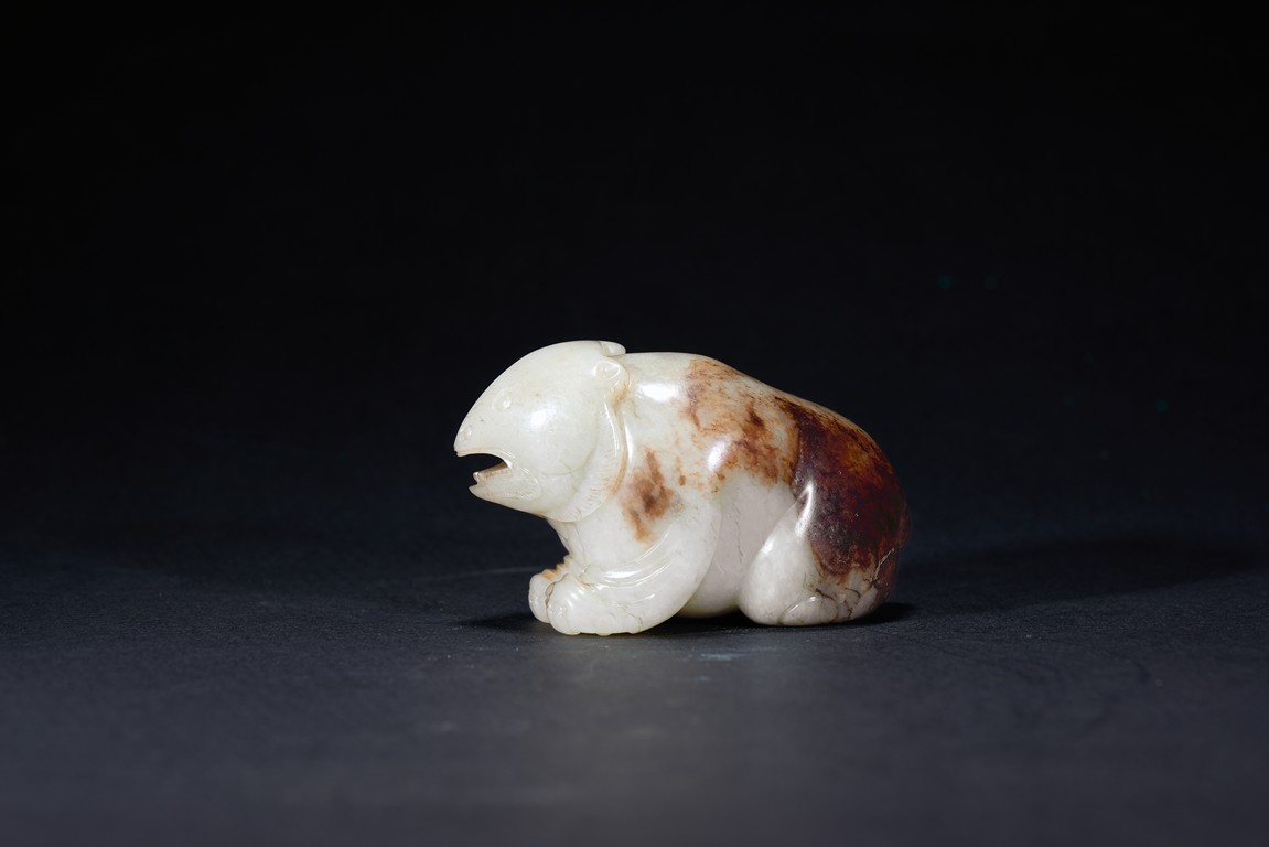The mythical beast is modelled in recumbent position, the mouth open, with rounded eyes and nose, the back with dark russet skin. Qing Dynasty period.