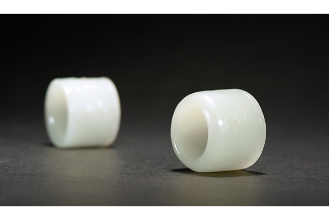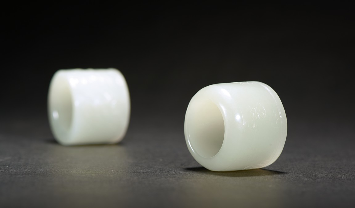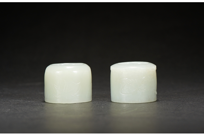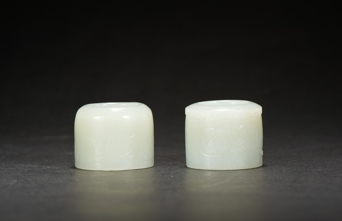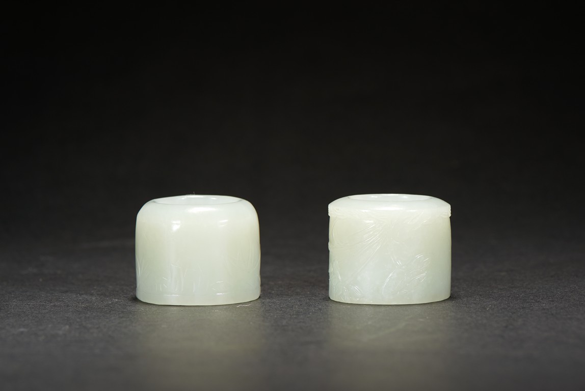Comprising of two archer's rings, each decorated in shallow relief with floral design, the stone is of even smooth white tone. Qing Dynasty period.
