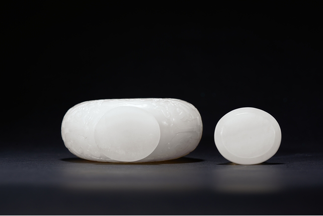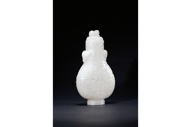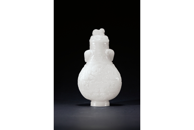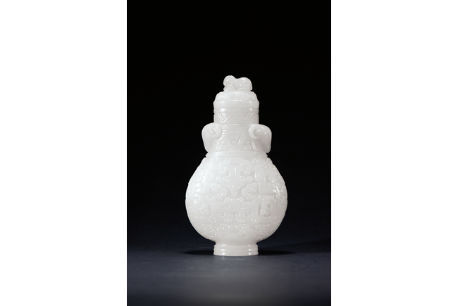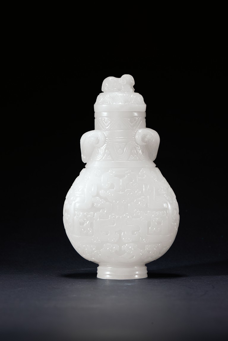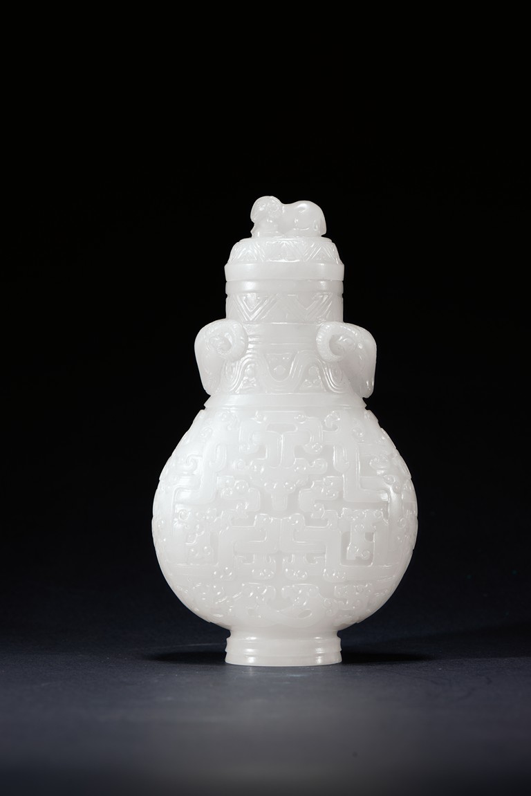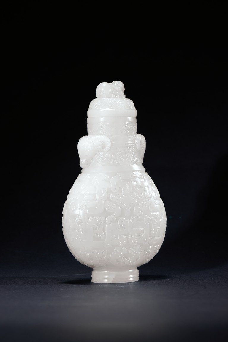 Of baluster form, the rounded body carved with archaistic geometric pattern, the neck with bands of sinuous pattern, flanked by two ram heads, the final topped with ram finial. The stone is of smooth even white tone. Qing Dynasty period.