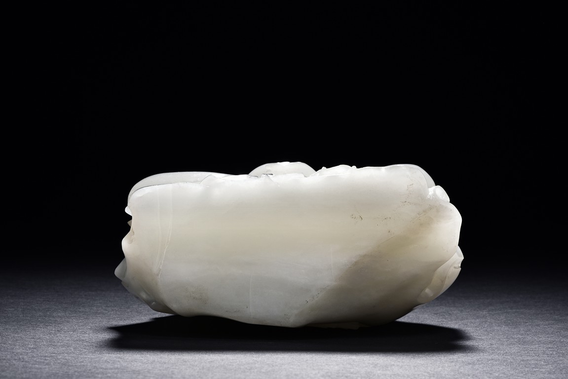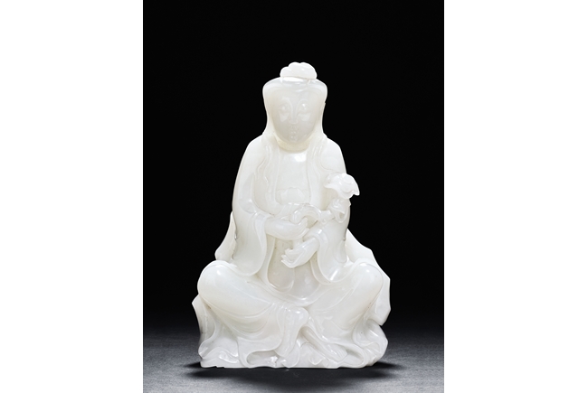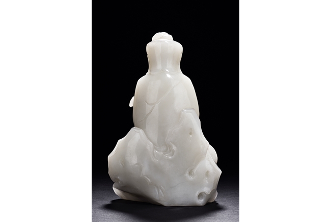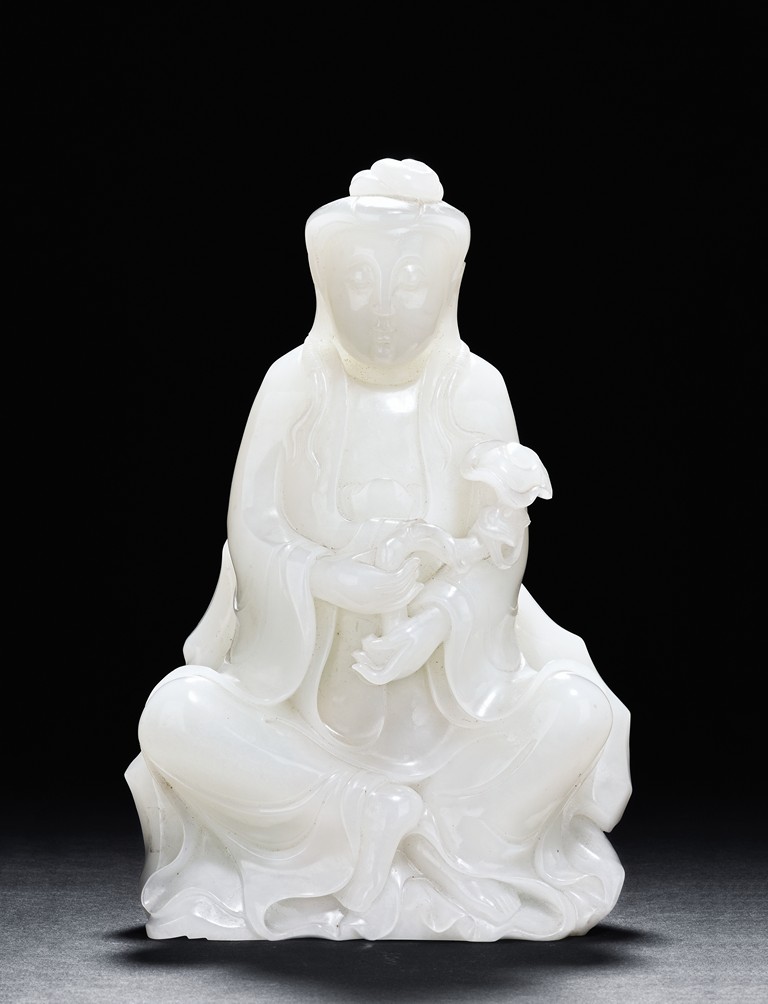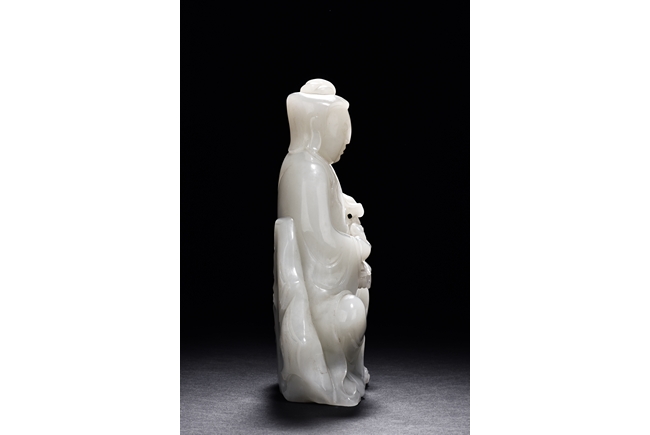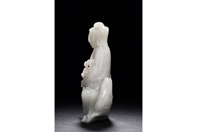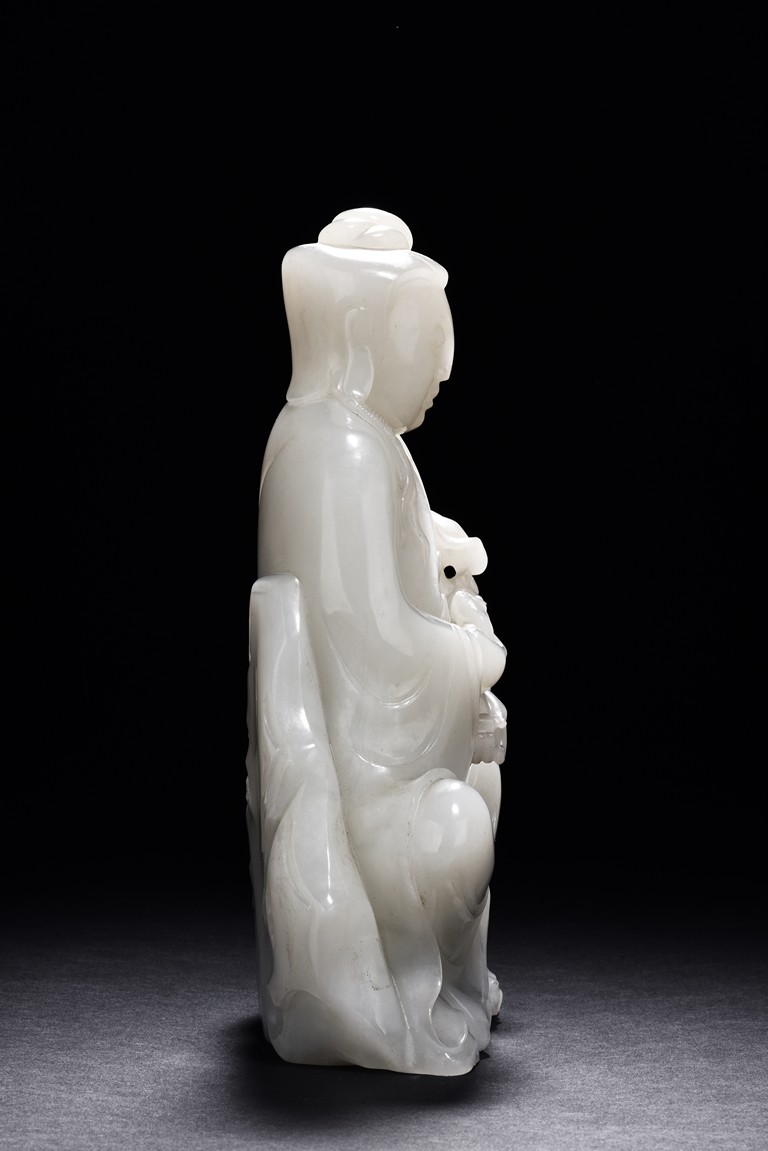 The Guanyin is shown seated upon a rock, with one feet resting upon a lotus flower, both hands holding a lingzhi ruyi scepter, She wears a gracefully loose and voluminous robe and her face is depicted with a benevolent and serene expression. Her hair is tied into an artfully topknot and covered in veil.