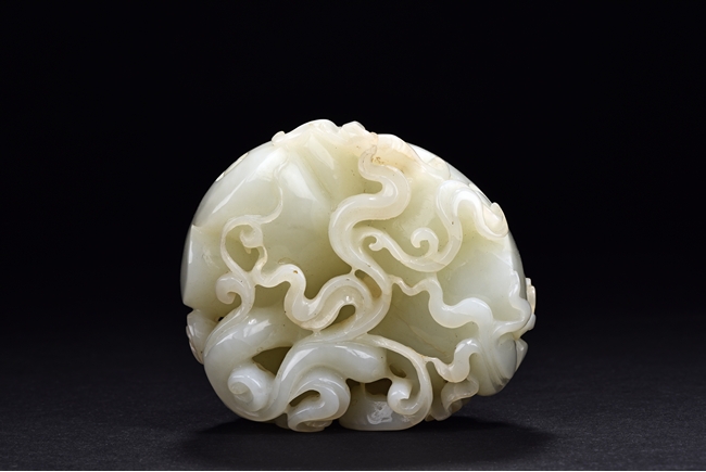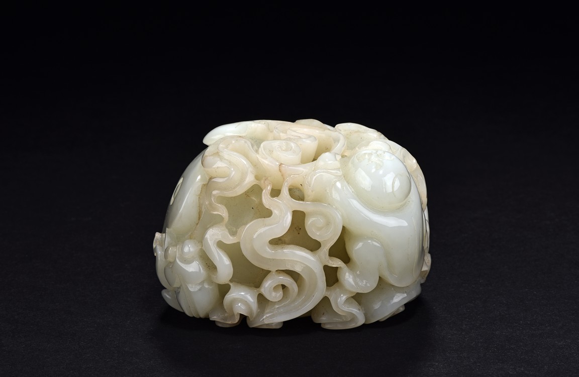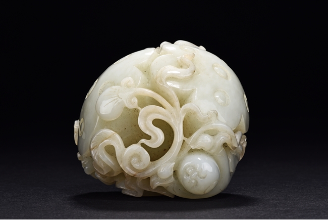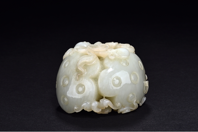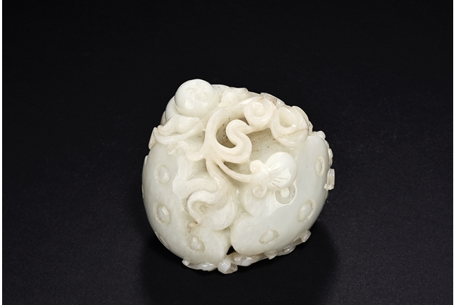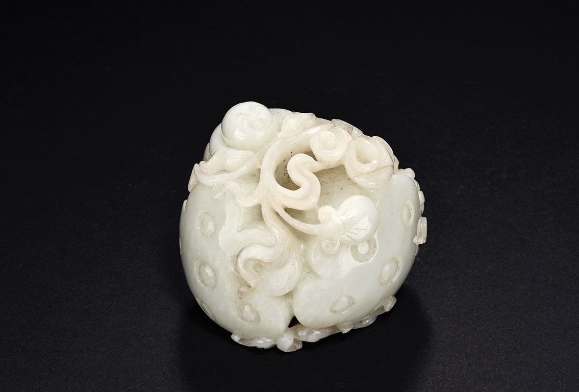 Of globular form, the jade is carved with a smilling boy lying upon two large lotus seedpods in openwork with scrolling leafy branches.
