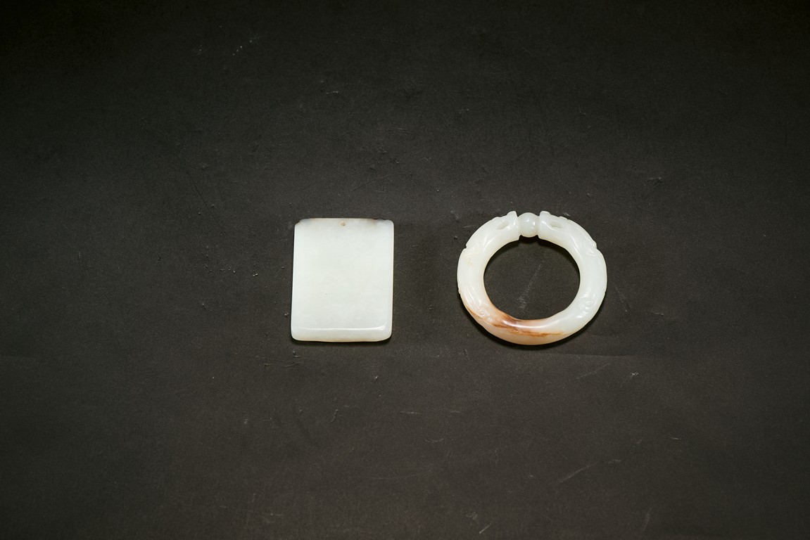 Including a small white jade bangle modelled as two dragon heads flanking a ball, the jade is even white tone with russet skin; a rectangular white jade plaque with incised figure. Qing Dynasty period.