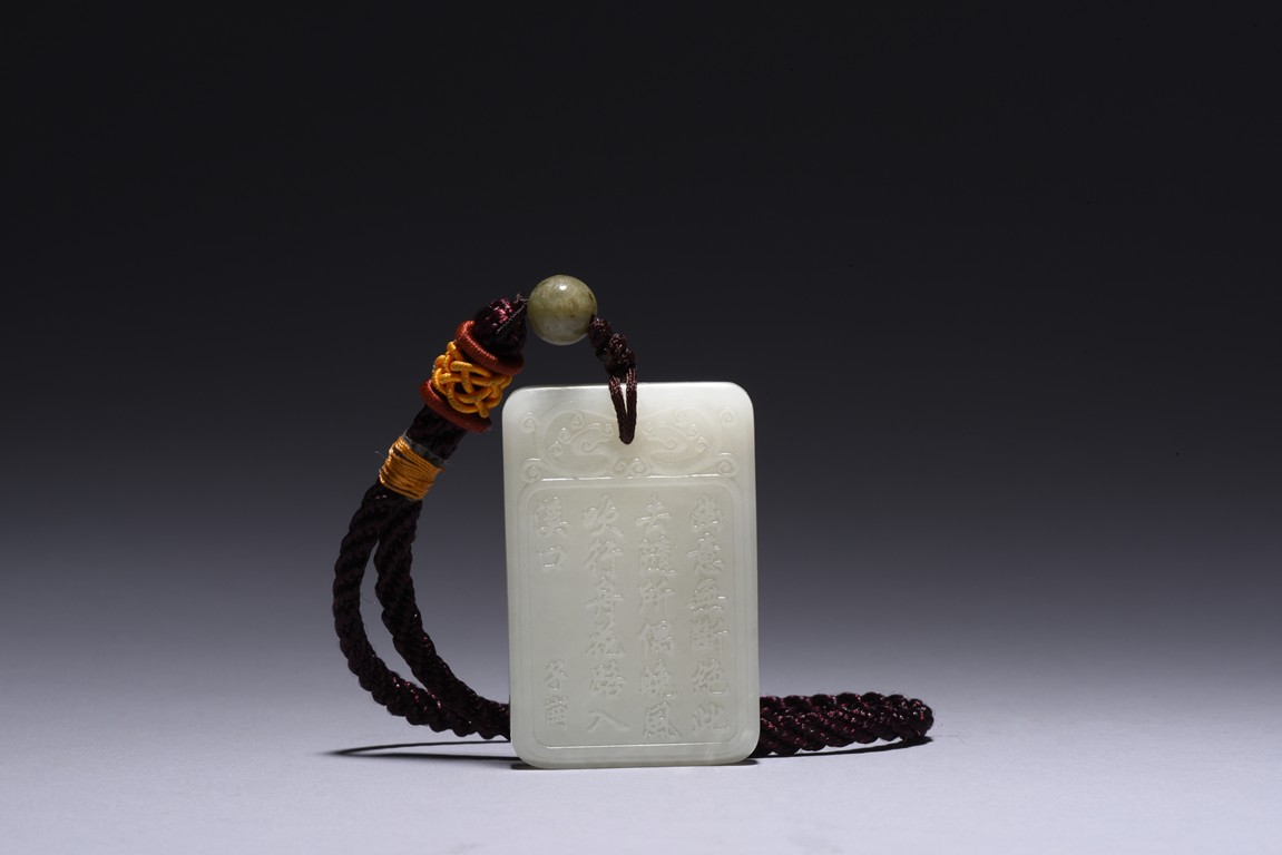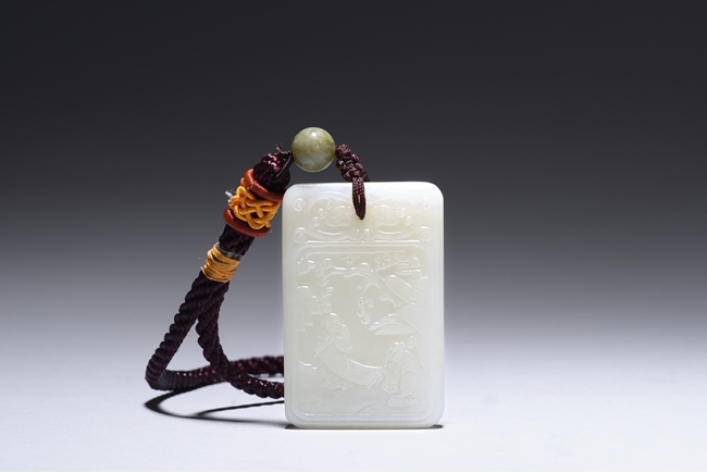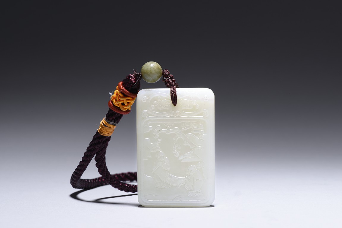 Of rectangular form, one side finely carved in shallow relief with two elderly gentlemen appreacting a scroll painting under a pine tree, the reverse carved with poem.