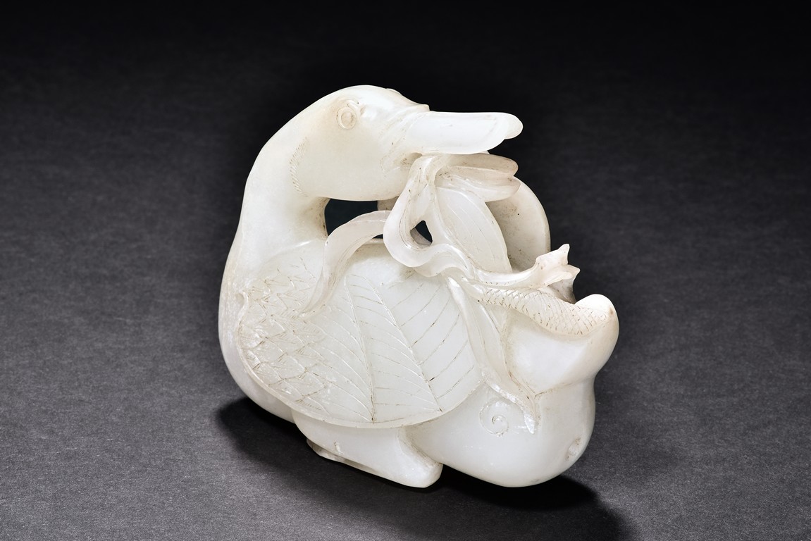 A WHITE JADE CARVED 'DUCK'    白玉雕鴨銜荷花擺件