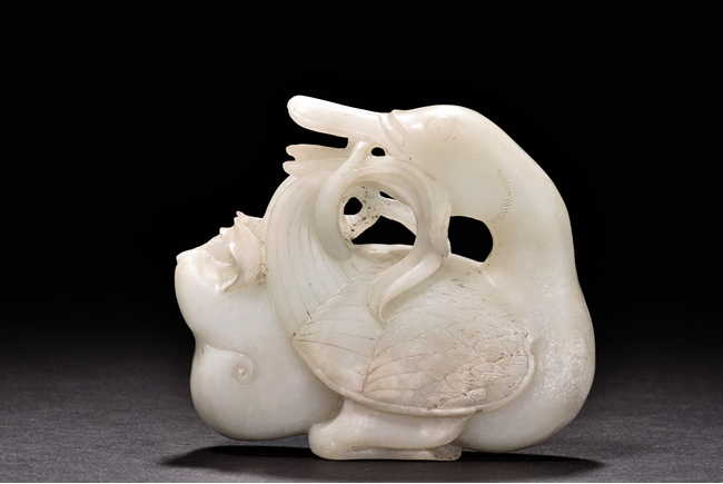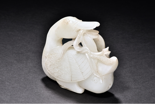 The duck is carved as grasping a branch of millet in its bill, its head facing back, the feathers finely incised and detailed.