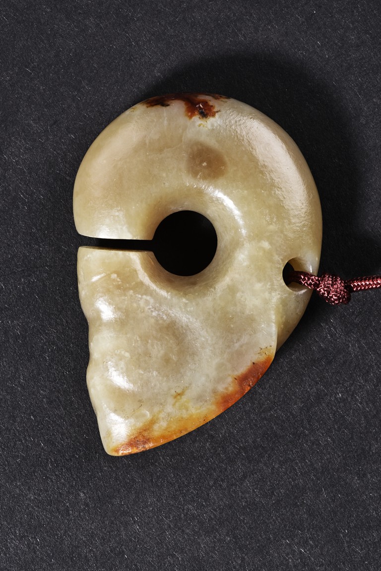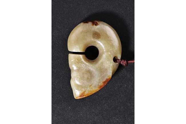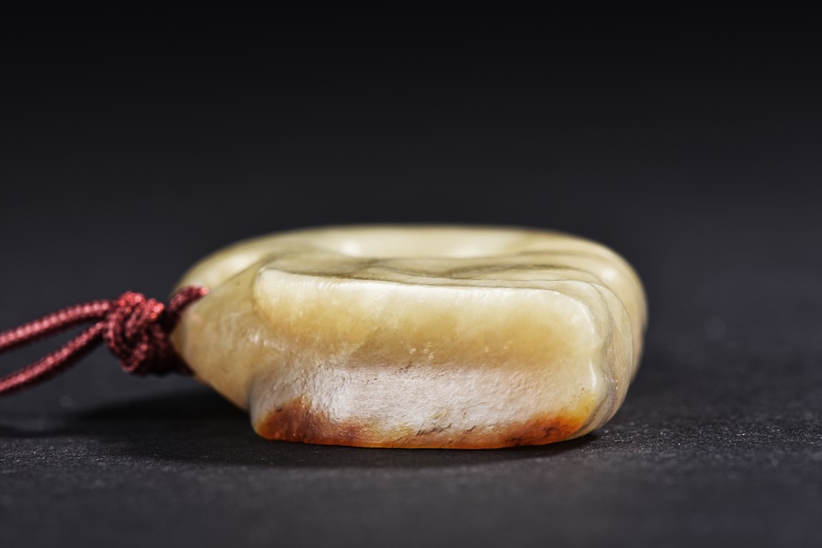The jade is modelled in the form of a stylized dragon, the stone is of ochre tone with russet inclusions and skin.
