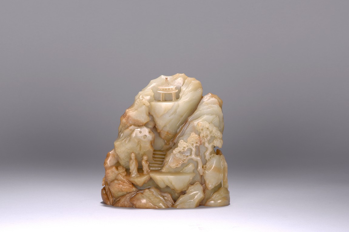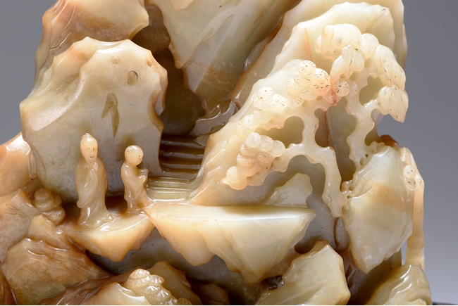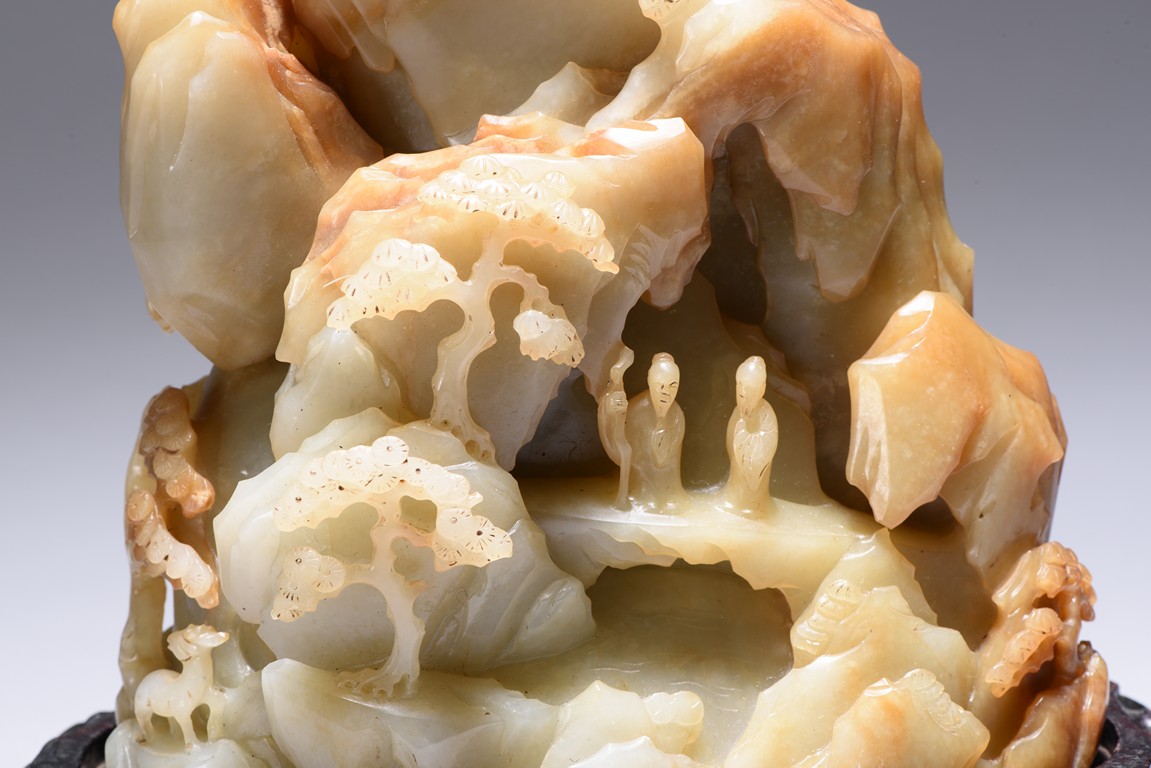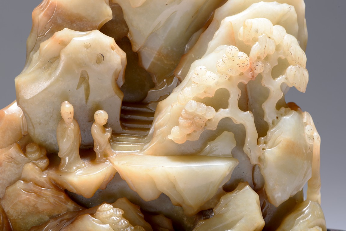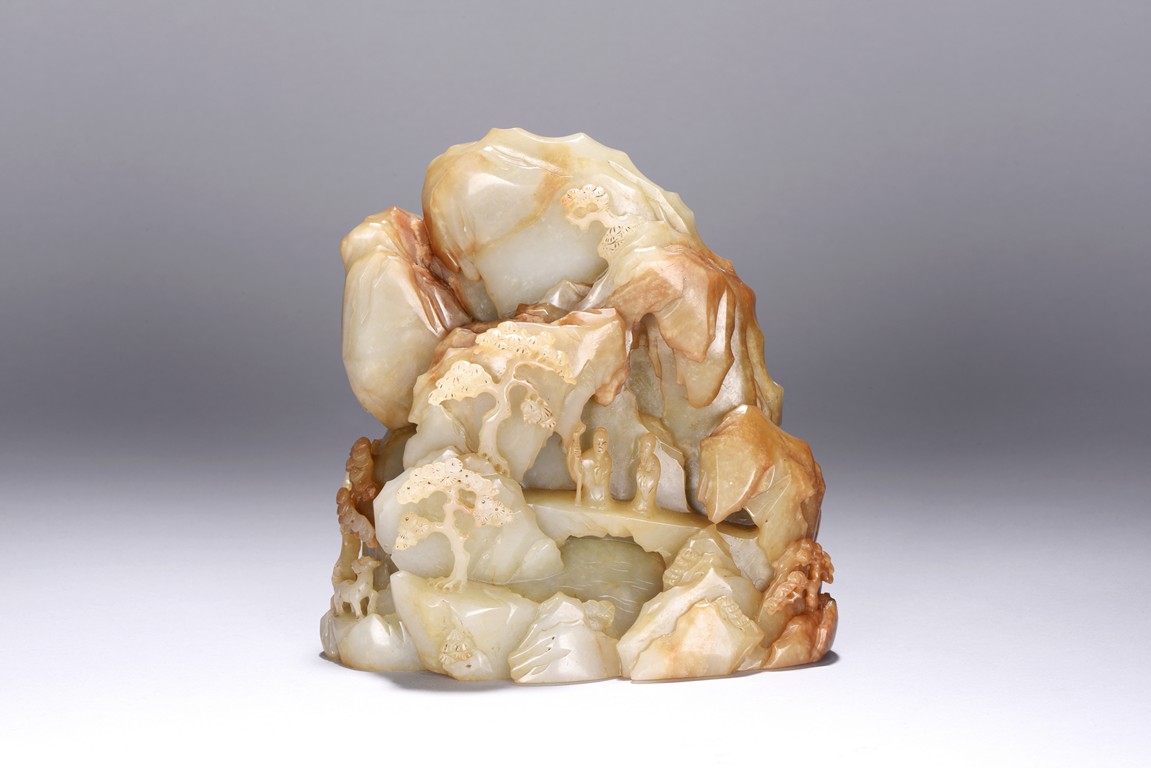 The boulder exquisitely carved to one side with an elderly literati accompanied with a boy attendant walking along a rocky path leading to a pavillion at the top within a deep mountain landscape; the reverse carved with the scene of two elederly literati conversing on a rocky cliff, with gnarled pine trees growing on the nearby rocky outcrops. The stone is of smooth white tone with extensive russet tone skin and areas. Qing Dynasty period.