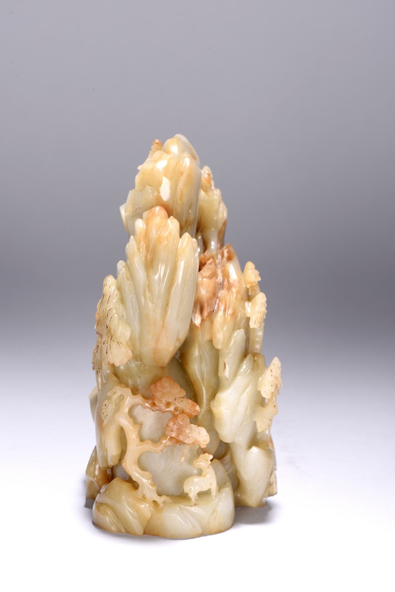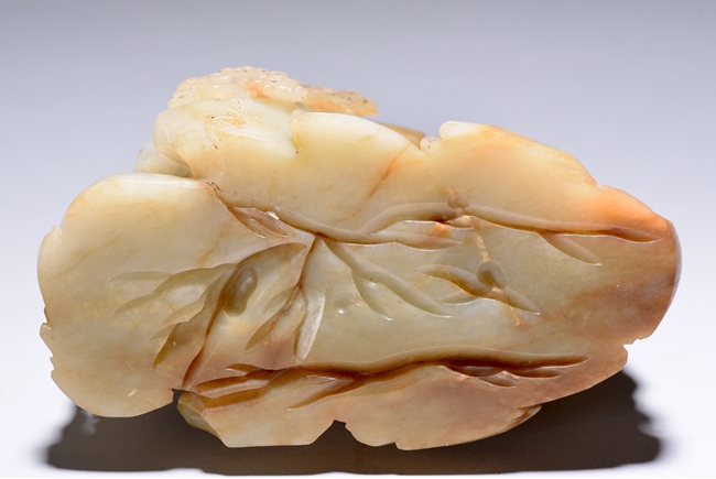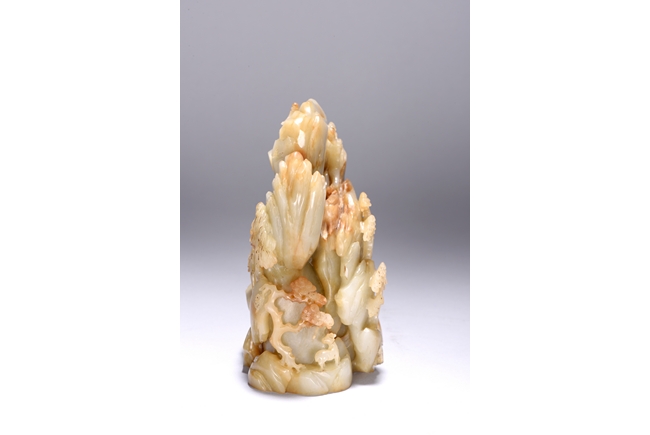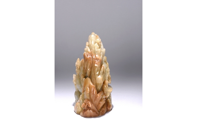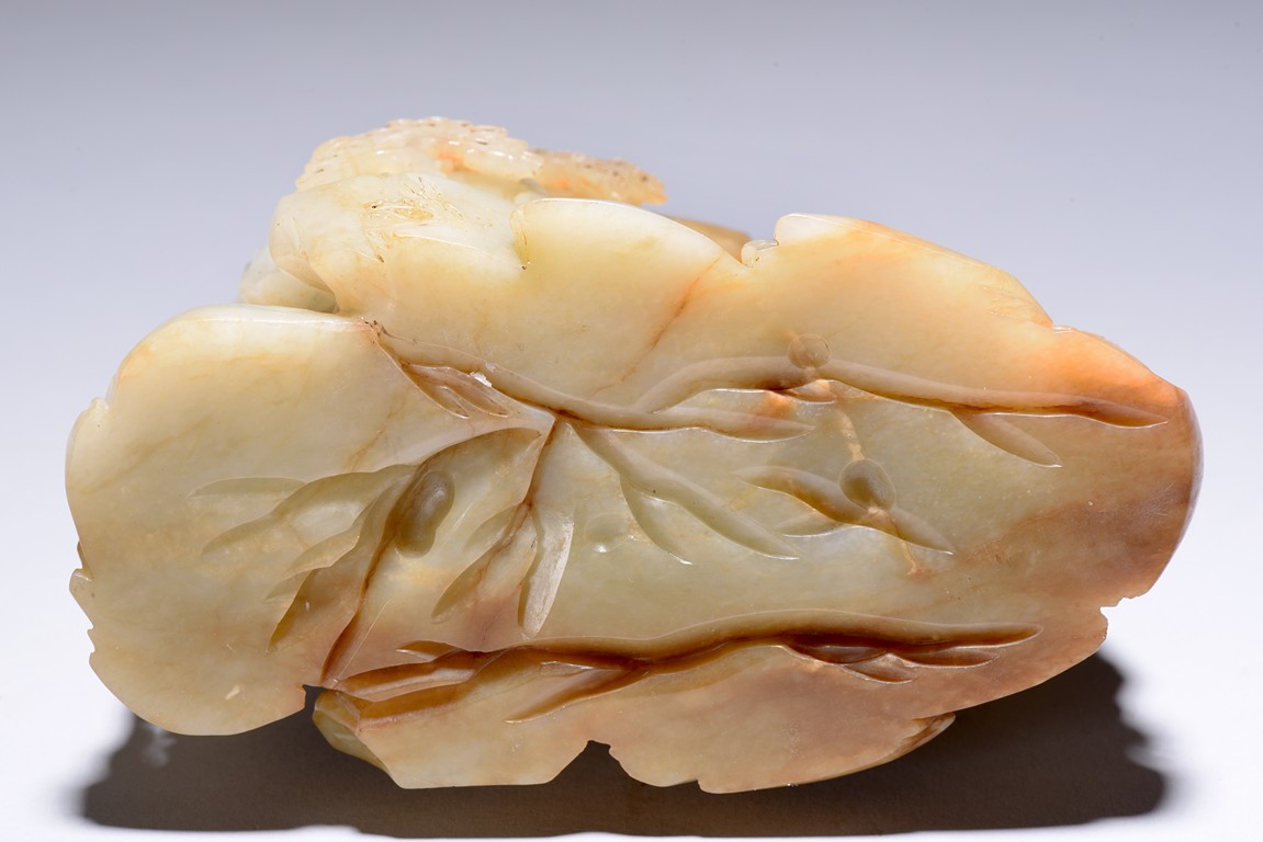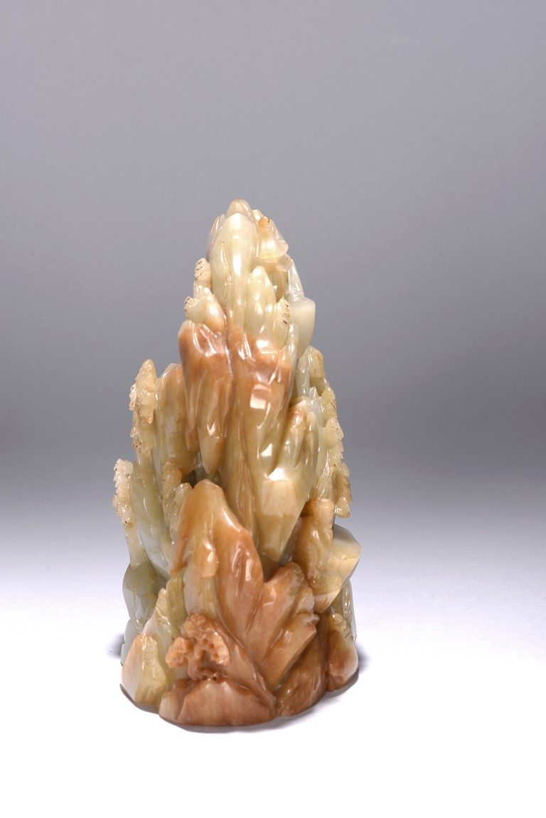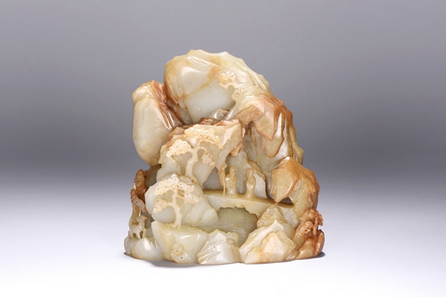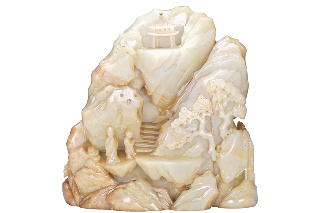 The boulder exquisitely carved to one side with an elderly literati accompanied with a boy attendant walking along a rocky path leading to a pavillion at the top within a deep mountain landscape; the reverse carved with the scene of two elederly literati conversing on a rocky cliff, with gnarled pine trees growing on the nearby rocky outcrops. The stone is of smooth white tone with extensive russet tone skin and areas. Qing Dynasty period.