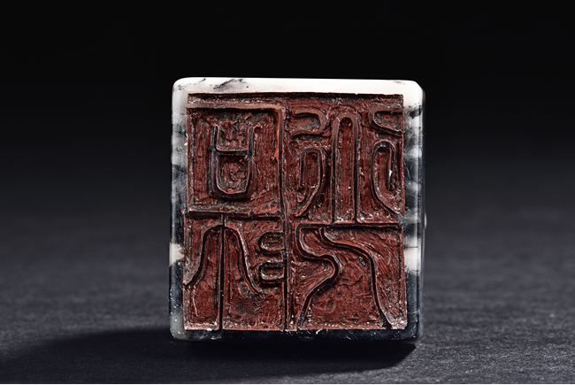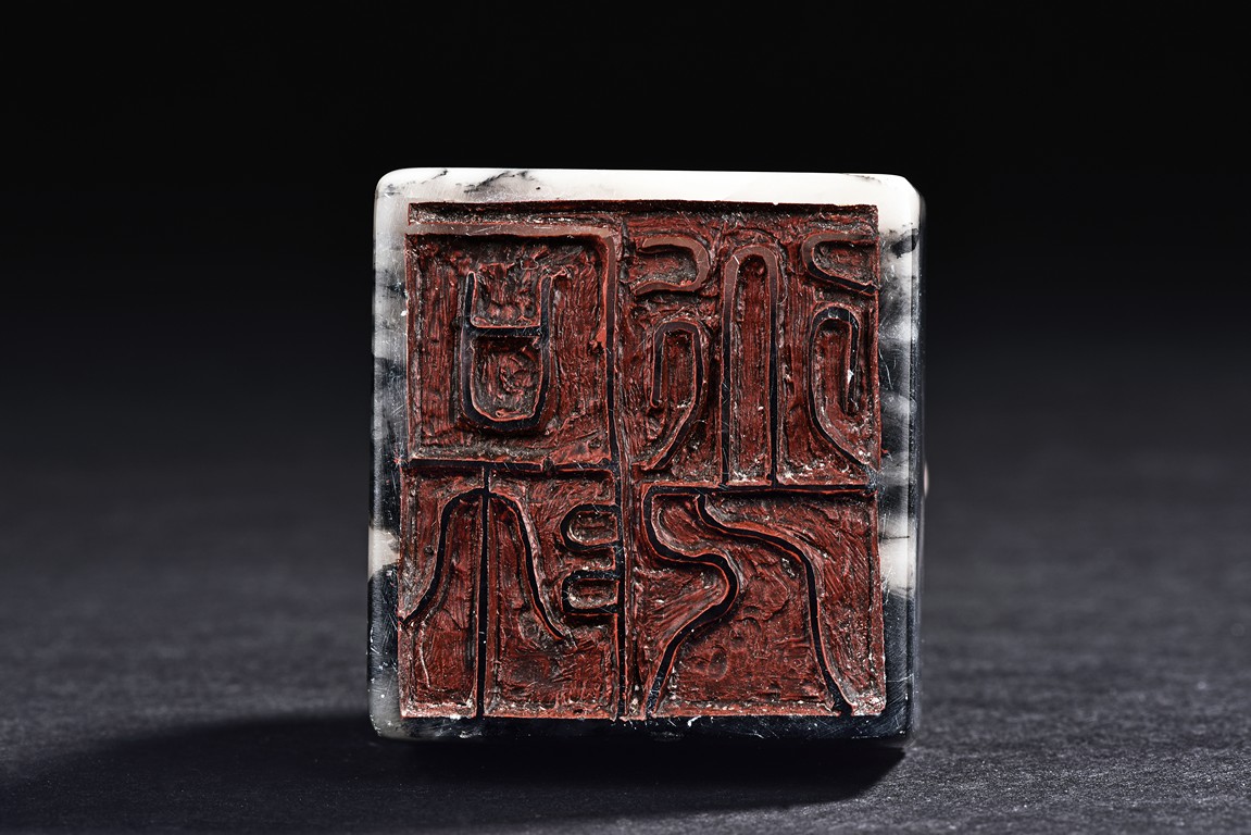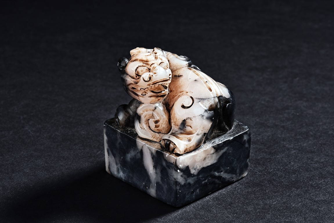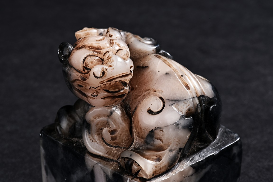 The seal is surmounted with a buddhist lion, shown with ferocious expression and its head turning back; one side of the seal carved with four characters; the stone is of mottled black and russet tone.