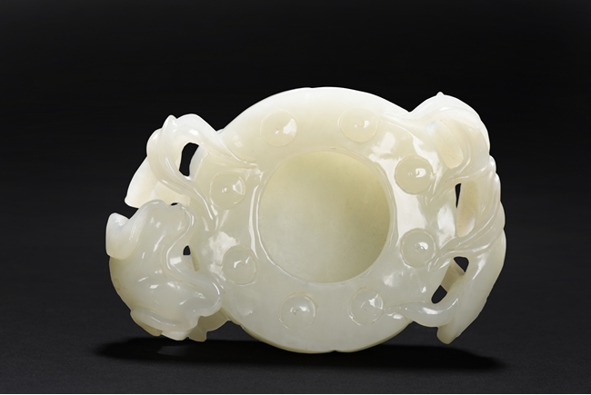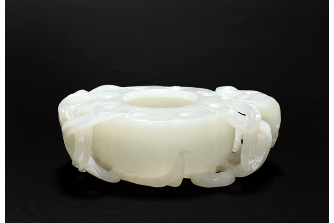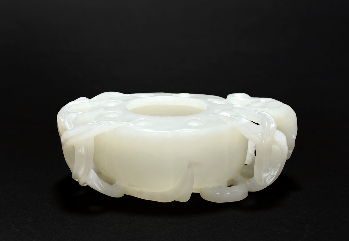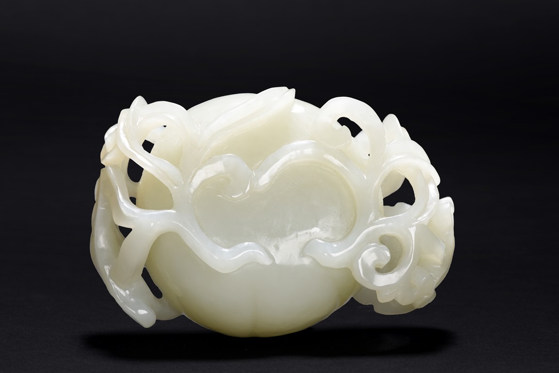 Carved in the round as a lotus pod with delicate lotus flowers and curly leaves on the sides issuing from the base. The stone is of softly polished even white tone. Qing Dynasty period