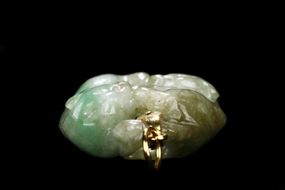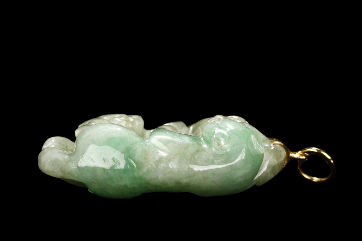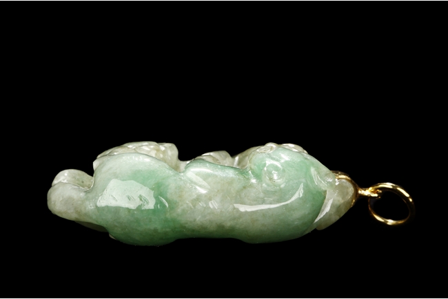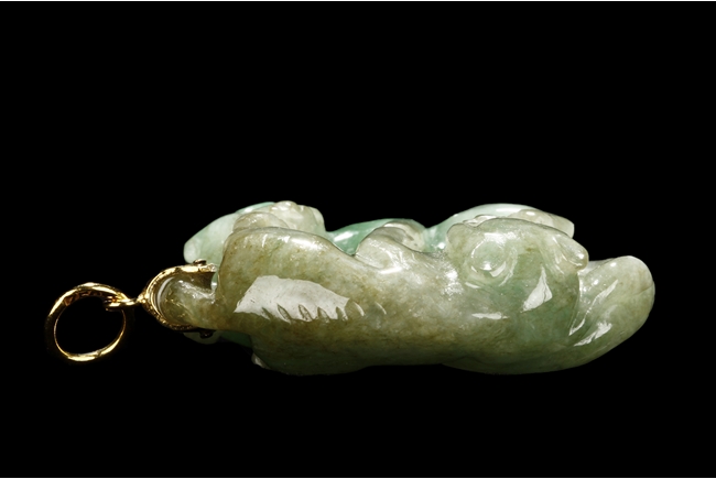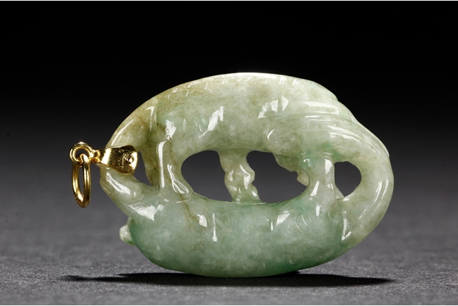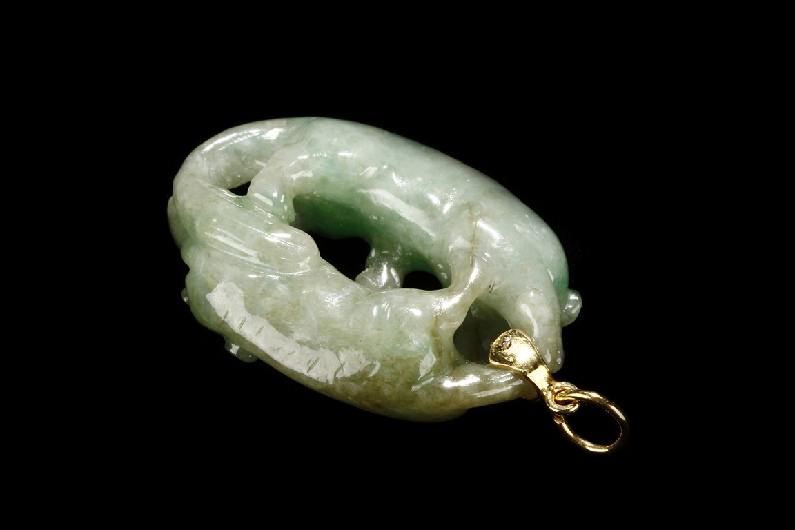 The jadeite pendant is carved with two Buddhist lions playing with each other. The stone is of mottled greenish-white tone with russet inclusions.