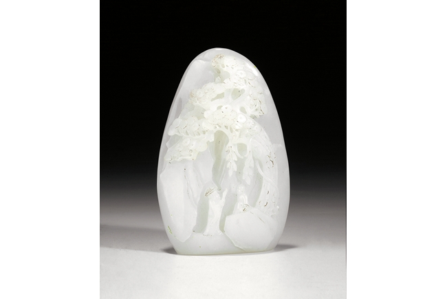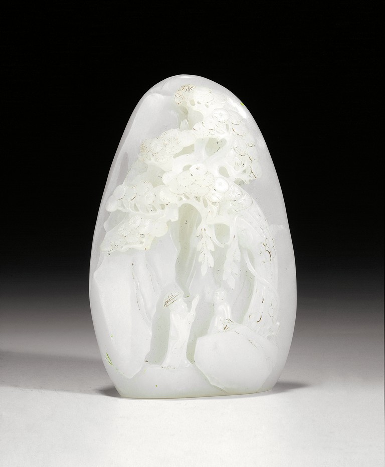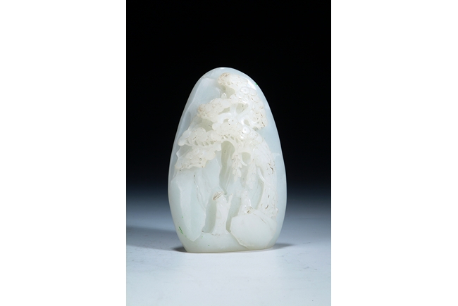 This white jade boulder was carved with two figures conversing beneath a pine tree in the mountainous setting. The boulder also was carved with colophon of twenty Chinese characters on the back.