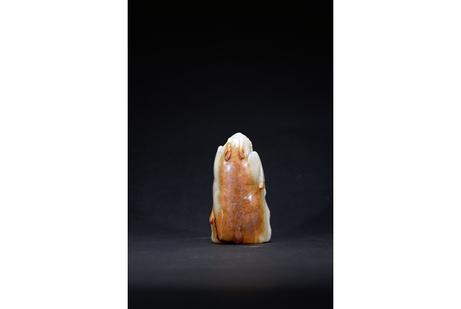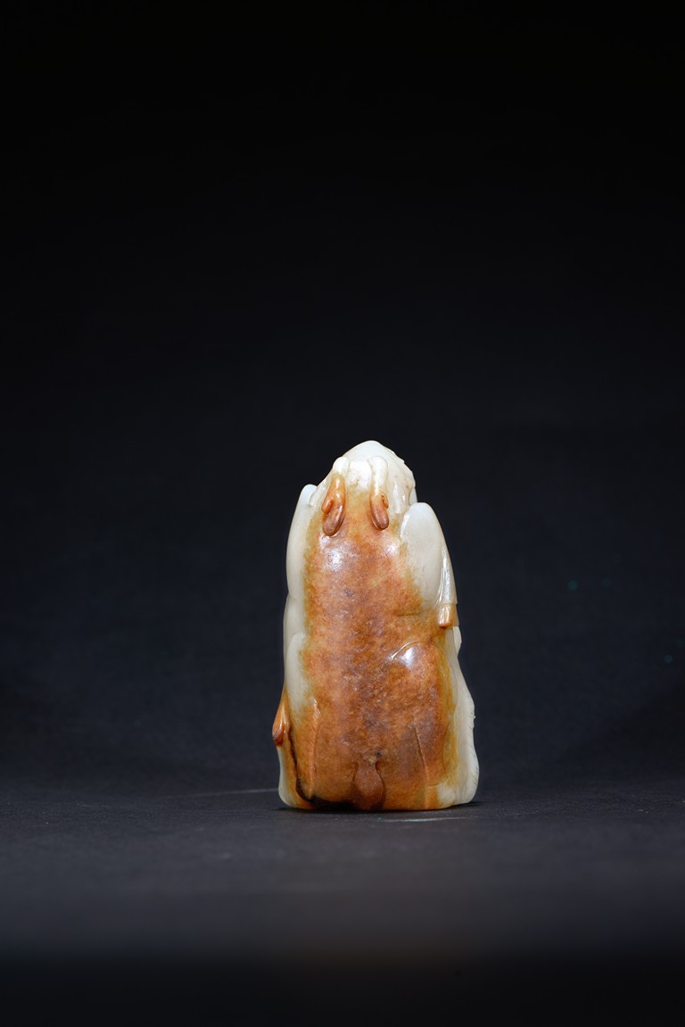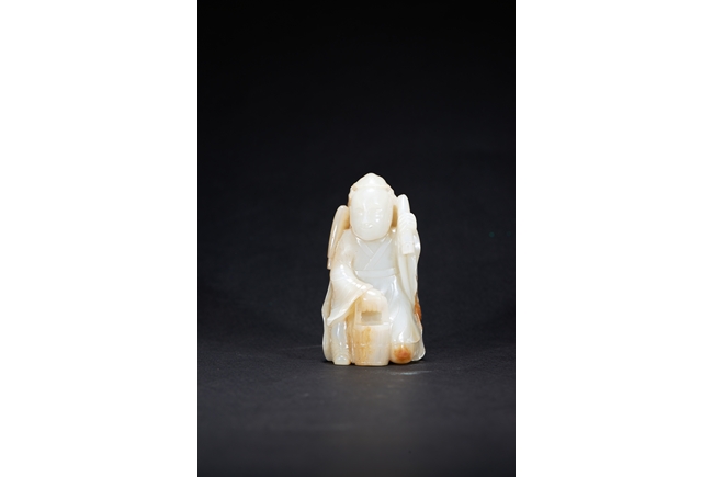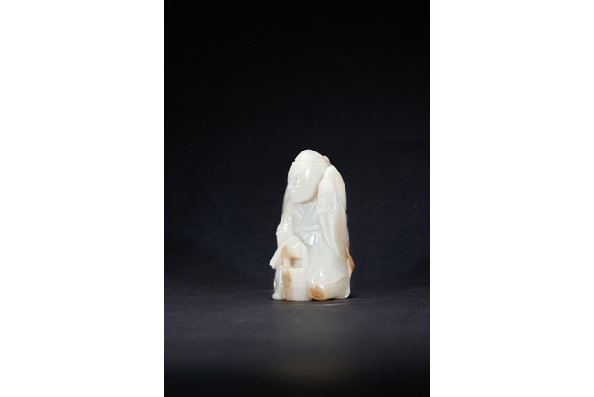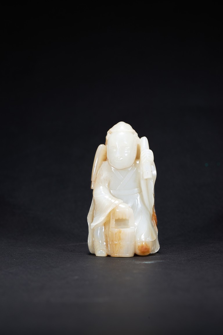 Modelled as a standing figure holding a bucket on right hand, wearing long robe, the face with smiling expression, the stone is of even white tone with skin on the back. Qing Dynasty period.