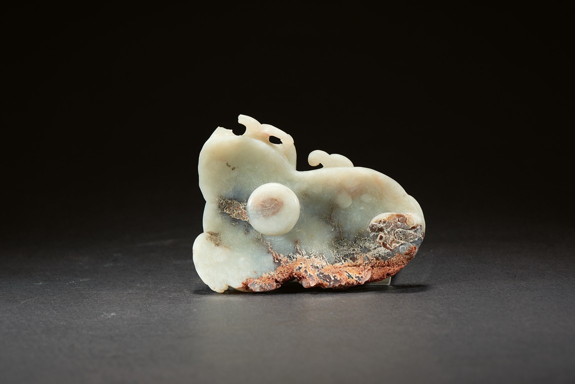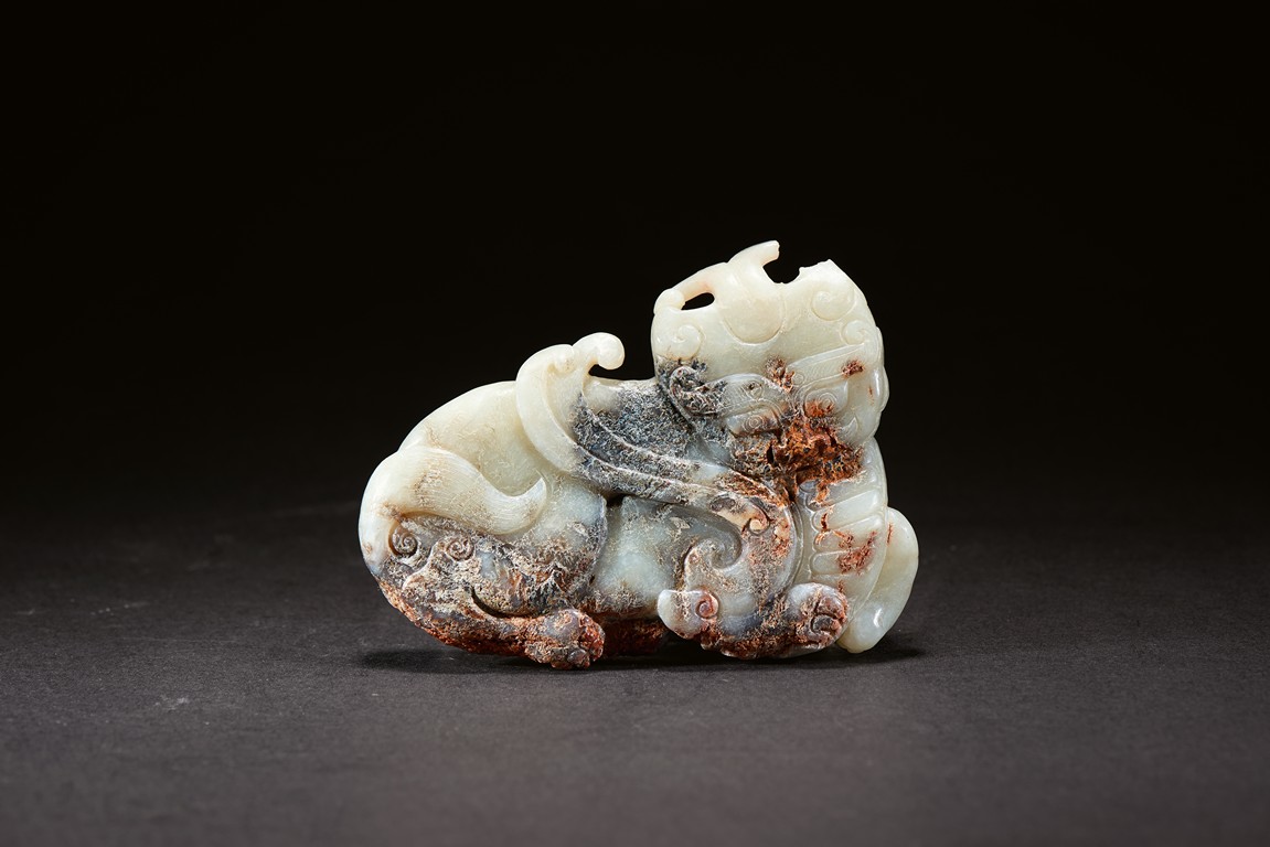 Carved in the form of mythical beast with head turned to the side, in recumbent position, with bulging eyes and powerful nose, tail and mane with incised design. The stone is of white tone and extensive russet and black inclusions. Ming Dynasty period.