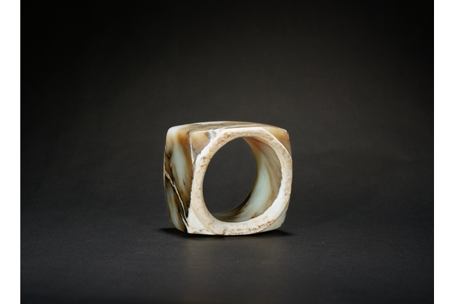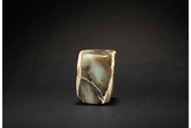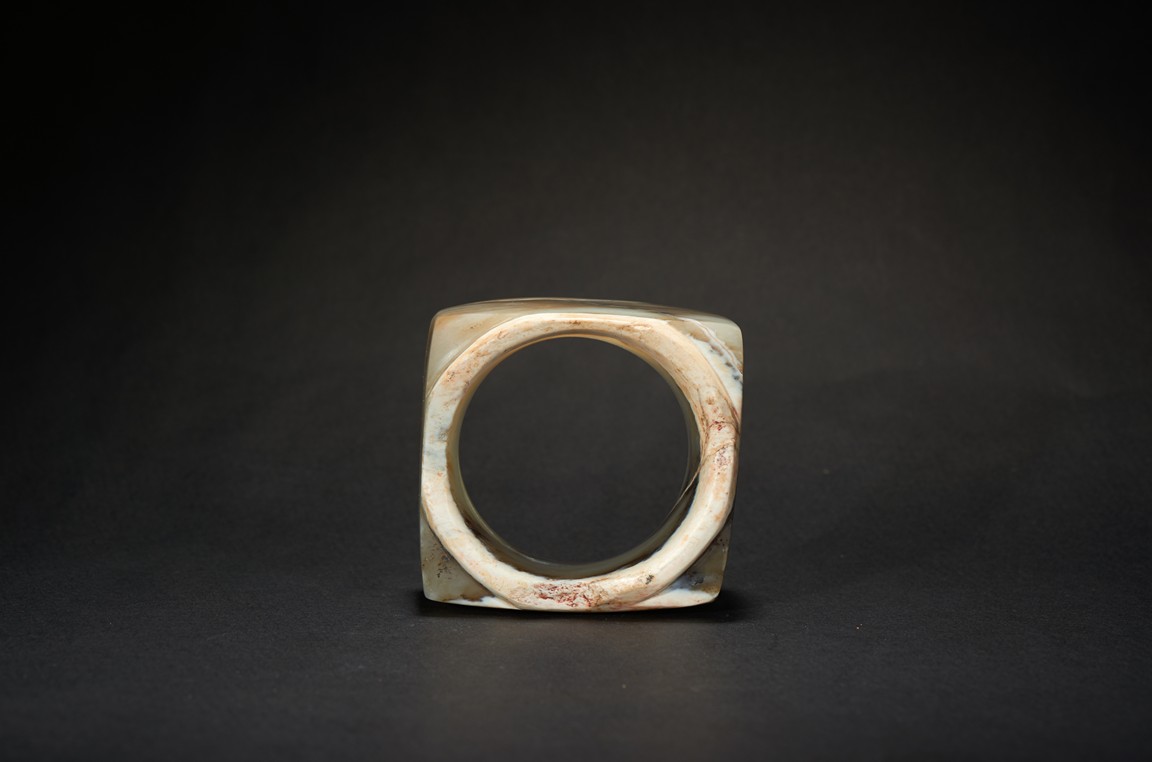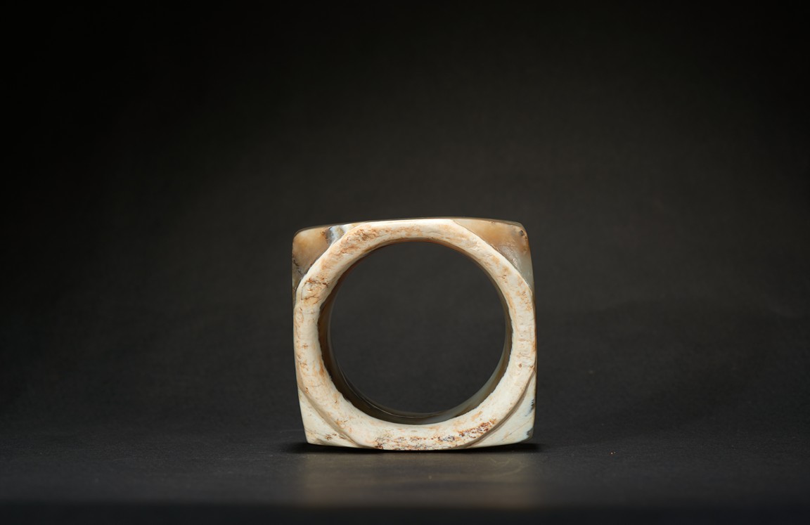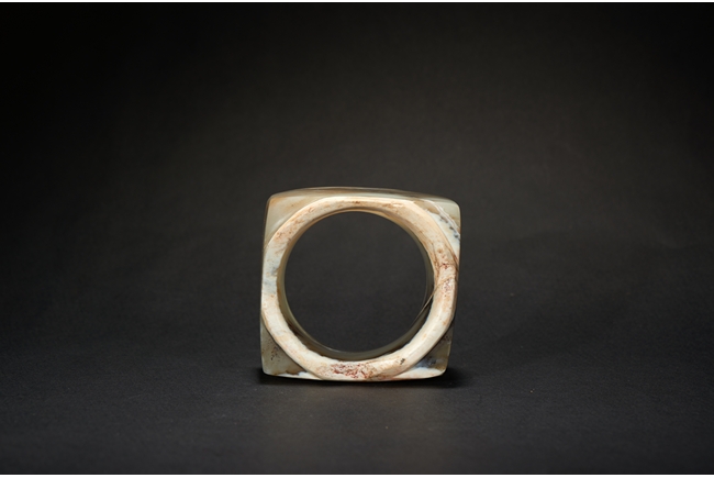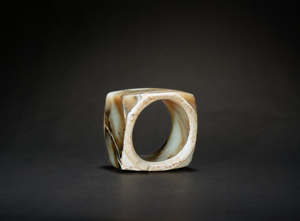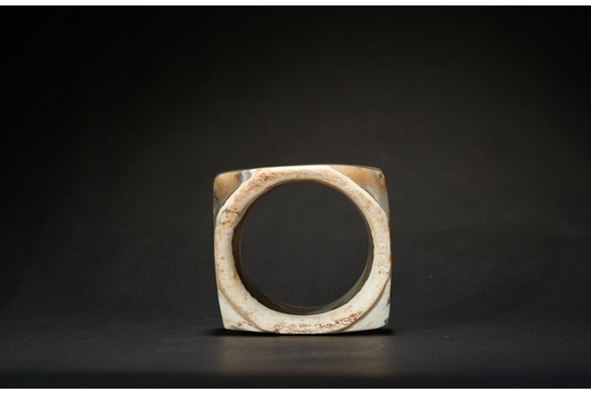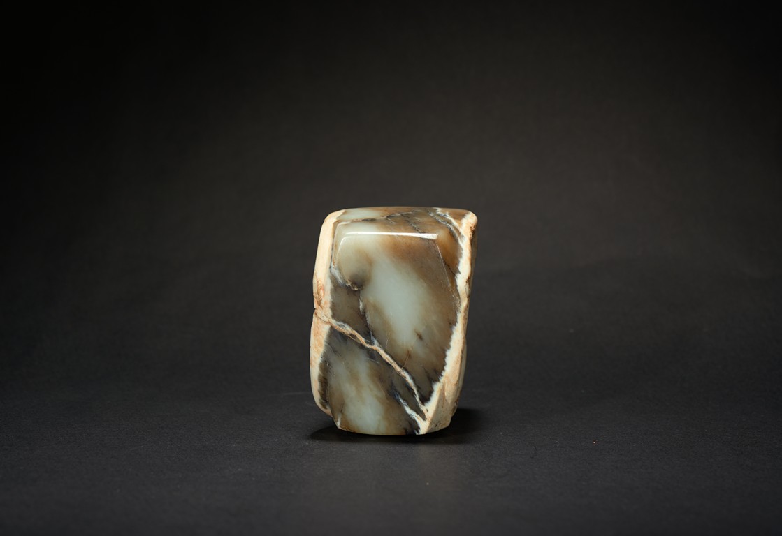 The short ritual cong is of cylindrical rim and square sectioned body, with mottled russet and celadon tone. Liangzhu Culture.