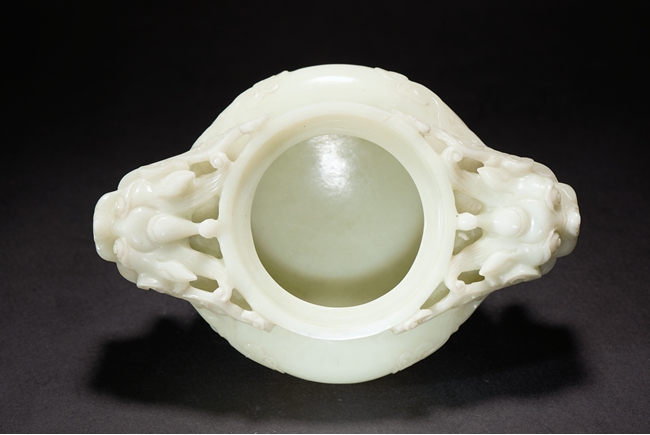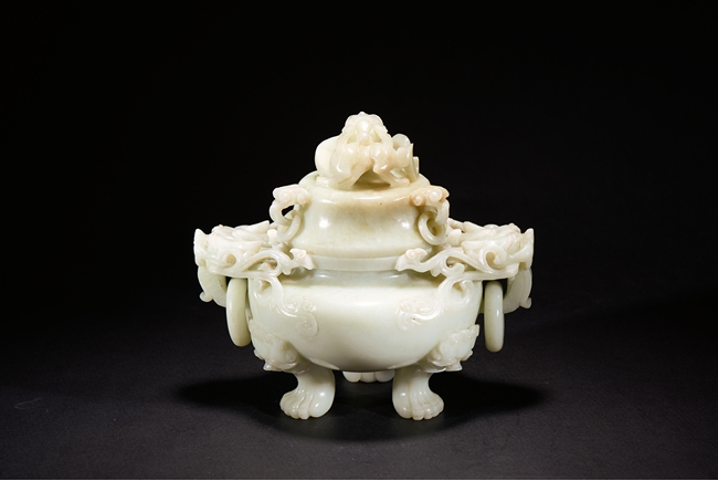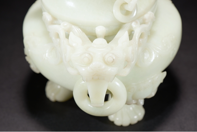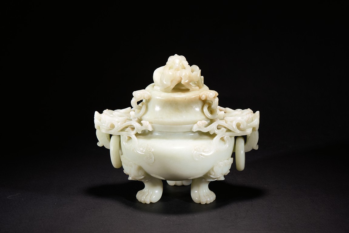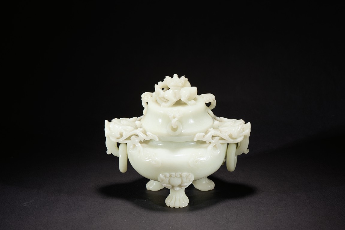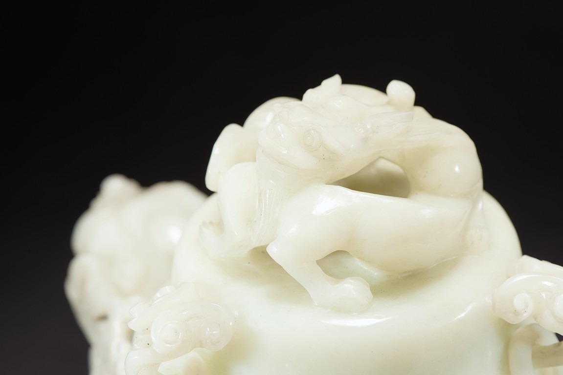 Supported on three beast feet, the body is of compressed globular form, flanked by two dragon heads suspended with loose ring, the cover further surmounted with a sinuous chilong. Qing Dynasty period.